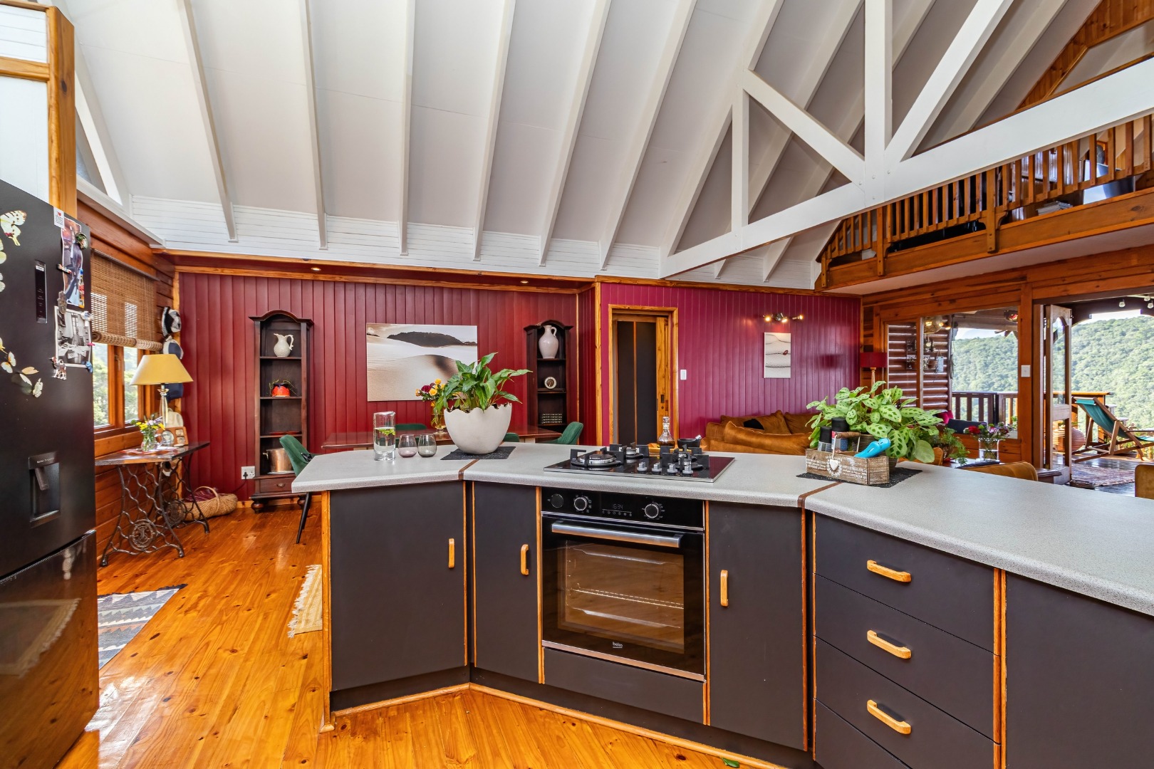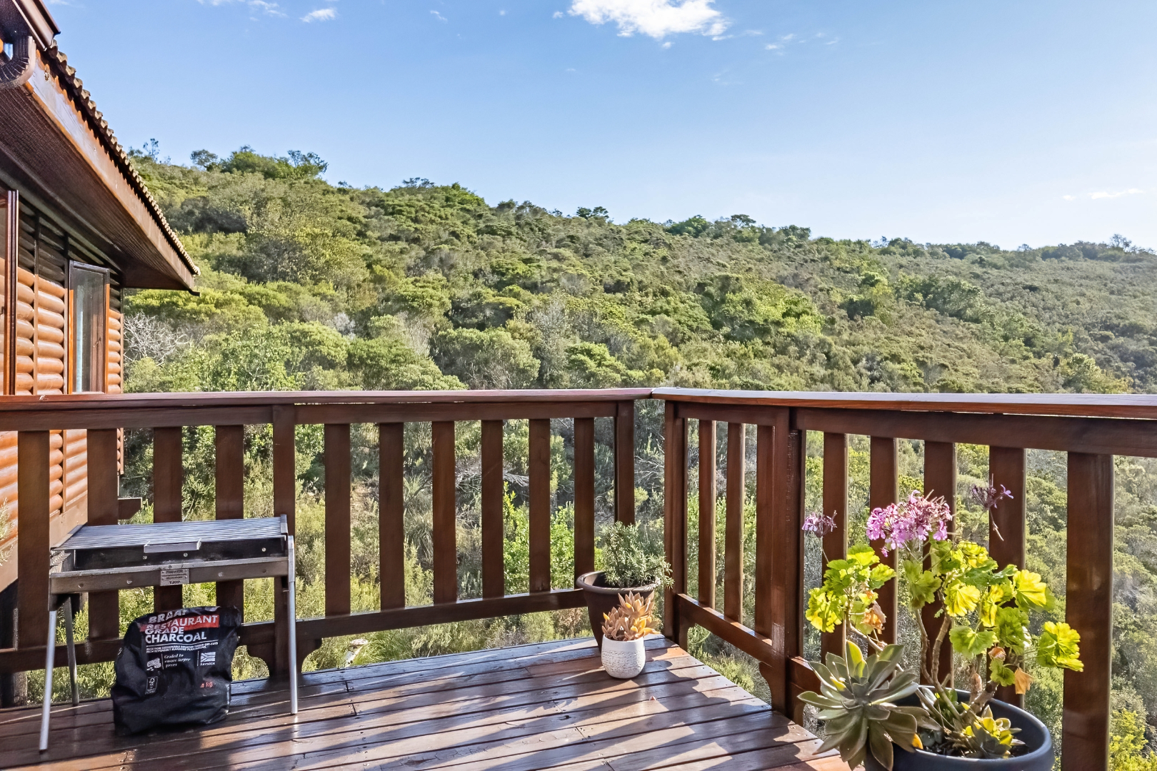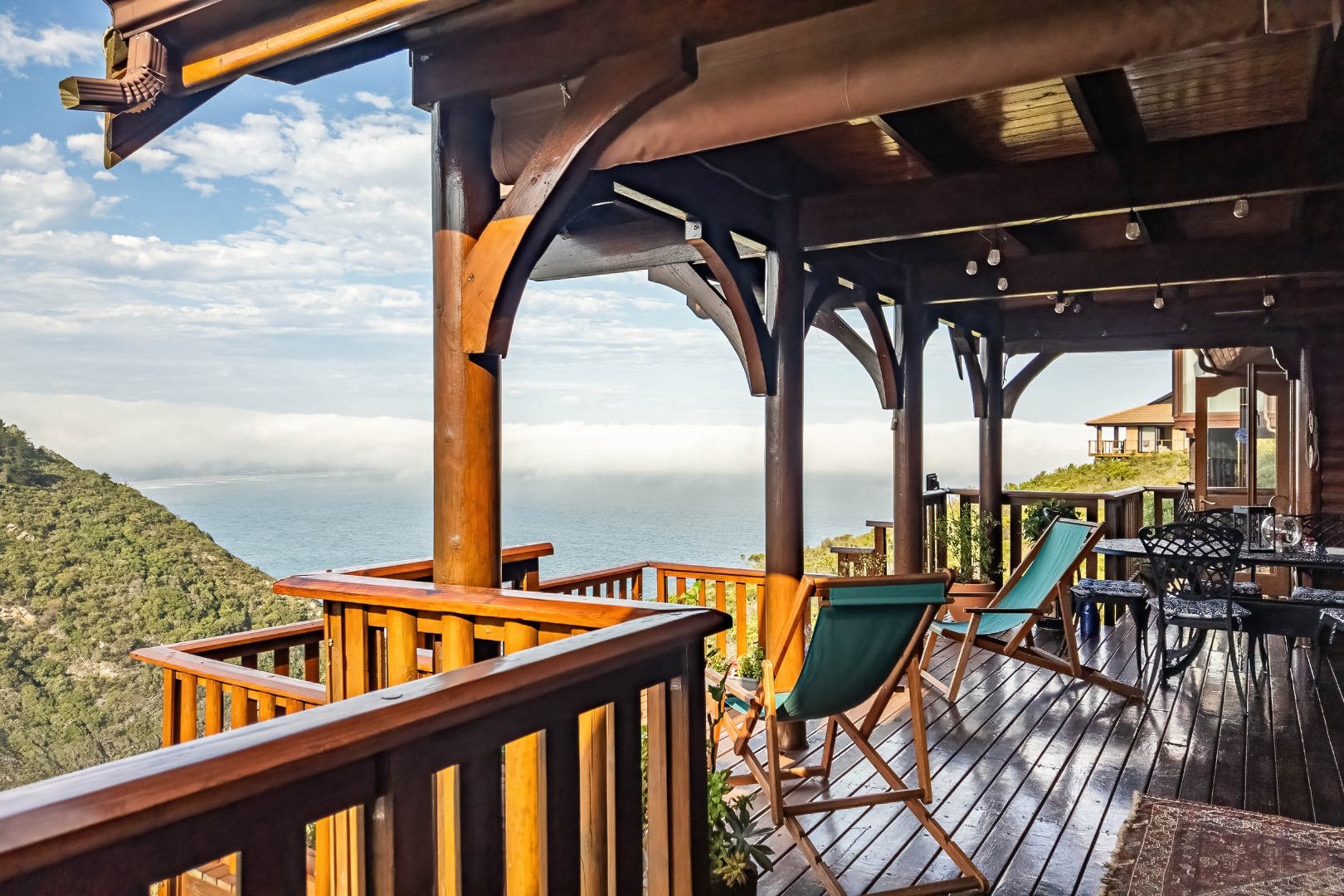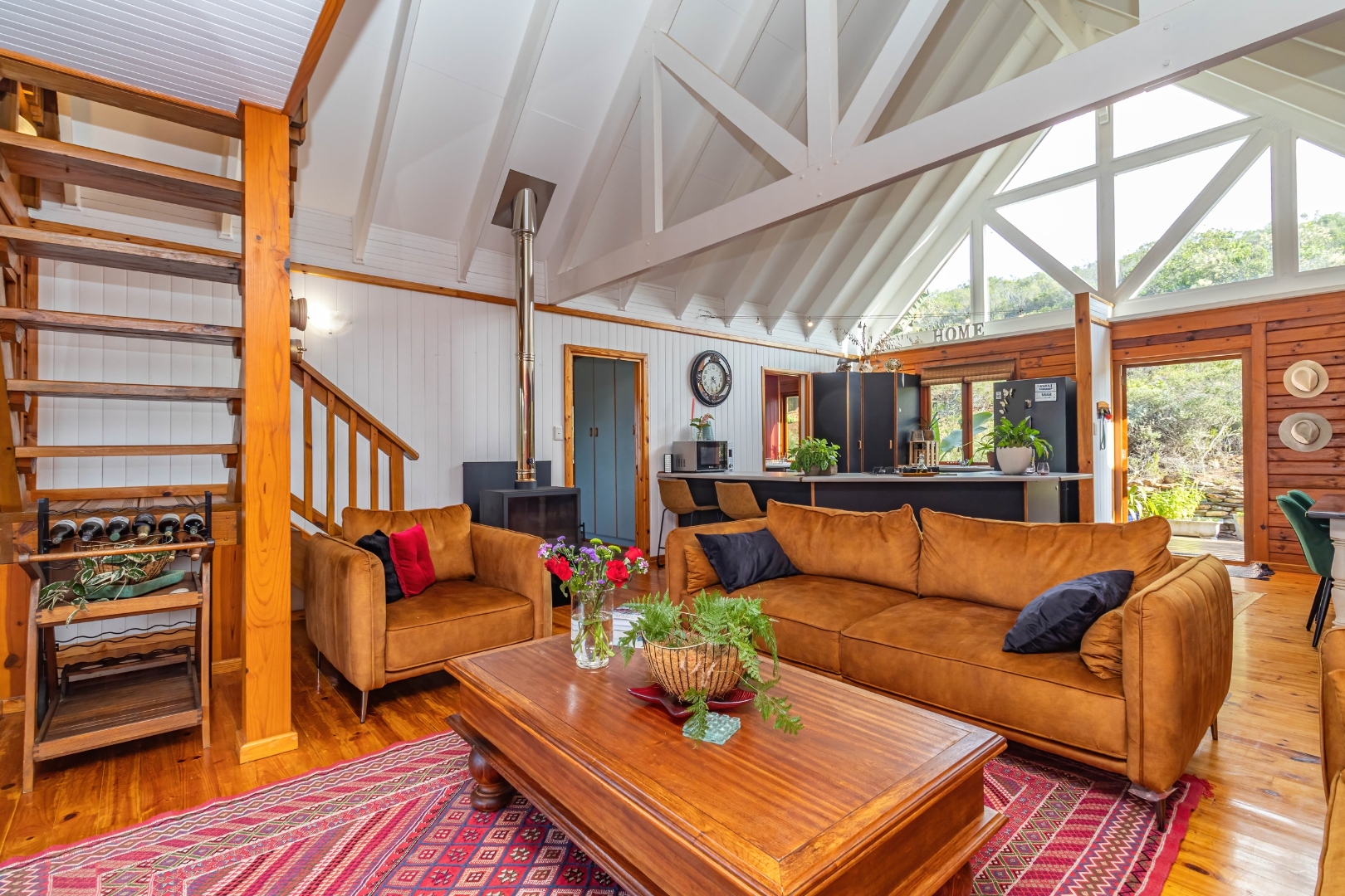 This neat, character-filled 3-bedroom Timber & Brick Log home (178m² under roof) plus a matching 49m² tiled carport offers the perfect blend of rustic charm and modern comfort. Step inside the spacious open-plan living area with soaring vaulted ceilings: a functional kitchen with breakfast counter flows seamlessly into the dining space and lounge, complete with a cosy fireplace. Glass doors open onto a generous deck where you can soak up the magnificent panoramic views of the Wilderness coastline, the sparkling sea, majestic mountains, and the Muel River cascading through the gorge into the bay below.