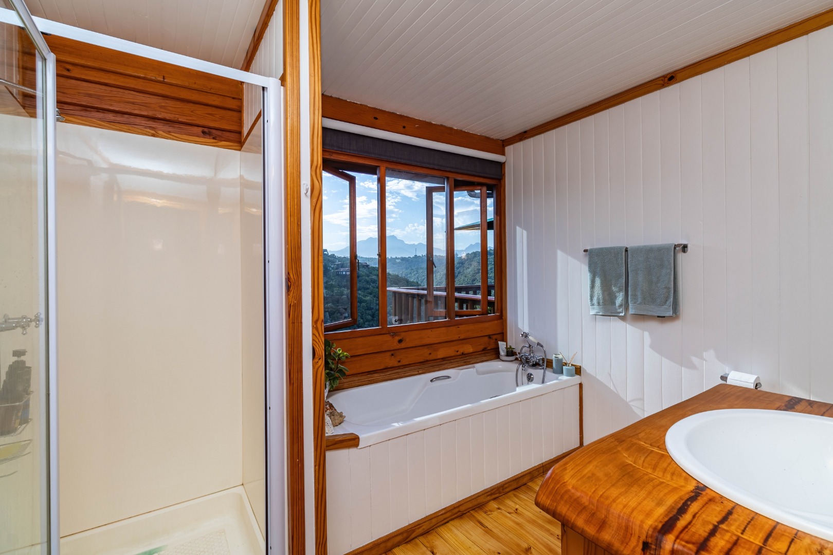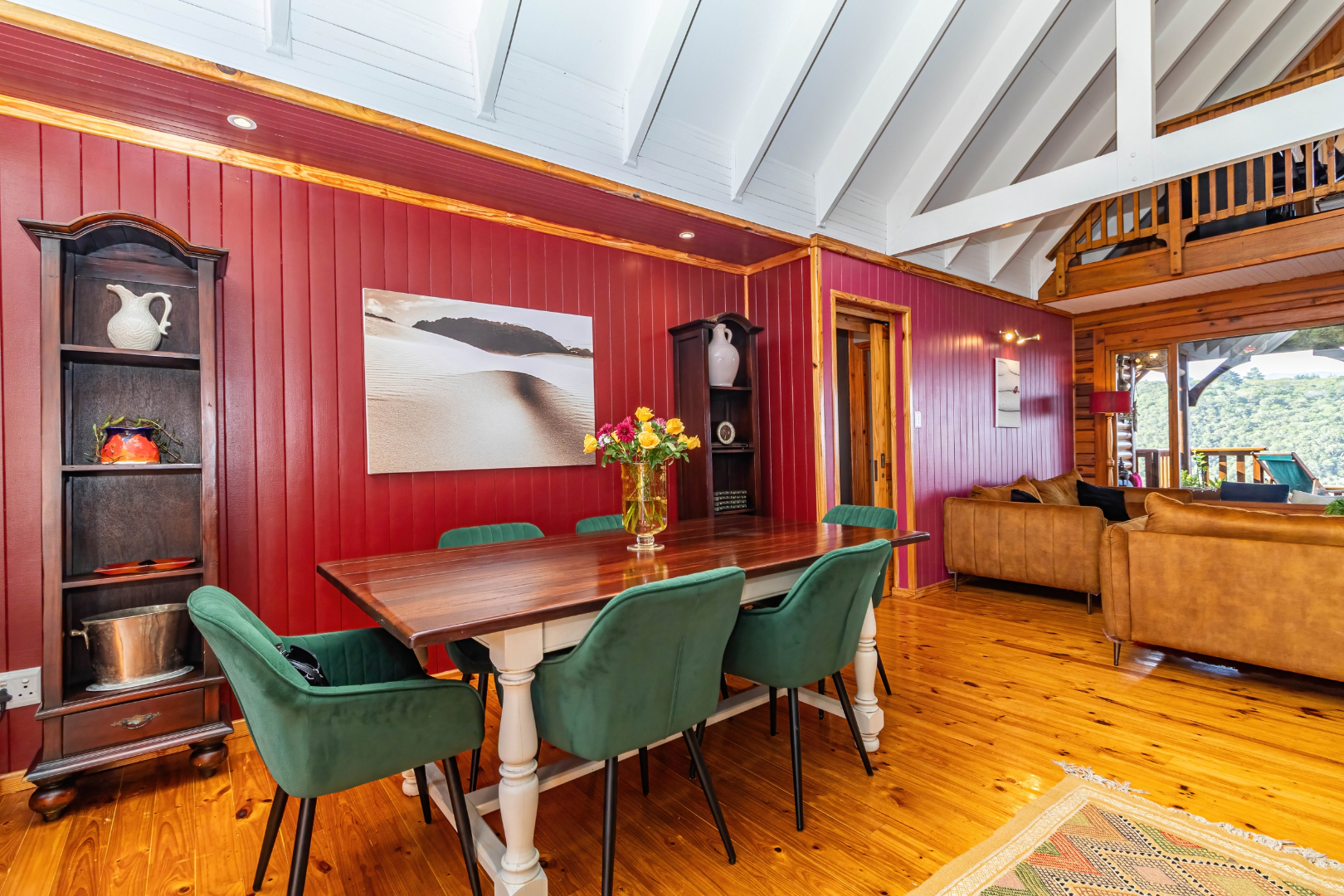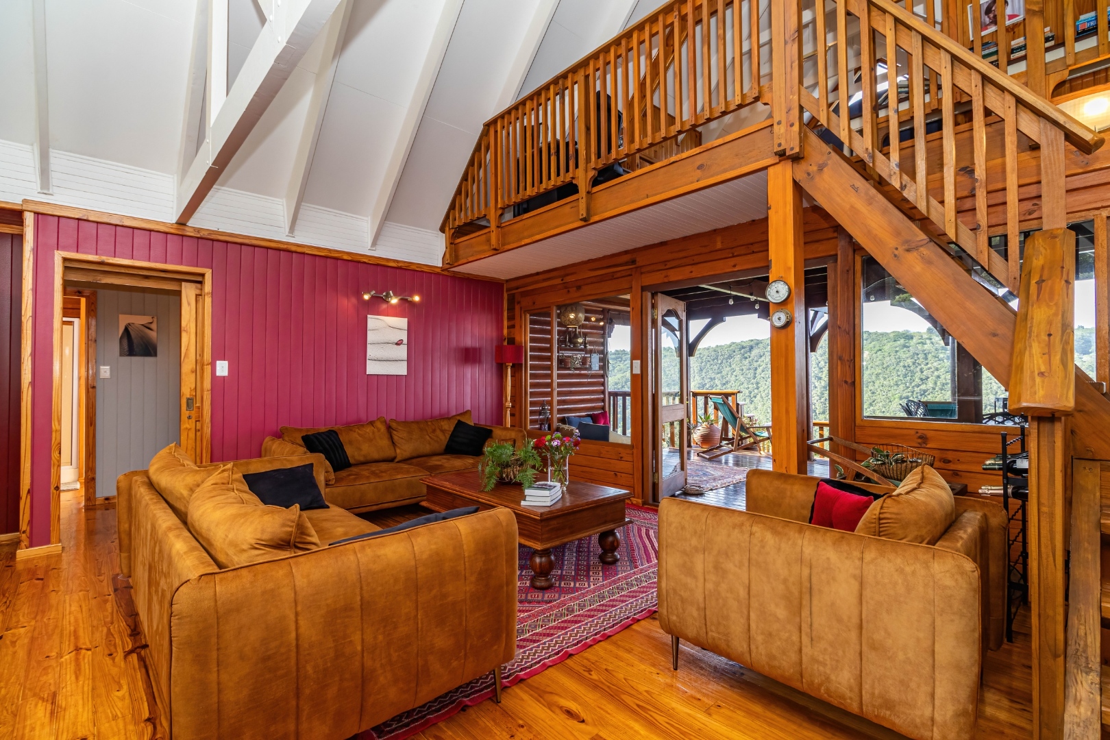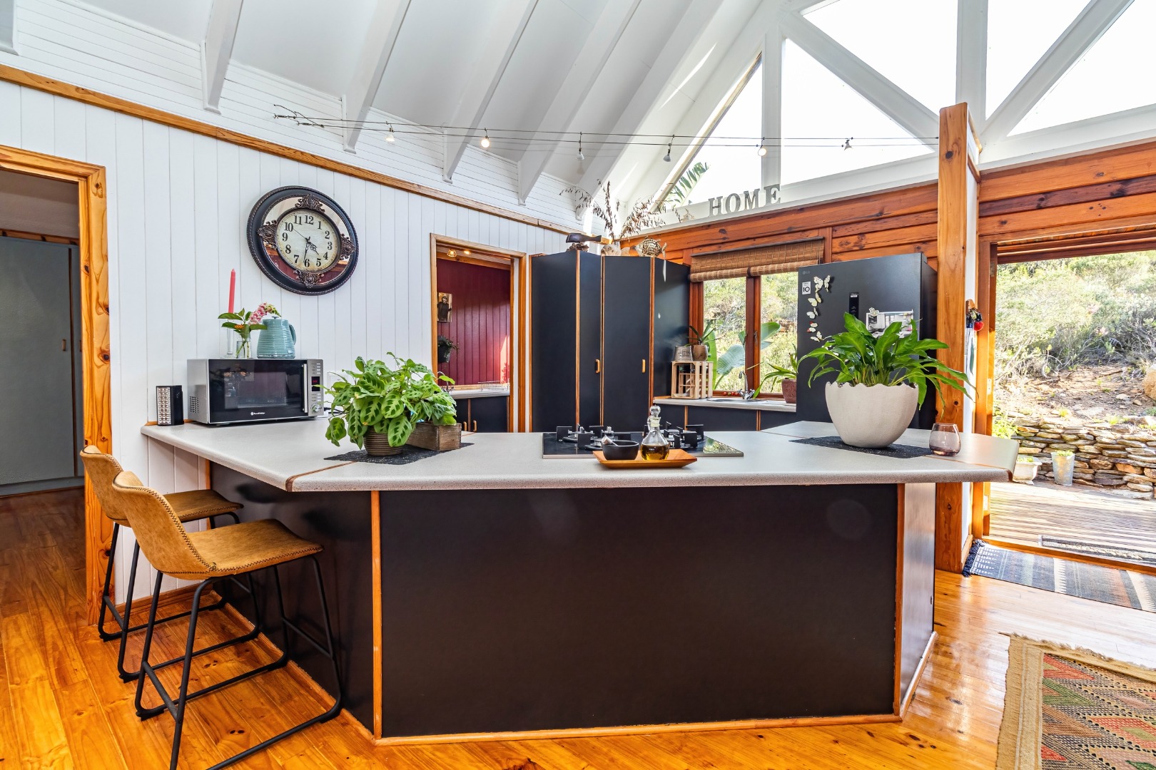 This neat, character-filled 3-bedroom Timber & Brick Log home (178m² under roof) plus a matching 49m² tiled carport offers the perfect blend of rustic charm and modern comfort. Step inside the spacious open-plan living area with soaring vaulted ceilings: a functional kitchen with breakfast counter flows seamlessly into the dining space and lounge, complete with a cosy fireplace. Glass doors open onto a generous deck where you can soak up the magnificent panoramic views of the Wilderness coastline, the sparkling sea, majestic mountains, and the Muel River cascading through the gorge into the bay below.