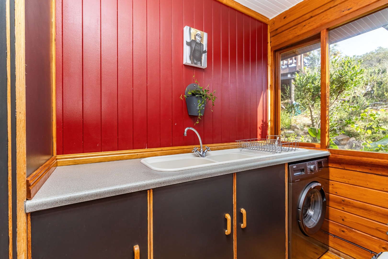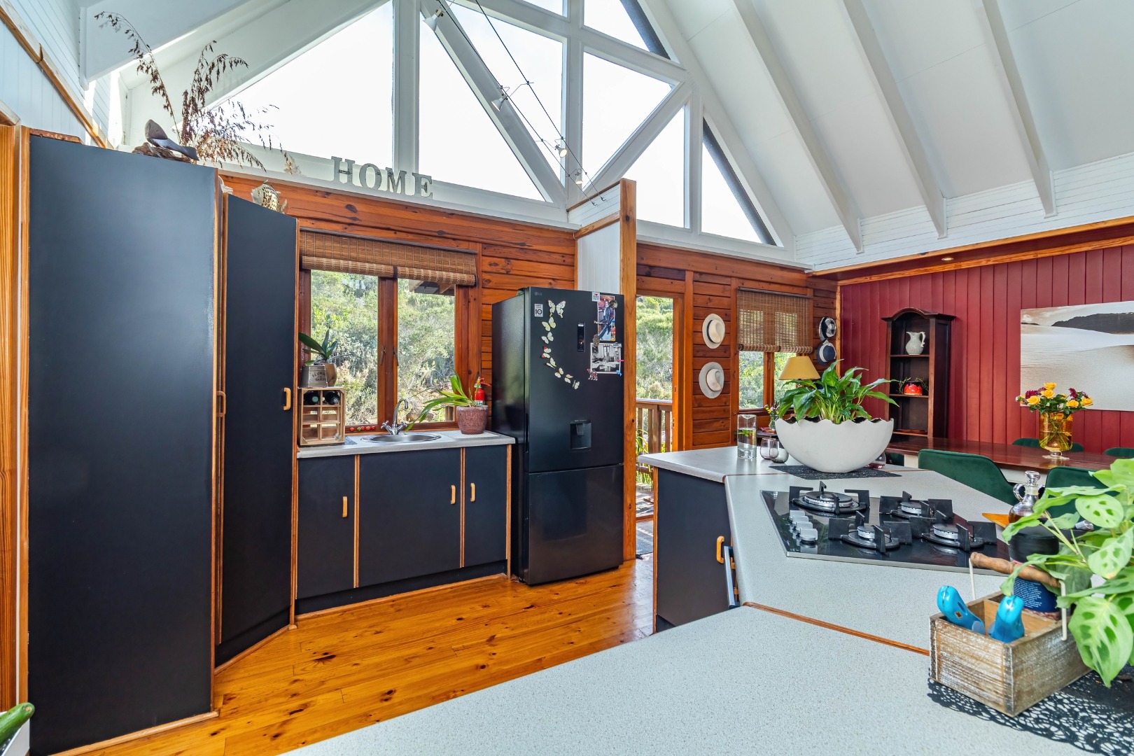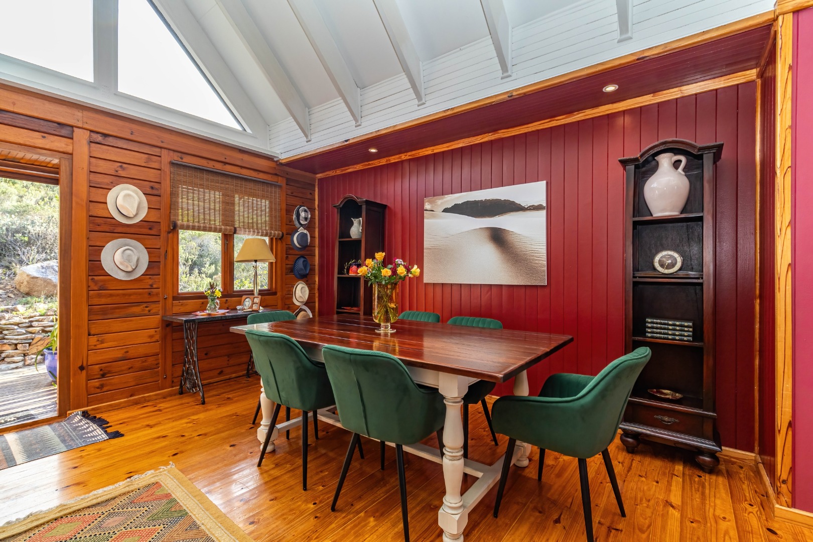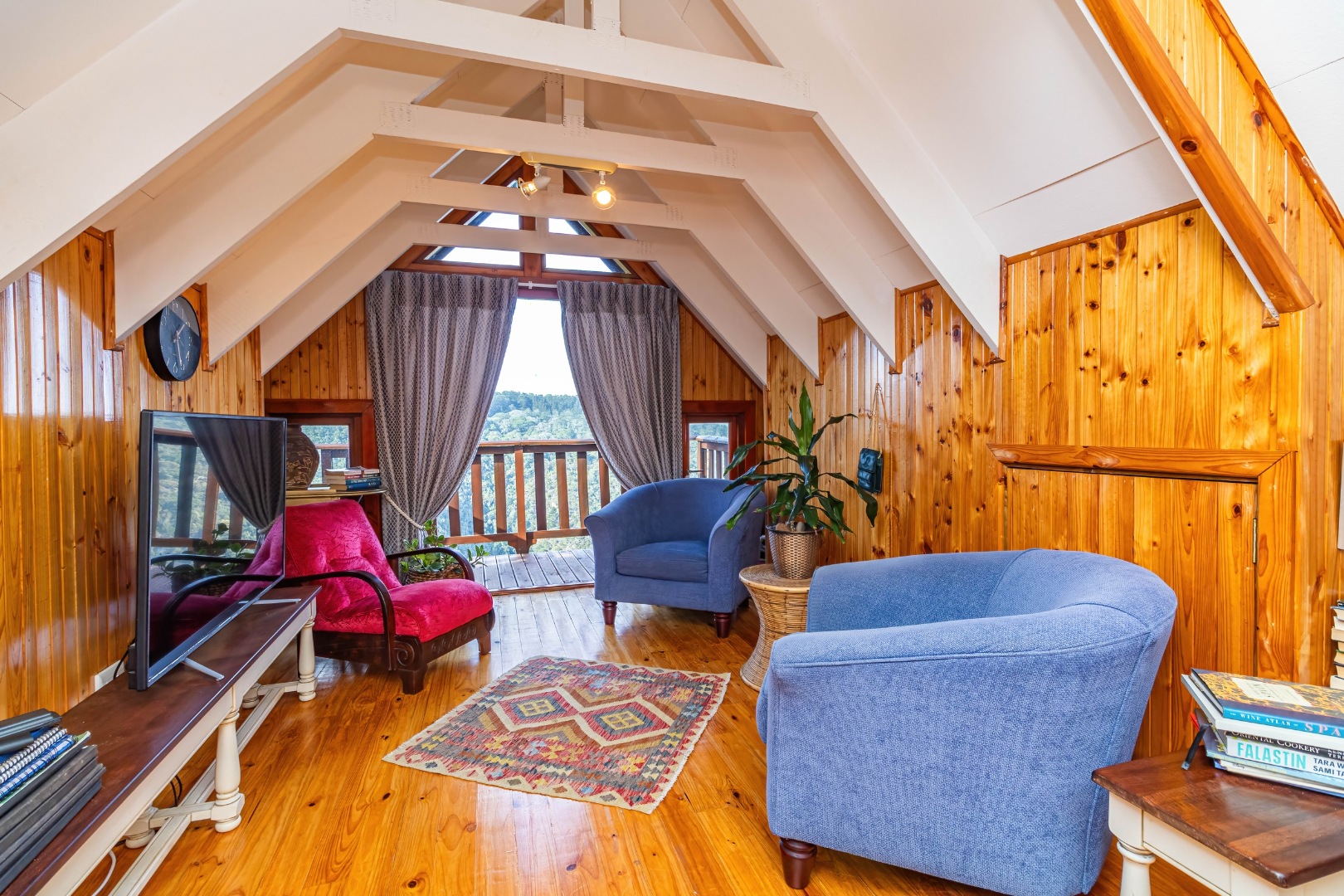 This neat, character-filled 3-bedroom Timber & Brick Log home (178m² under roof) plus a matching 49m² tiled carport offers the perfect blend of rustic charm and modern comfort. Step inside the spacious open-plan living area with soaring vaulted ceilings: a functional kitchen with breakfast counter flows seamlessly into the dining space and lounge, complete with a cosy fireplace. Glass doors open onto a generous deck where you can soak up the magnificent panoramic views of the Wilderness coastline, the sparkling sea, majestic mountains, and the Muel River cascading through the gorge into the bay below.