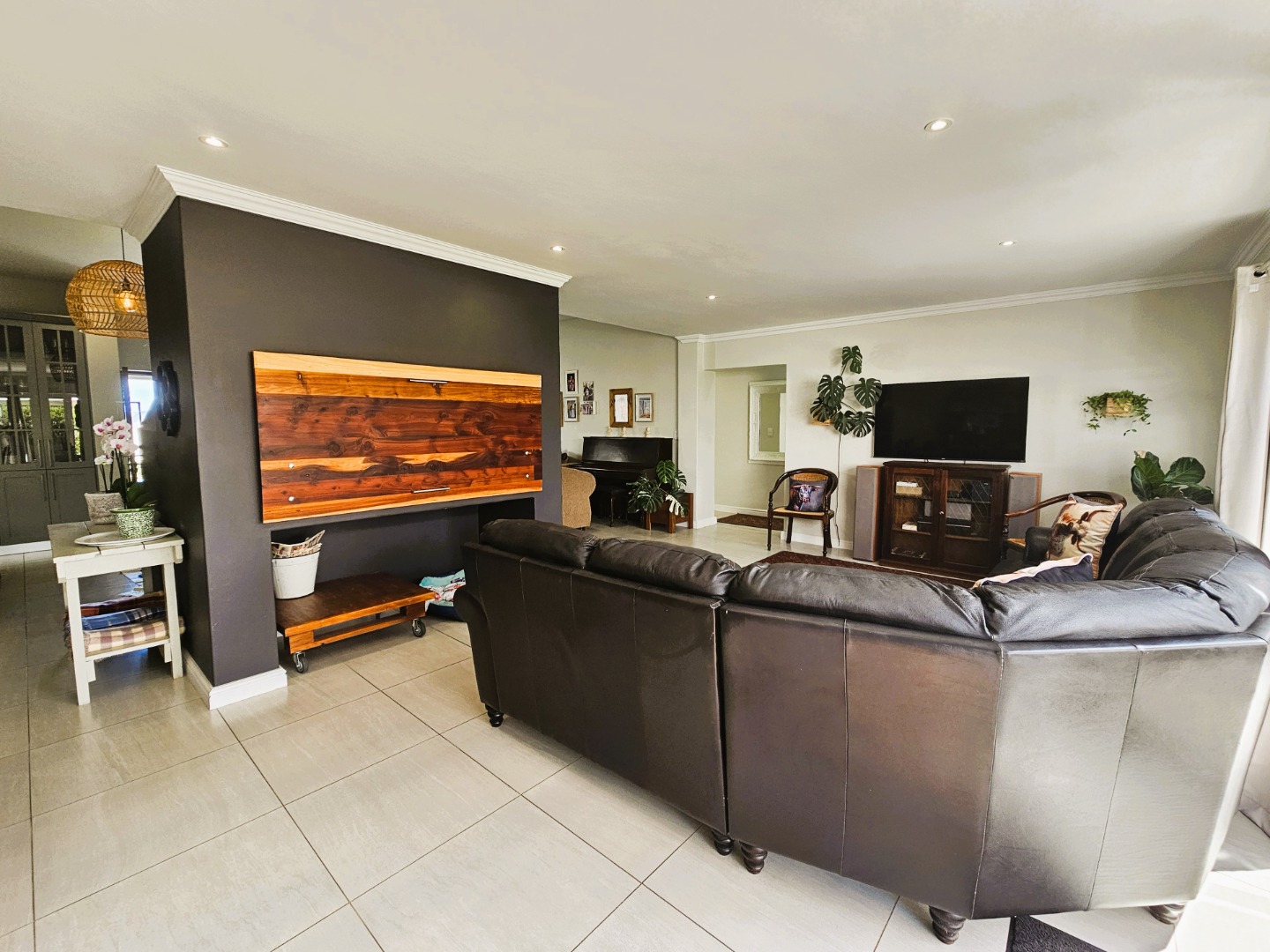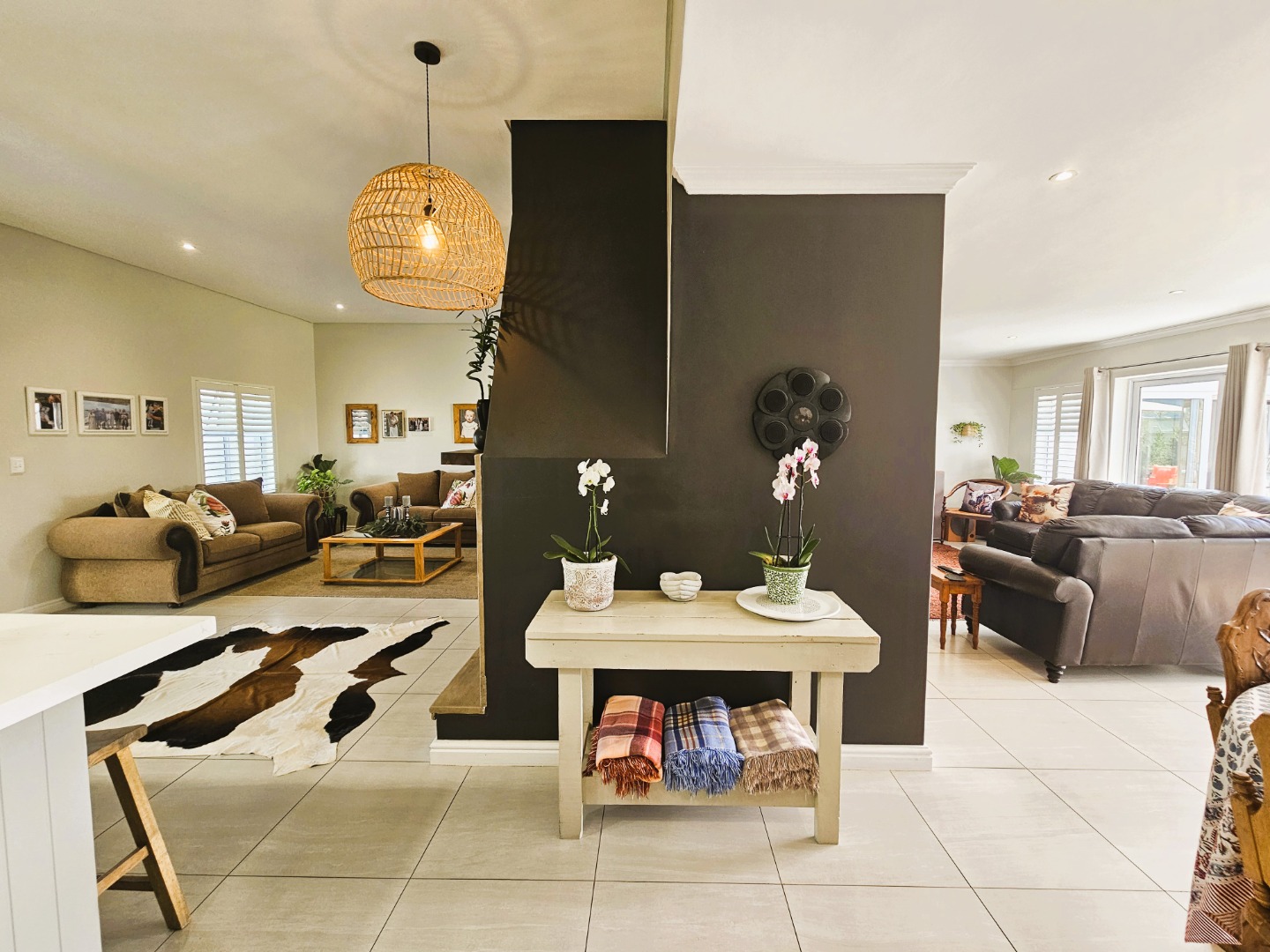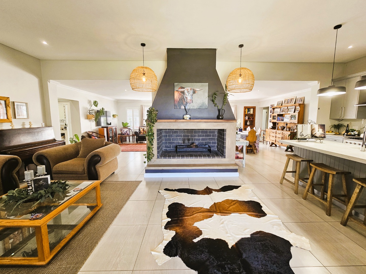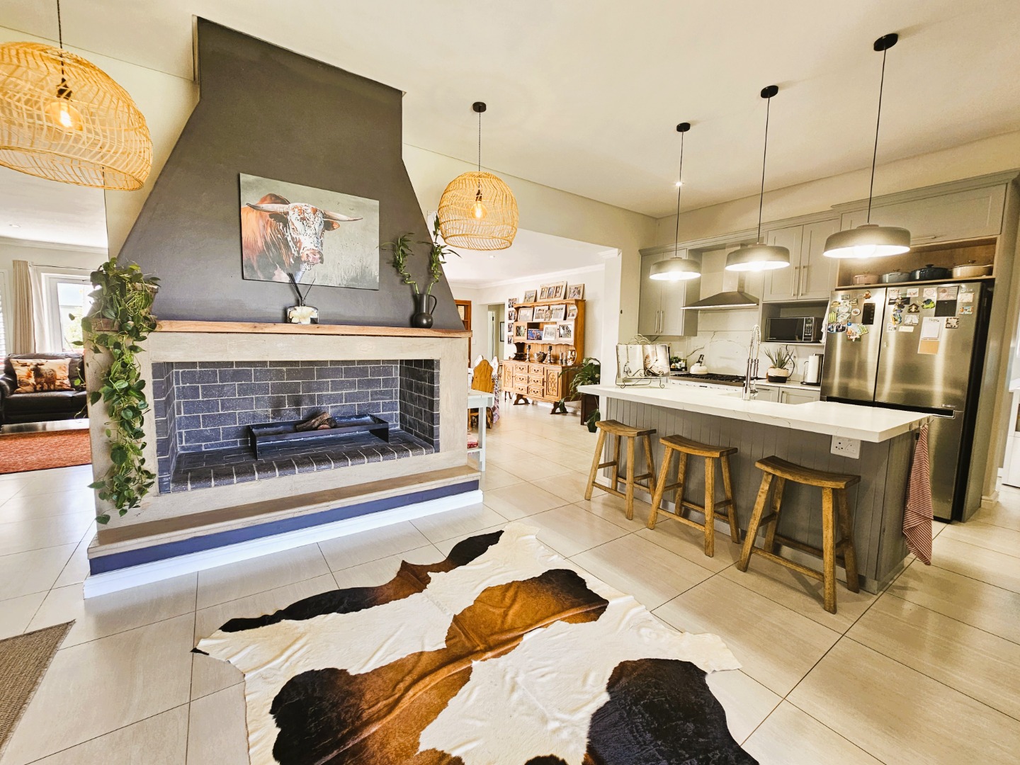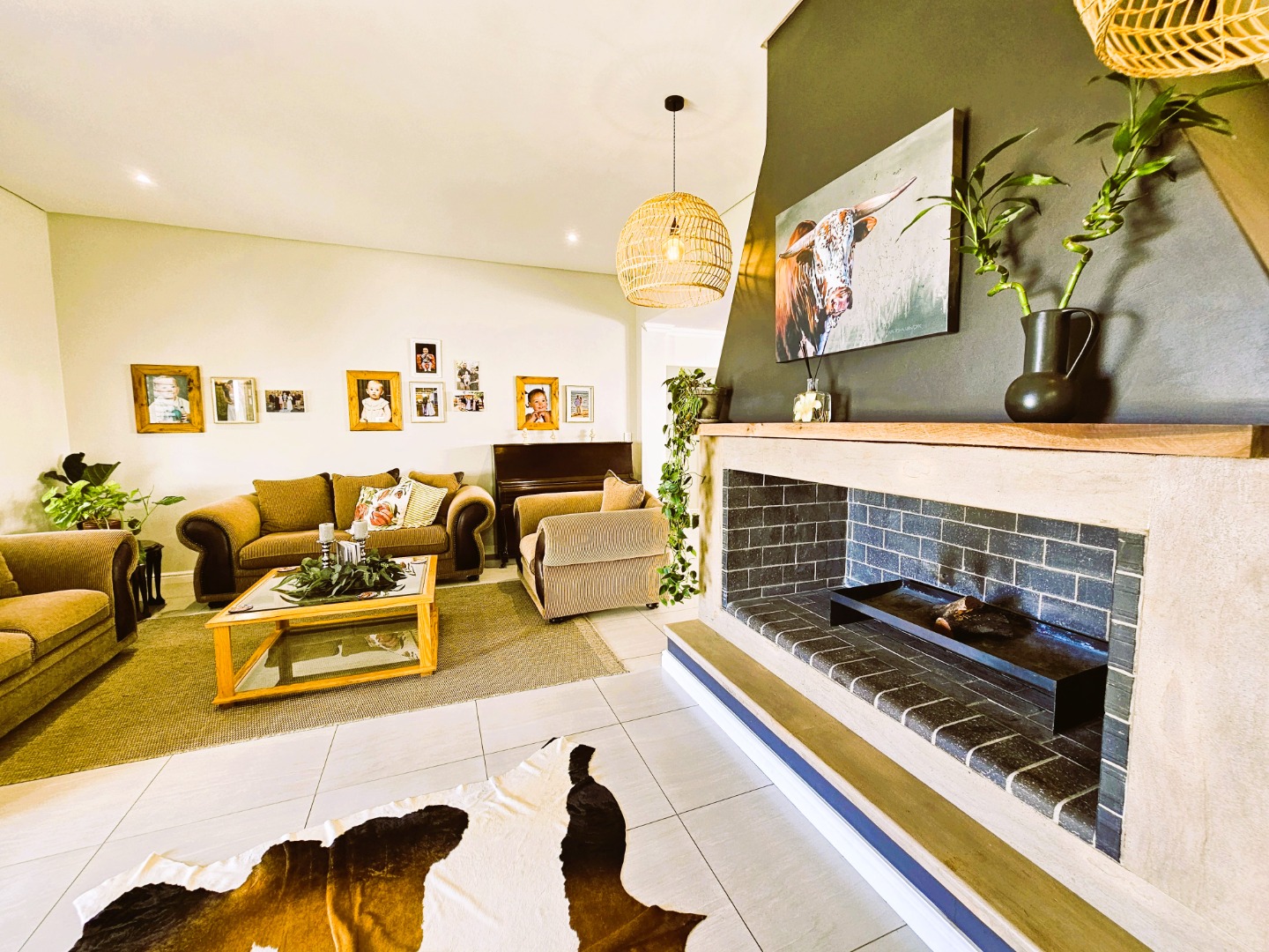 Inside, the home features an open-plan layout that seamlessly connects the living spaces, including two comfortable lounges and a dedicated dining room, ideal for both relaxation and entertaining. The well-appointed kitchen includes a separate pantry, laundry and scullery area, ensuring ample storage. Practical amenities such as a study, guest toilet and additional storage enhance daily convenience. Keep in mind that the study can easily be converted into a 4th bedroom. Enjoy indoor-outdoor living with a built-in braai, a cozy fireplace, and access to a private patio and upper deck, perfect for enjoying the scenic mountain views.
