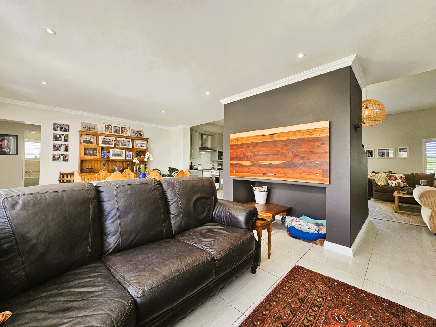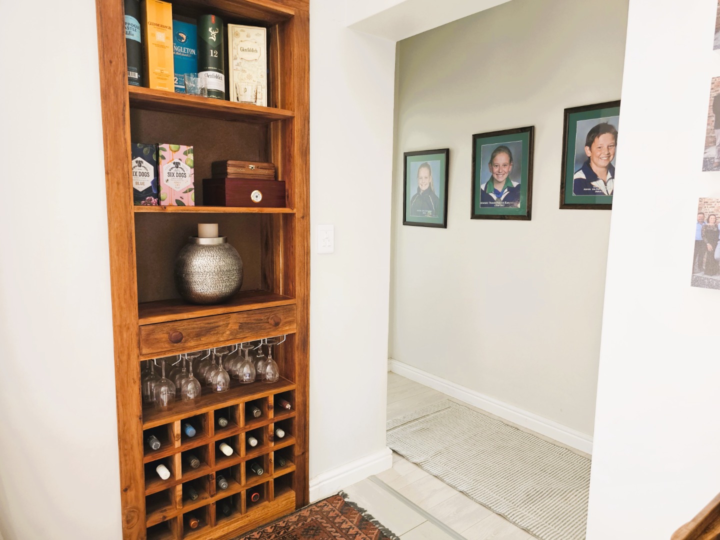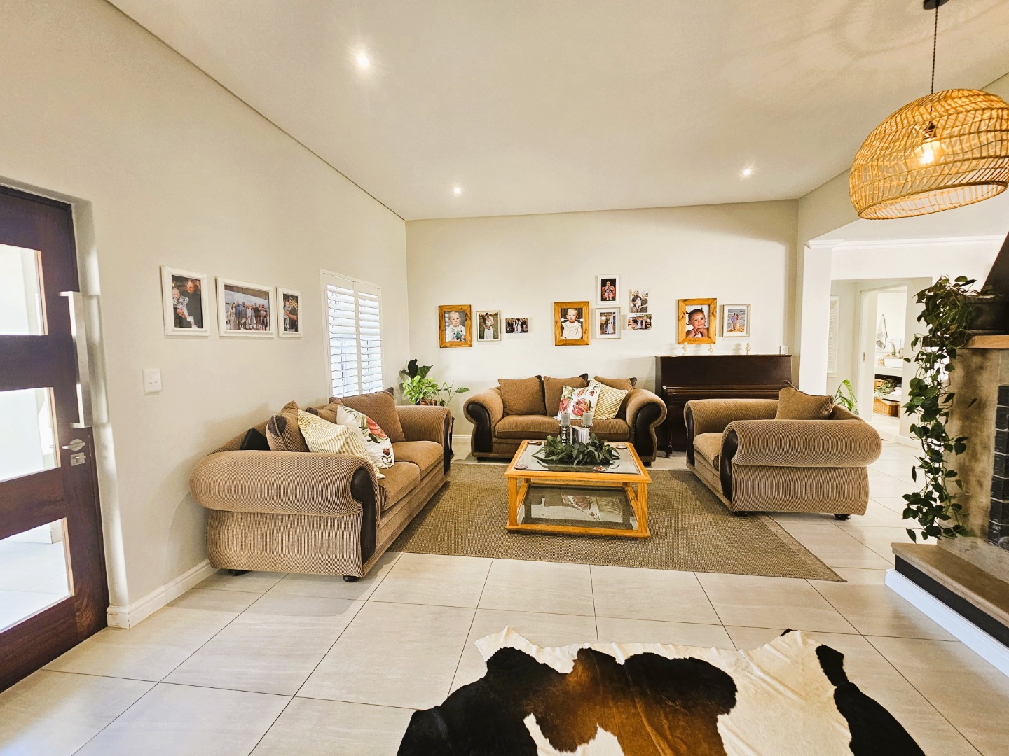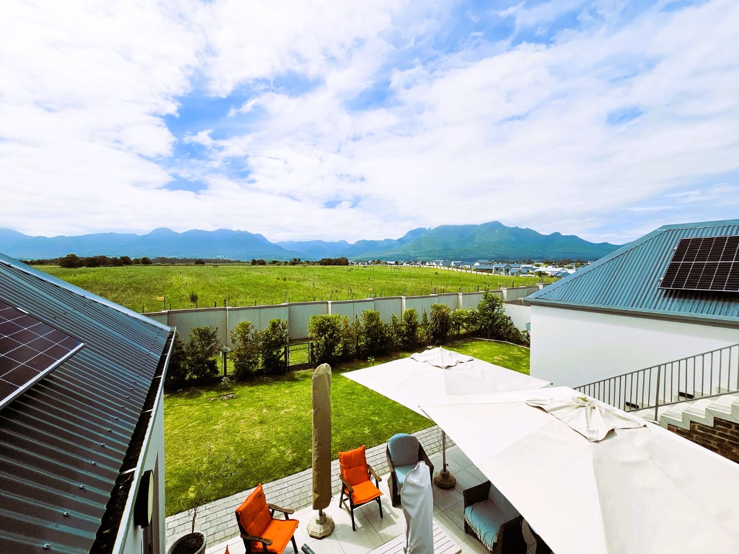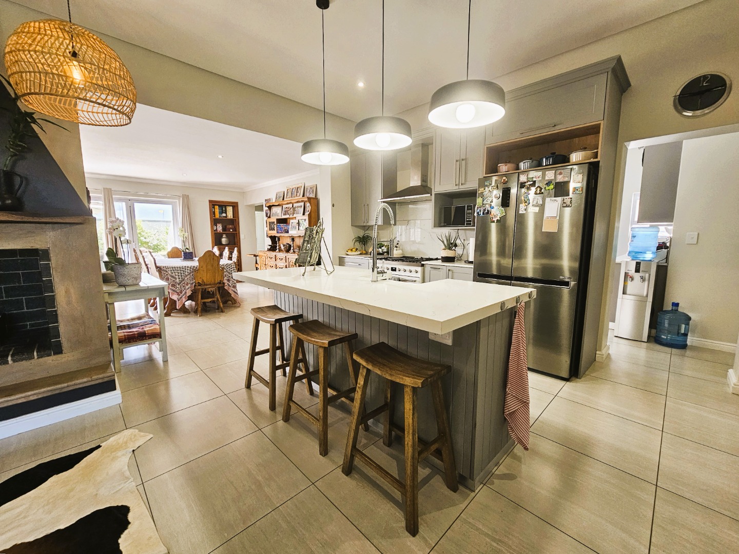 Inside, the home features an open-plan layout that seamlessly connects the living spaces, including two comfortable lounges and a dedicated dining room, ideal for both relaxation and entertaining. The well-appointed kitchen includes a separate pantry, laundry and scullery area, ensuring ample storage. Practical amenities such as a study, guest toilet and additional storage enhance daily convenience. Keep in mind that the study can easily be converted into a 4th bedroom. Enjoy indoor-outdoor living with a built-in braai, a cozy fireplace, and access to a private patio and upper deck, perfect for enjoying the scenic mountain views.