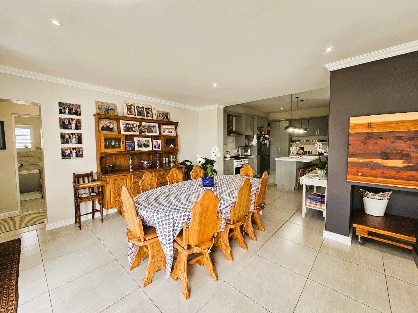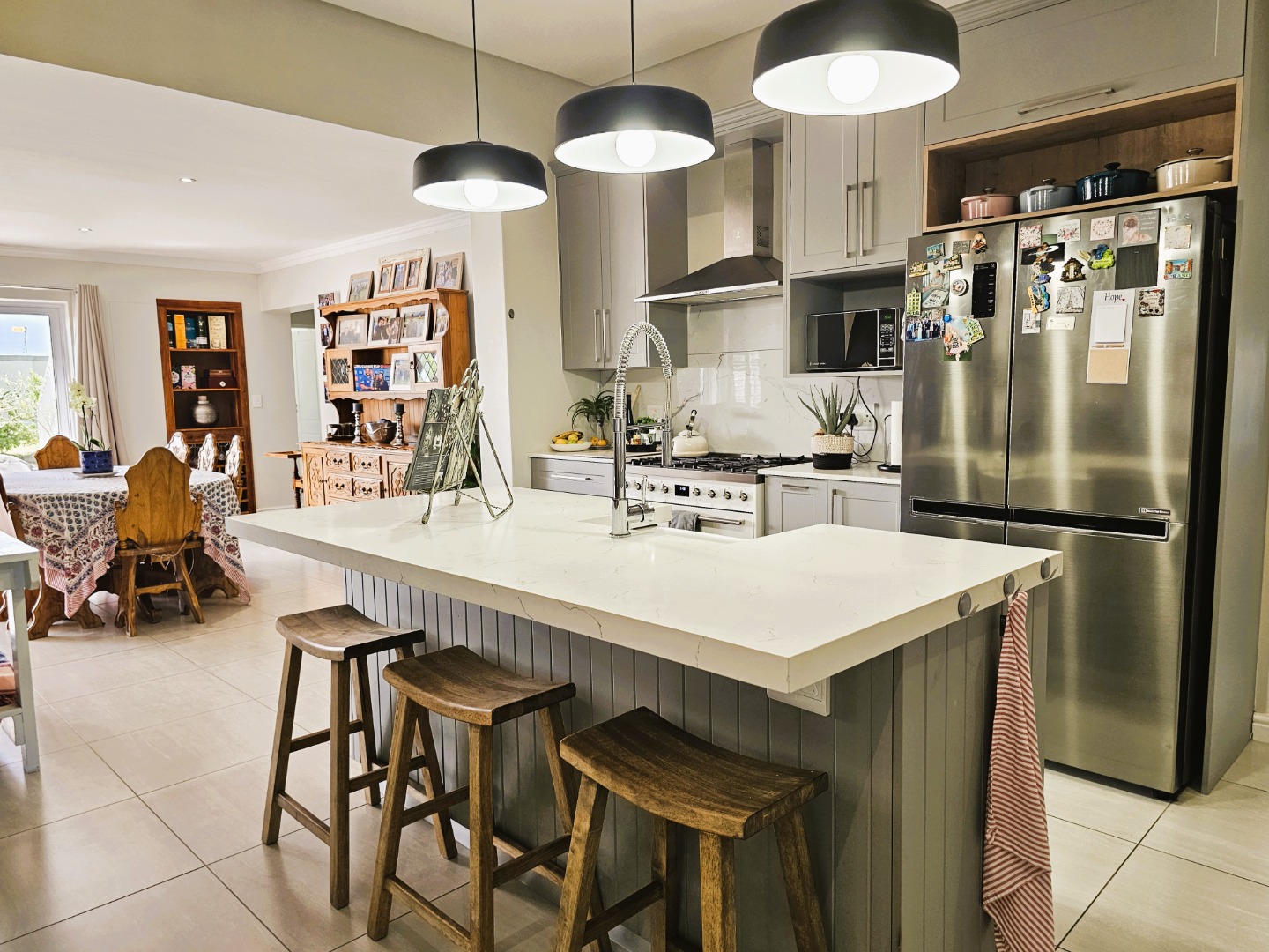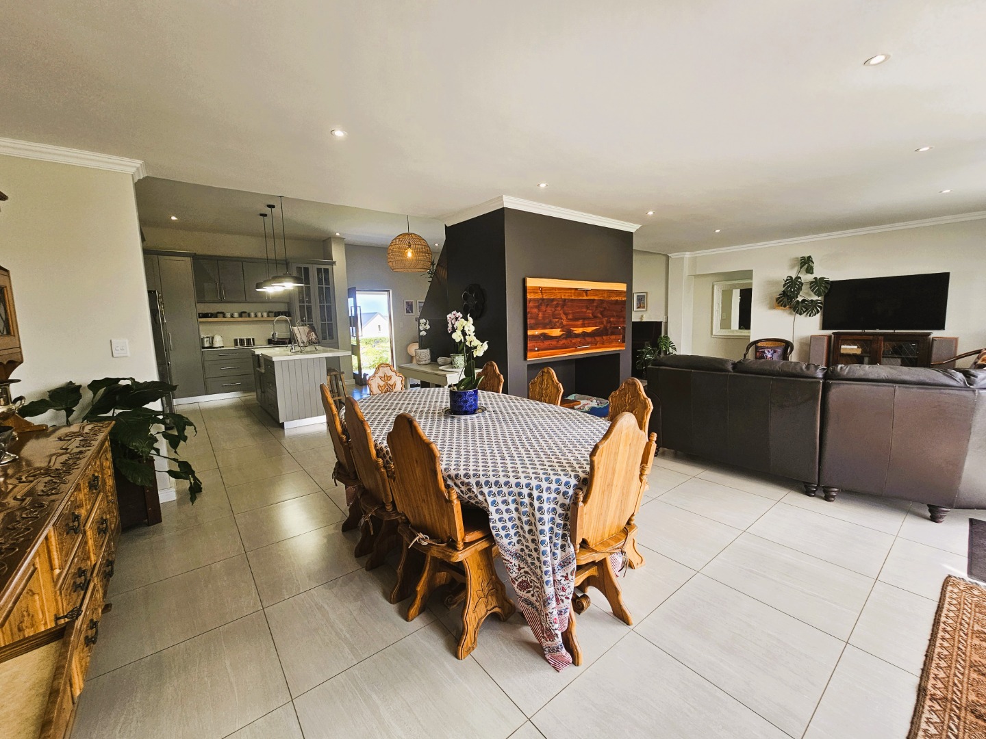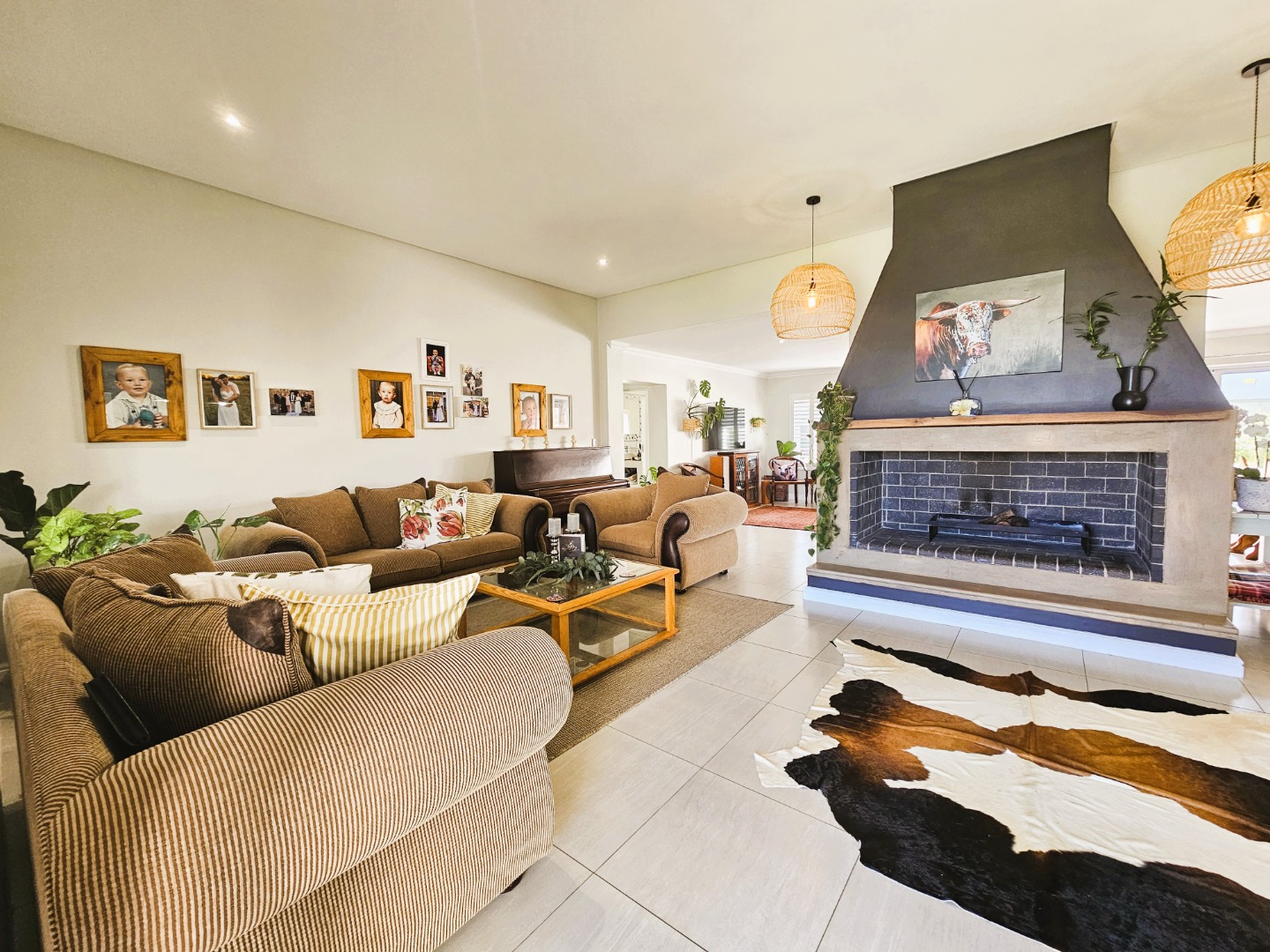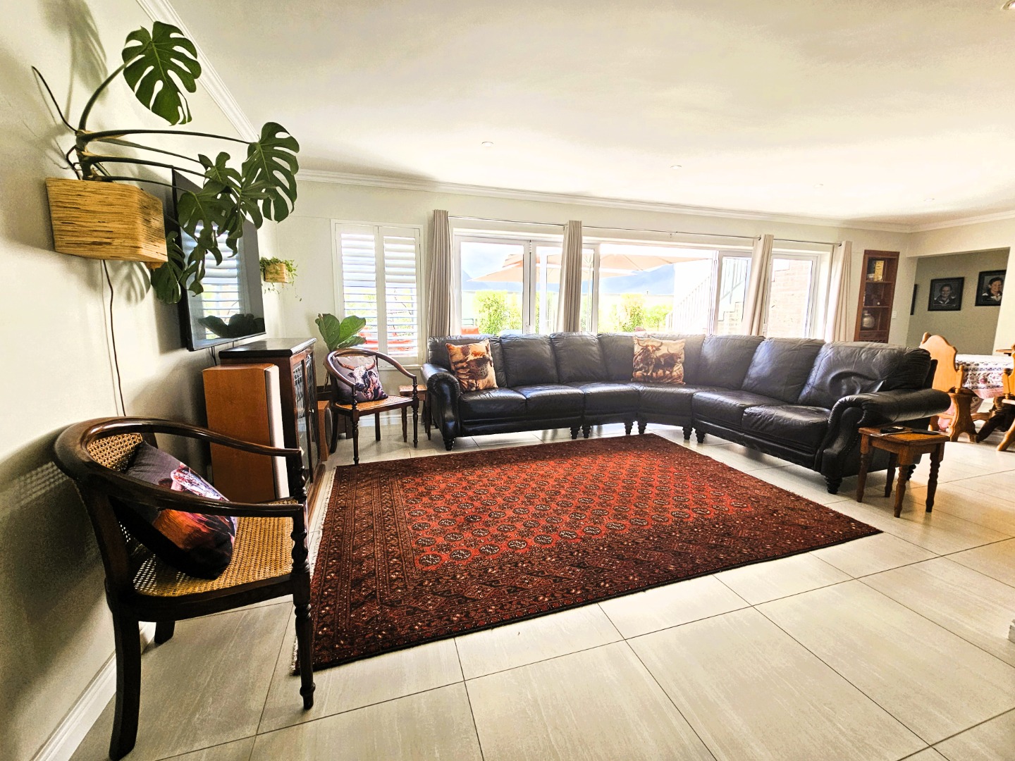 Inside, the home features an open-plan layout that seamlessly connects the living spaces, including two comfortable lounges and a dedicated dining room, ideal for both relaxation and entertaining. The well-appointed kitchen includes a separate pantry, laundry and scullery area, ensuring ample storage. Practical amenities such as a study, guest toilet and additional storage enhance daily convenience. Keep in mind that the study can easily be converted into a 4th bedroom. Enjoy indoor-outdoor living with a built-in braai, a cozy fireplace, and access to a private patio and upper deck, perfect for enjoying the scenic mountain views.