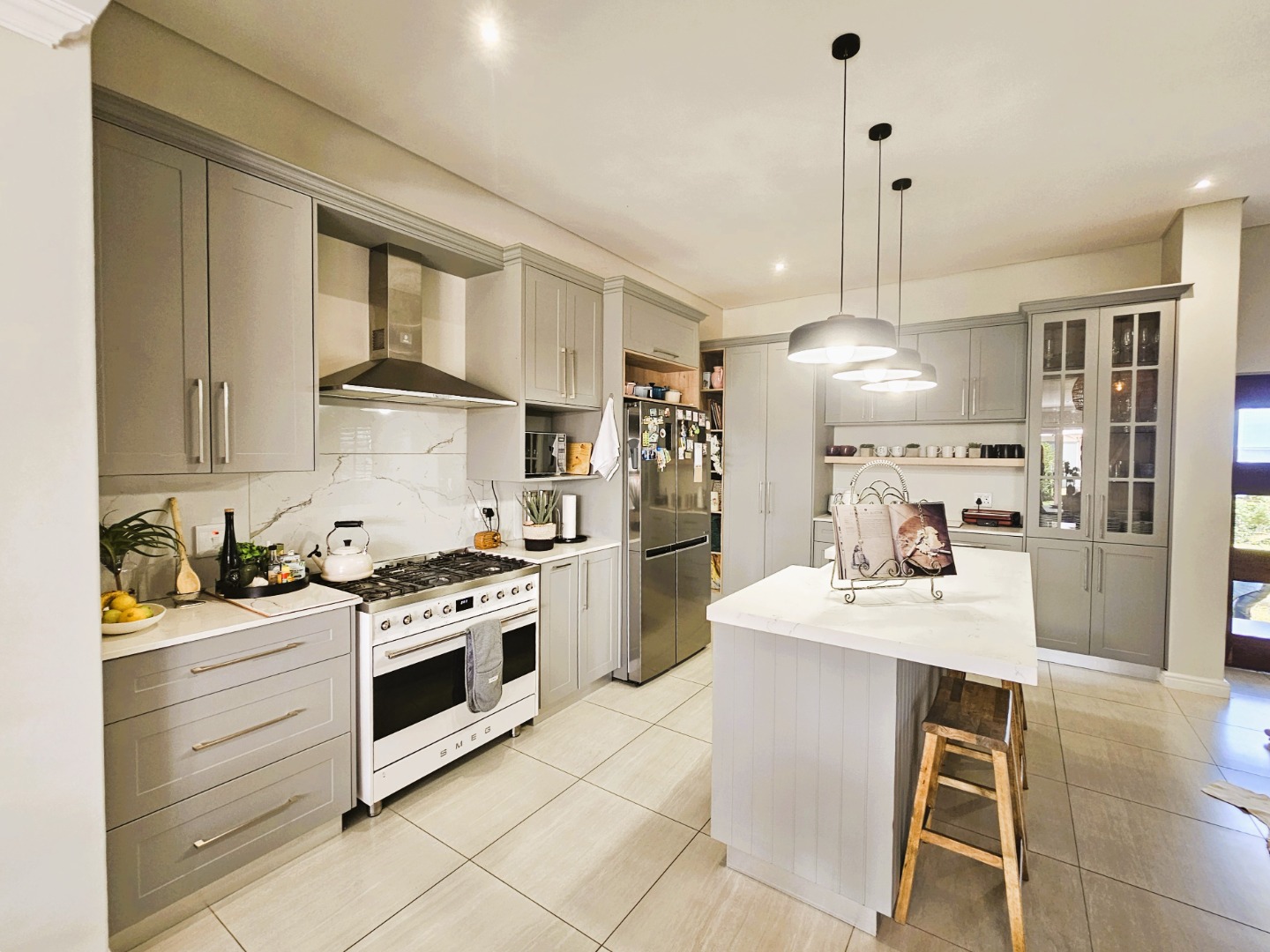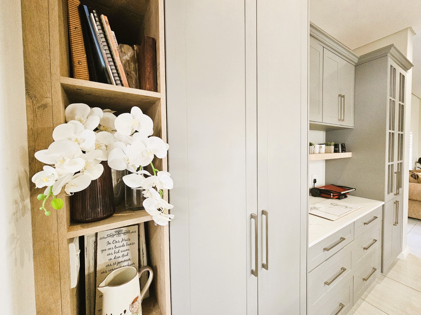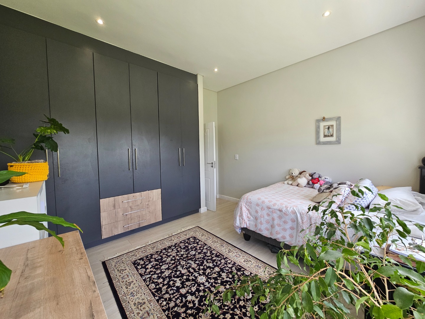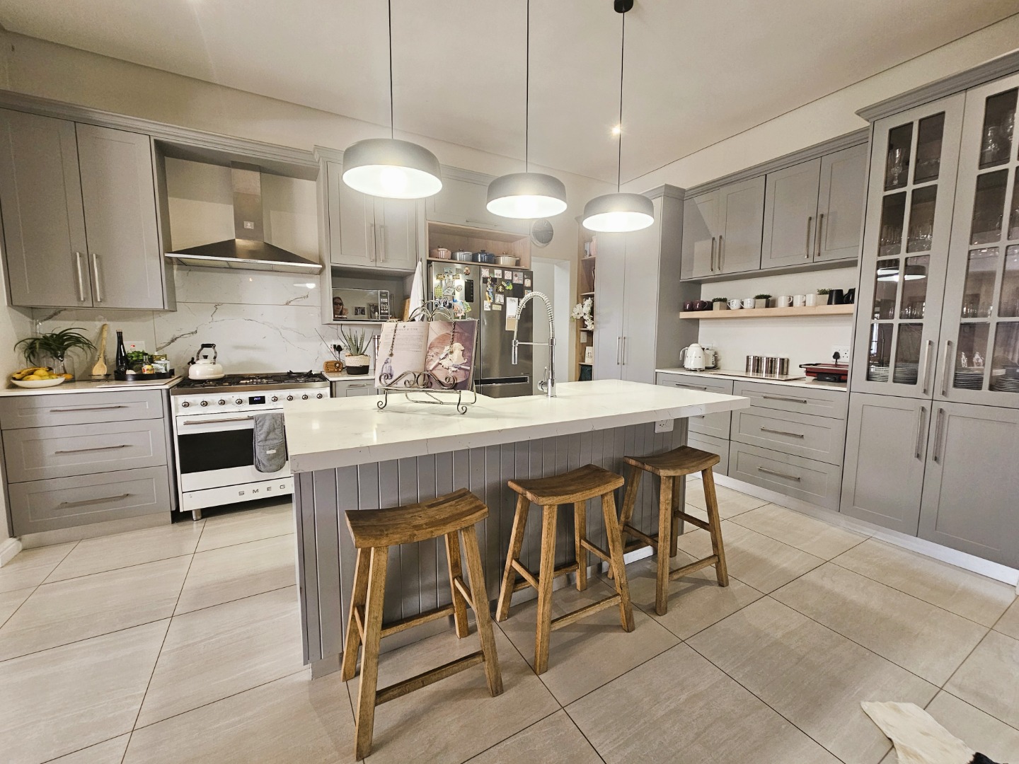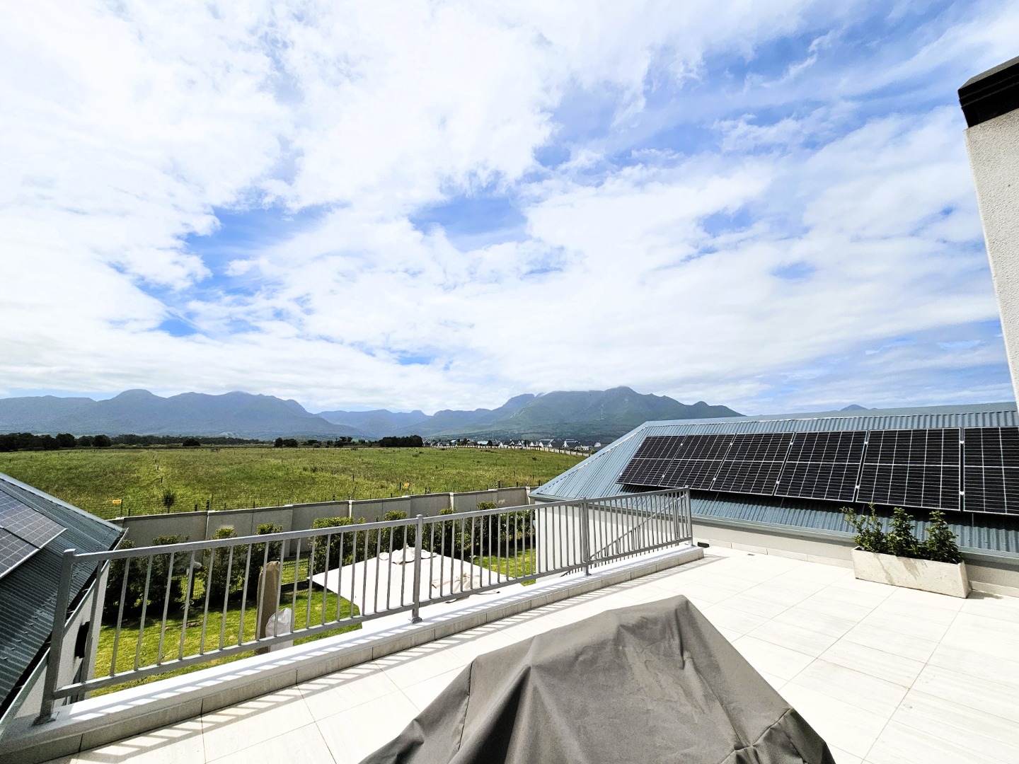 Inside, the home features an open-plan layout that seamlessly connects the living spaces, including two comfortable lounges and a dedicated dining room, ideal for both relaxation and entertaining. The well-appointed kitchen includes a separate pantry, laundry and scullery area, ensuring ample storage. Practical amenities such as a study, guest toilet and additional storage enhance daily convenience. Keep in mind that the study can easily be converted into a 4th bedroom. Enjoy indoor-outdoor living with a built-in braai, a cozy fireplace, and access to a private patio and upper deck, perfect for enjoying the scenic mountain views.