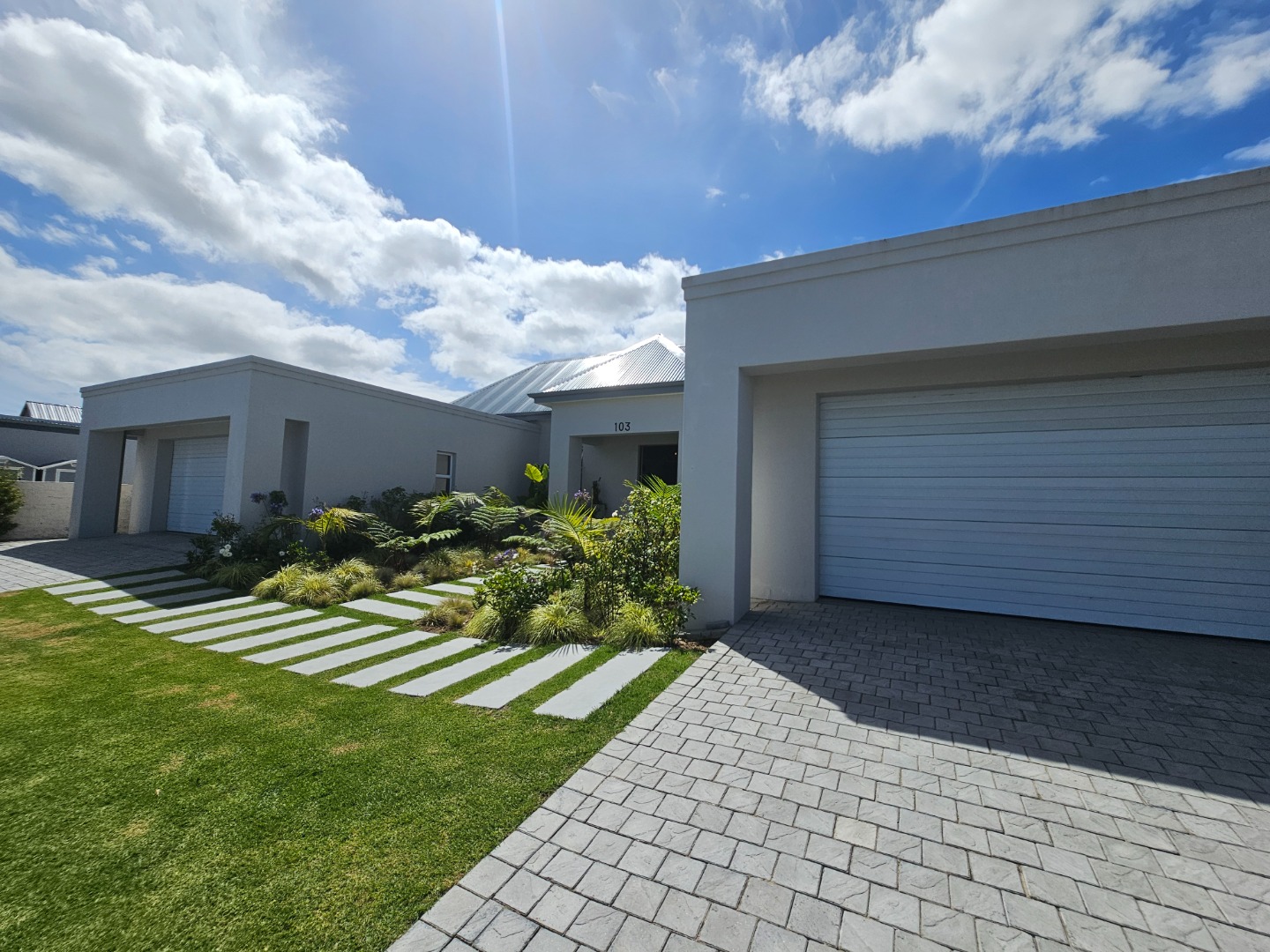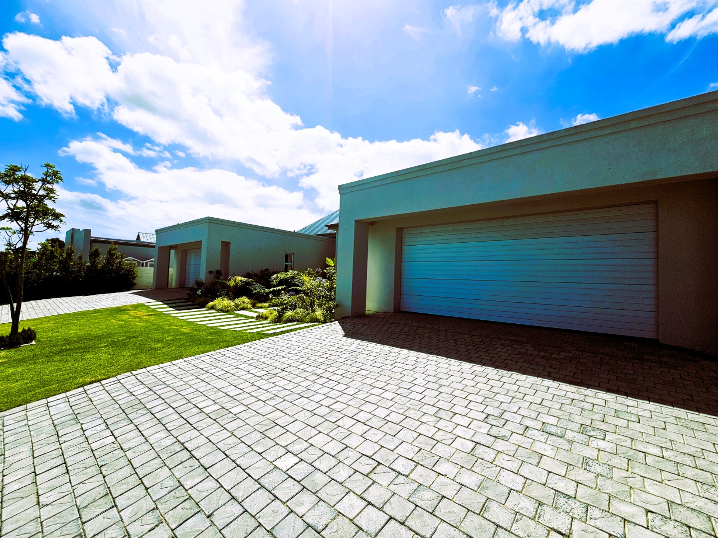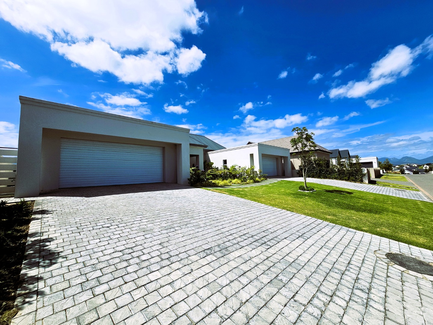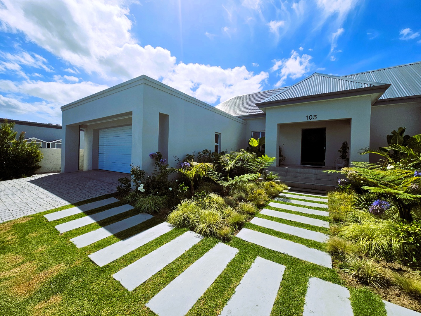 Discover modern living in this contemporary 3-bedroom, 2.5-bathroom home is situated within the prestigious Kingswood Golf Estate in George, South Africa. Boasting a clean, light-colored exterior and a striking architectural design, this single-story residence immediately impresses with its meticulously maintained landscaping, unique stepping stone pathway, and expansive paved driveway leading to two spacious garages. The property's kerb appeal is undeniable, offering a welcoming first impression.