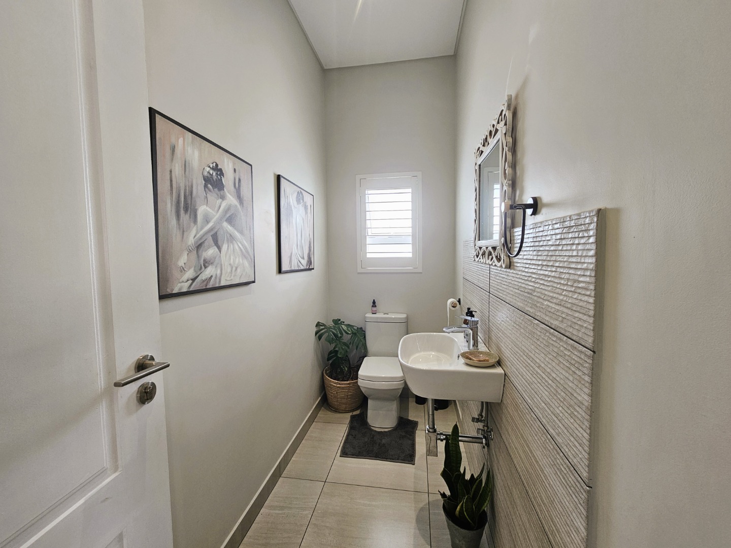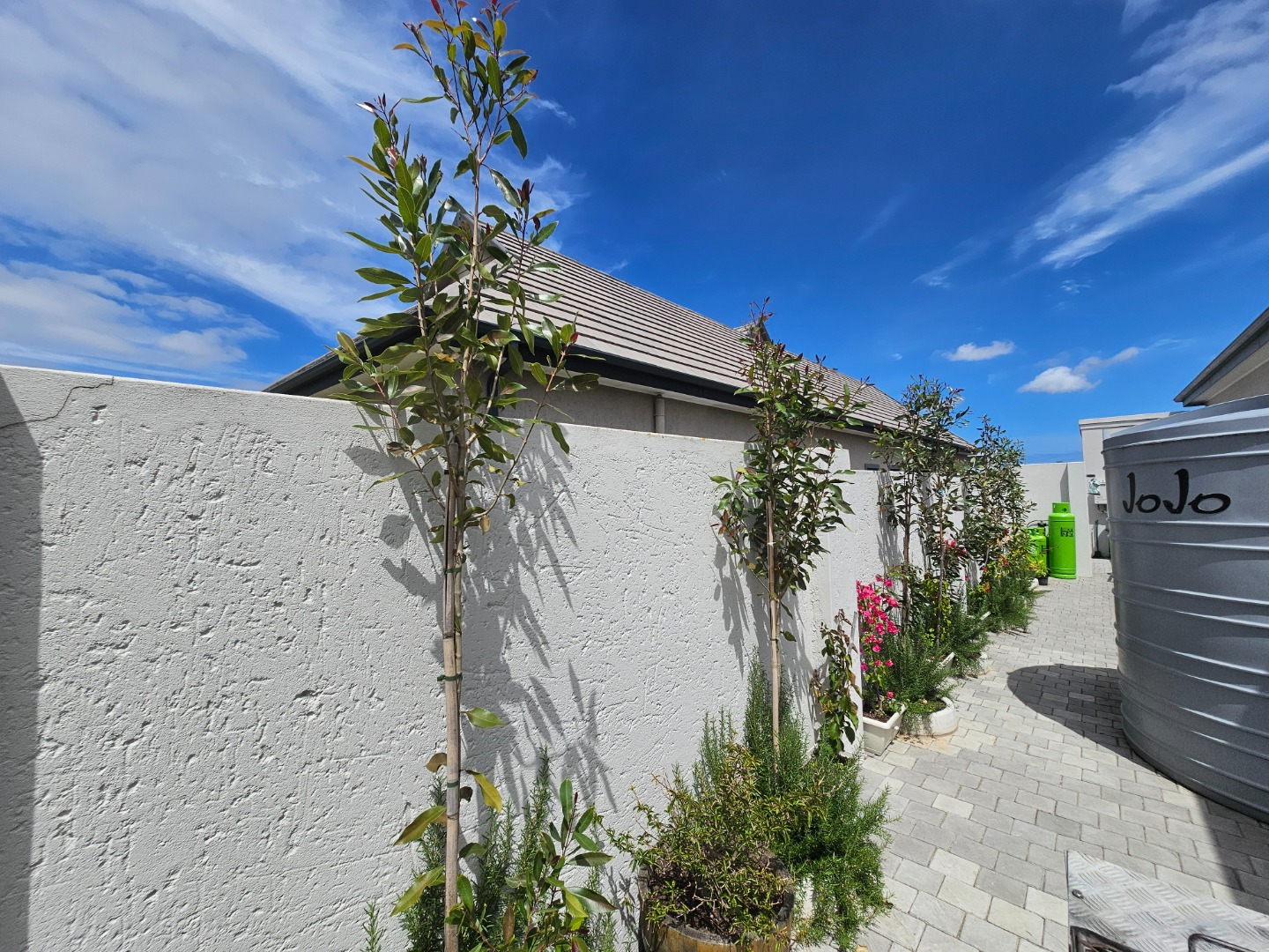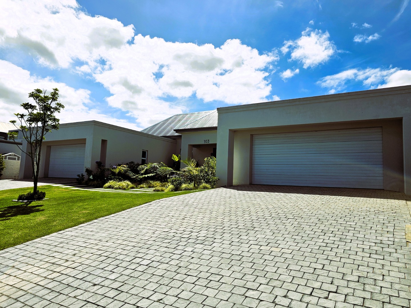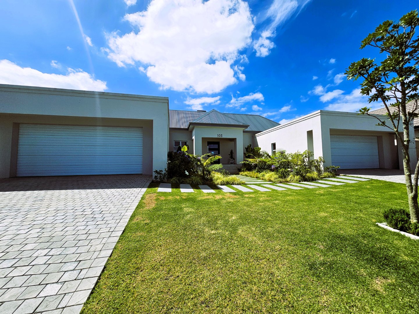 Discover modern living in this contemporary 3-bedroom, 2.5-bathroom home is situated within the prestigious Kingswood Golf Estate in George, South Africa. Boasting a clean, light-colored exterior and a striking architectural design, this single-story residence immediately impresses with its meticulously maintained landscaping, unique stepping stone pathway, and expansive paved driveway leading to two spacious garages. The property's kerb appeal is undeniable, offering a welcoming first impression.