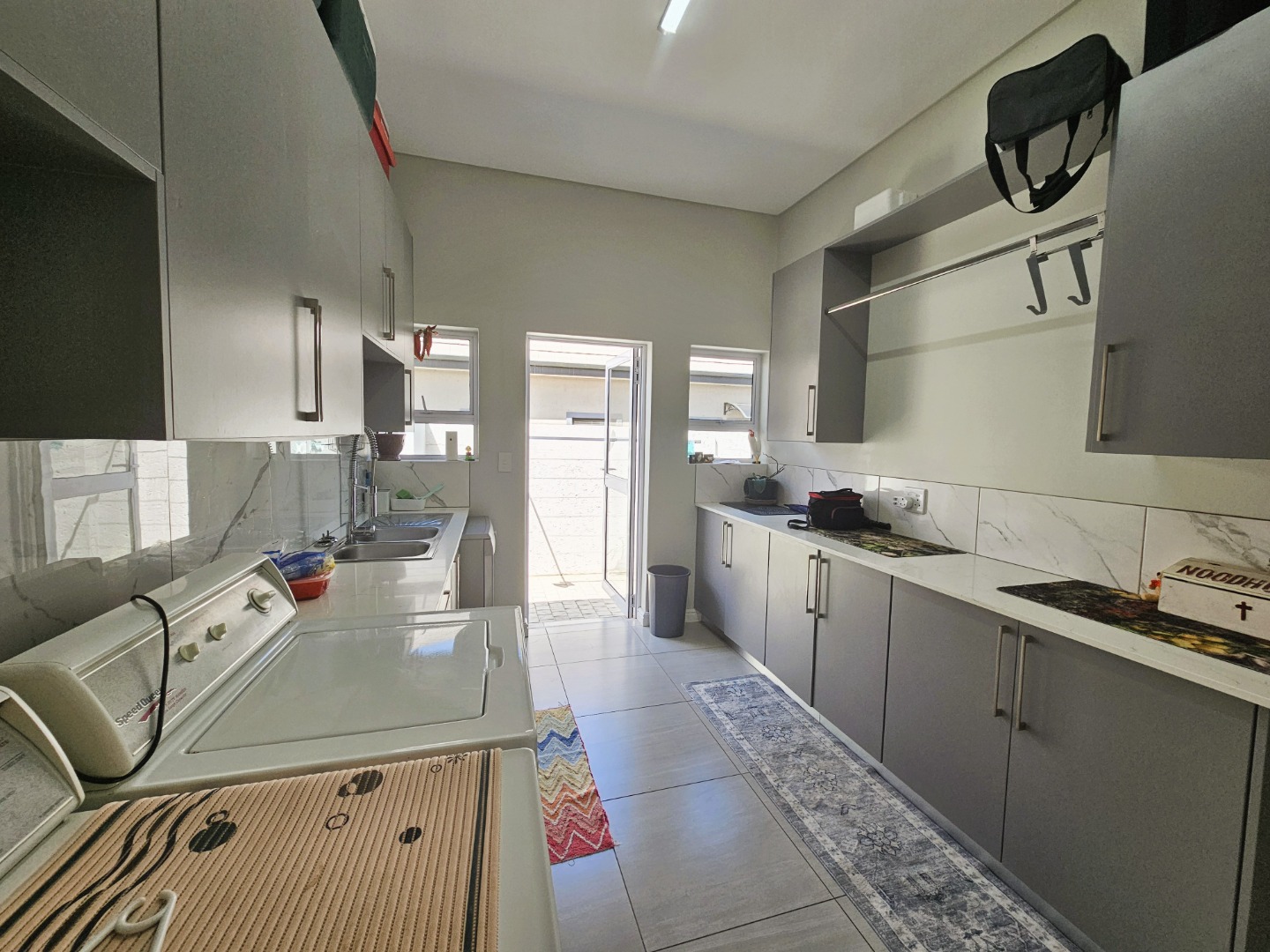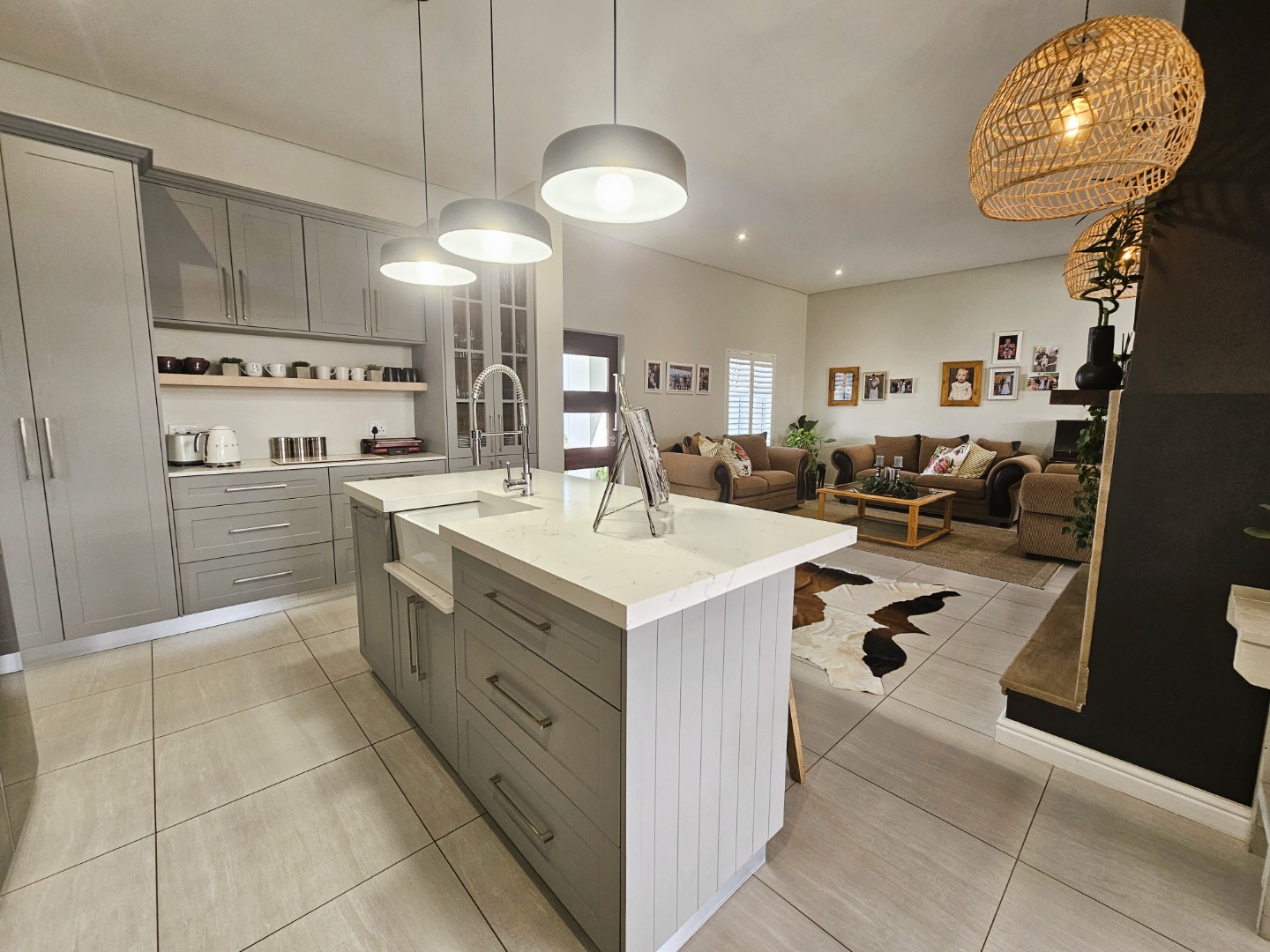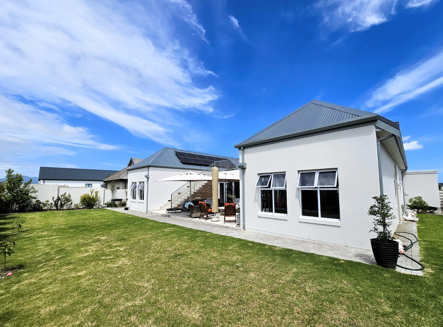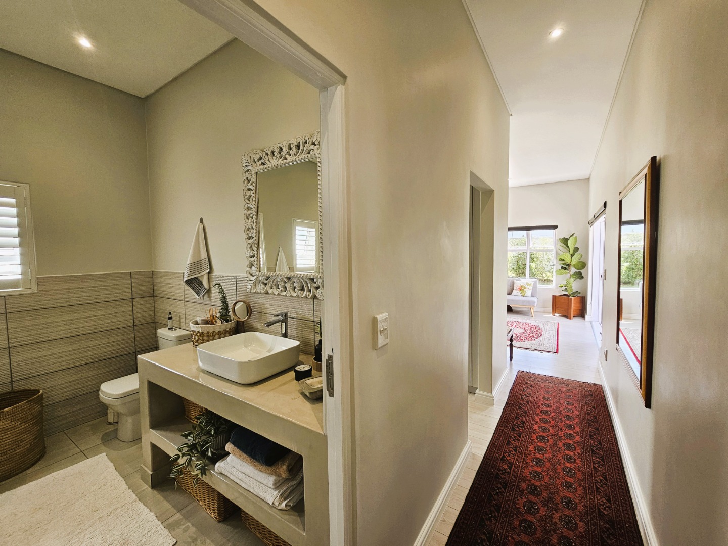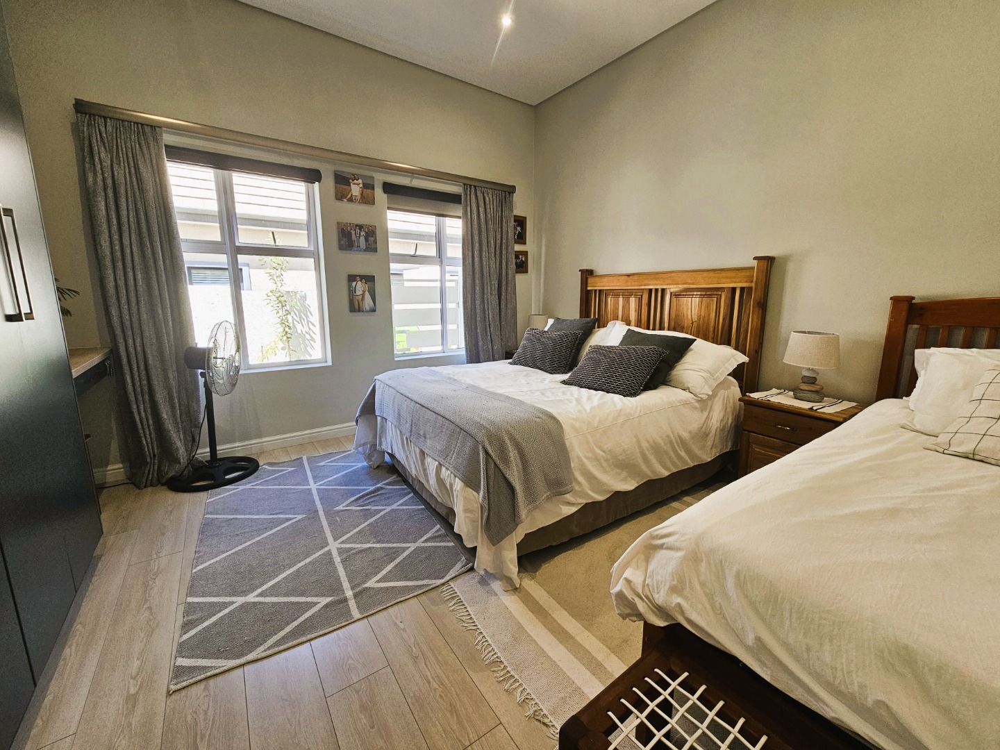 Discover modern living in this contemporary 3-bedroom, 2.5-bathroom home is situated within the prestigious Kingswood Golf Estate in George, South Africa. Boasting a clean, light-colored exterior and a striking architectural design, this single-story residence immediately impresses with its meticulously maintained landscaping, unique stepping stone pathway, and expansive paved driveway leading to two spacious garages. The property's kerb appeal is undeniable, offering a welcoming first impression.