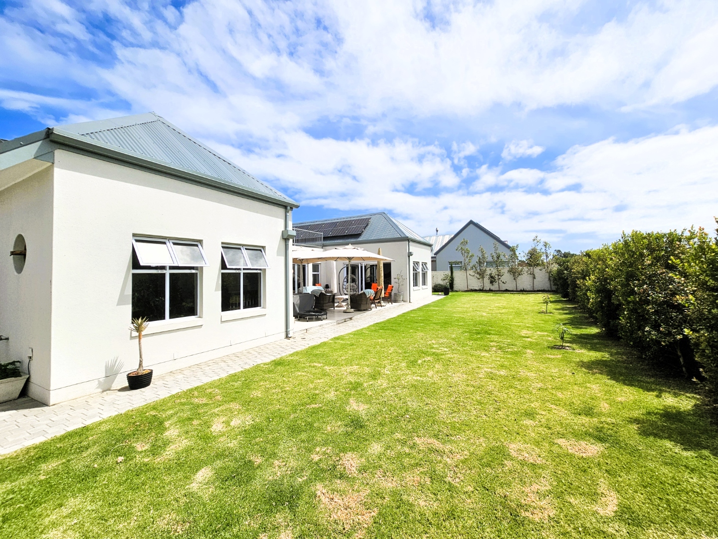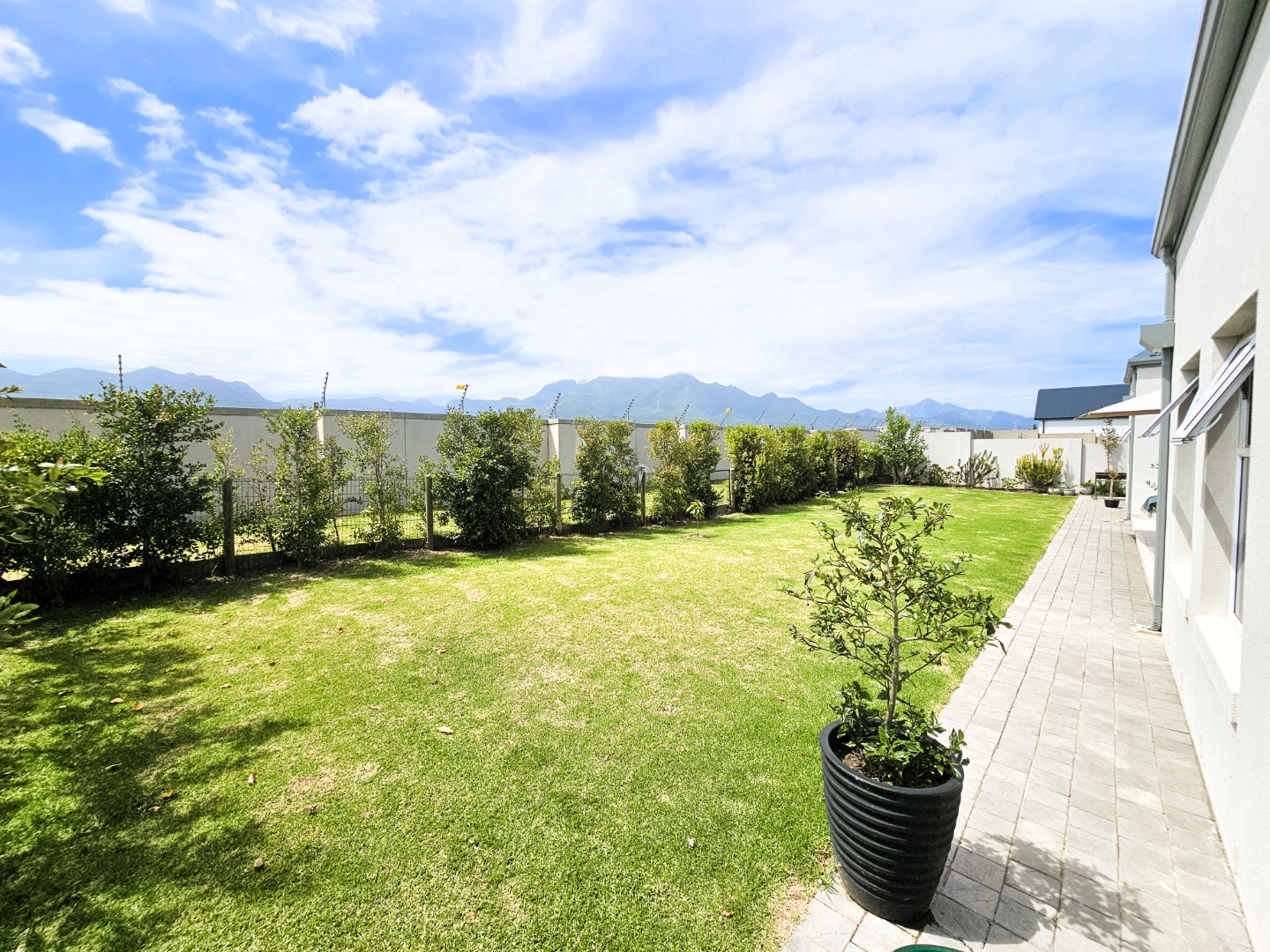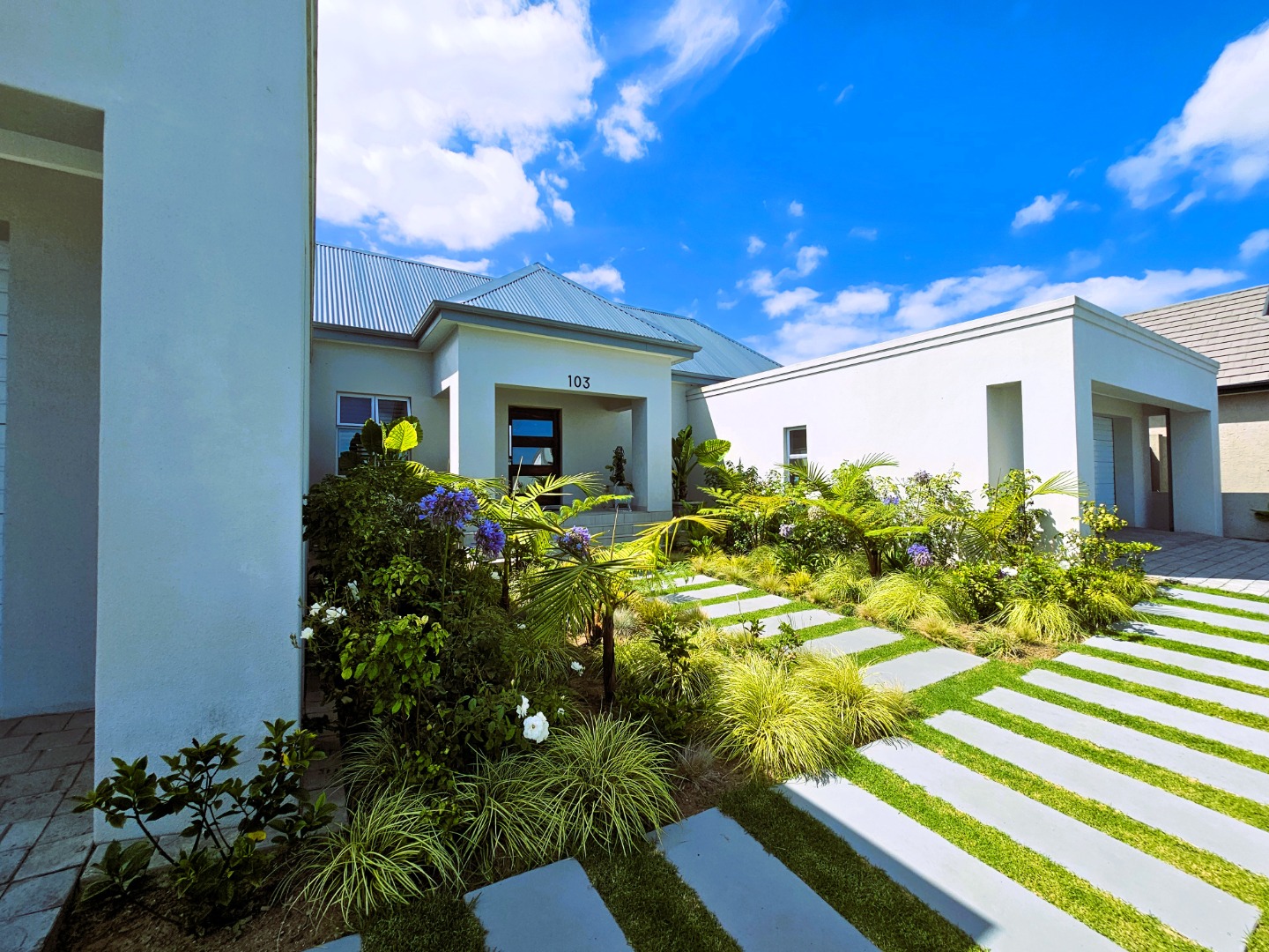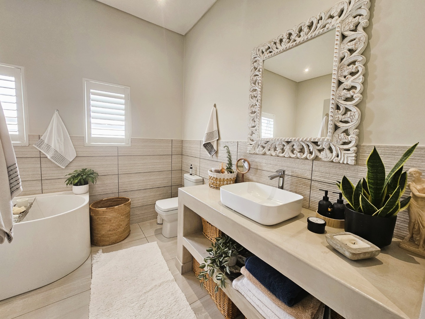 Discover modern living in this contemporary 3-bedroom, 2.5-bathroom home is situated within the prestigious Kingswood Golf Estate in George, South Africa. Boasting a clean, light-colored exterior and a striking architectural design, this single-story residence immediately impresses with its meticulously maintained landscaping, unique stepping stone pathway, and expansive paved driveway leading to two spacious garages. The property's kerb appeal is undeniable, offering a welcoming first impression.