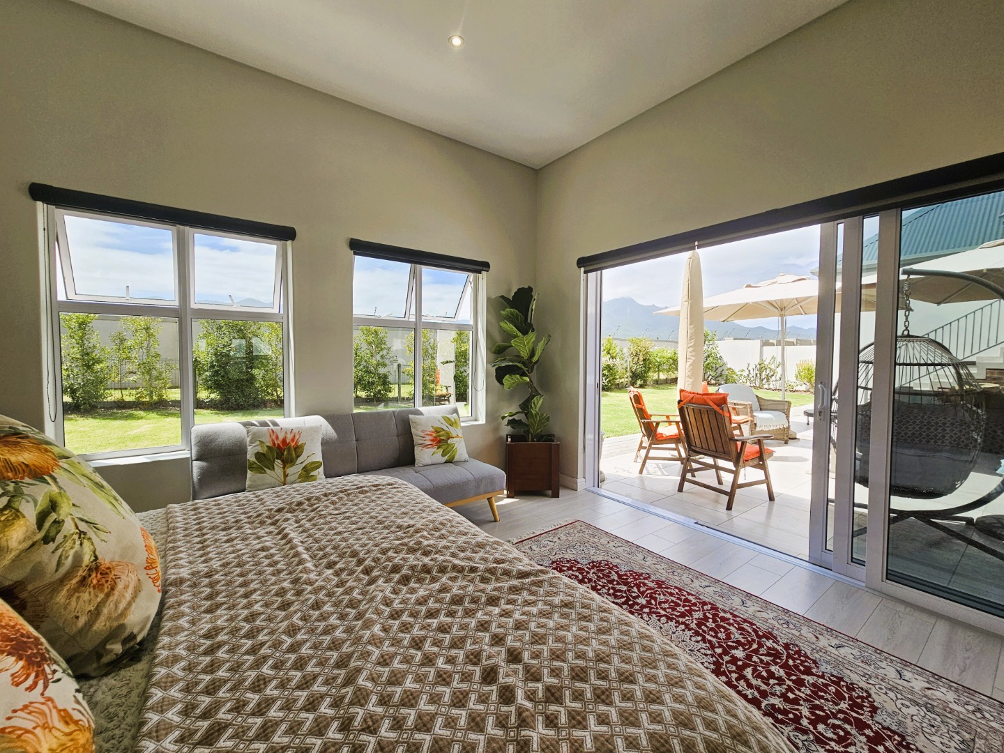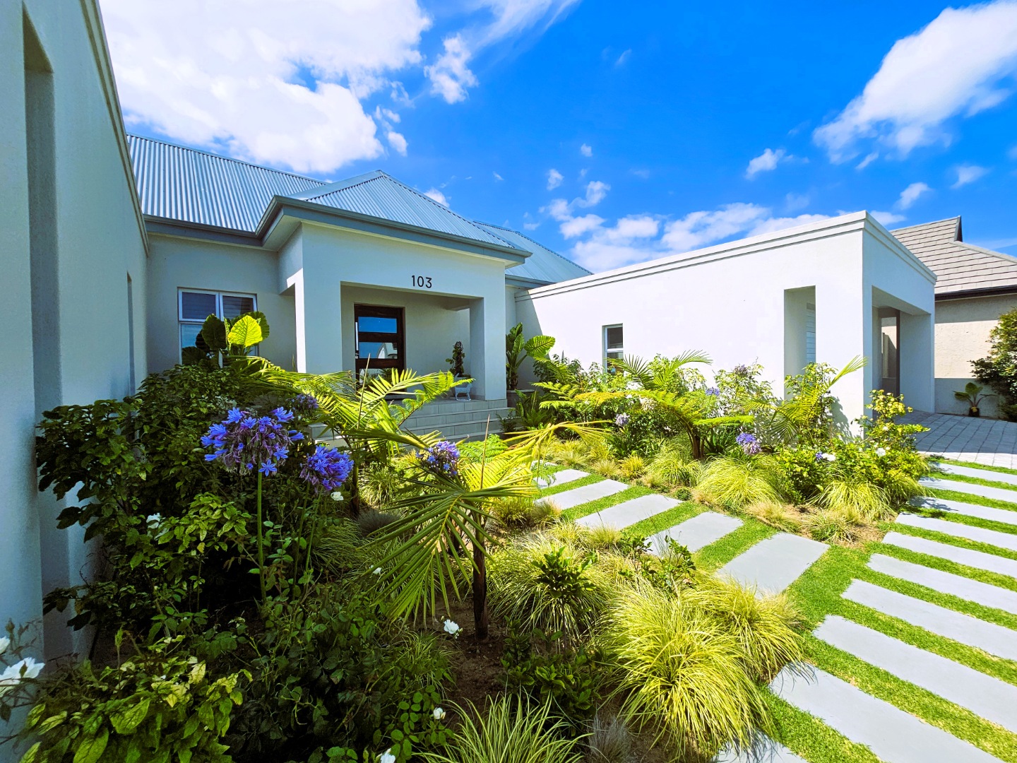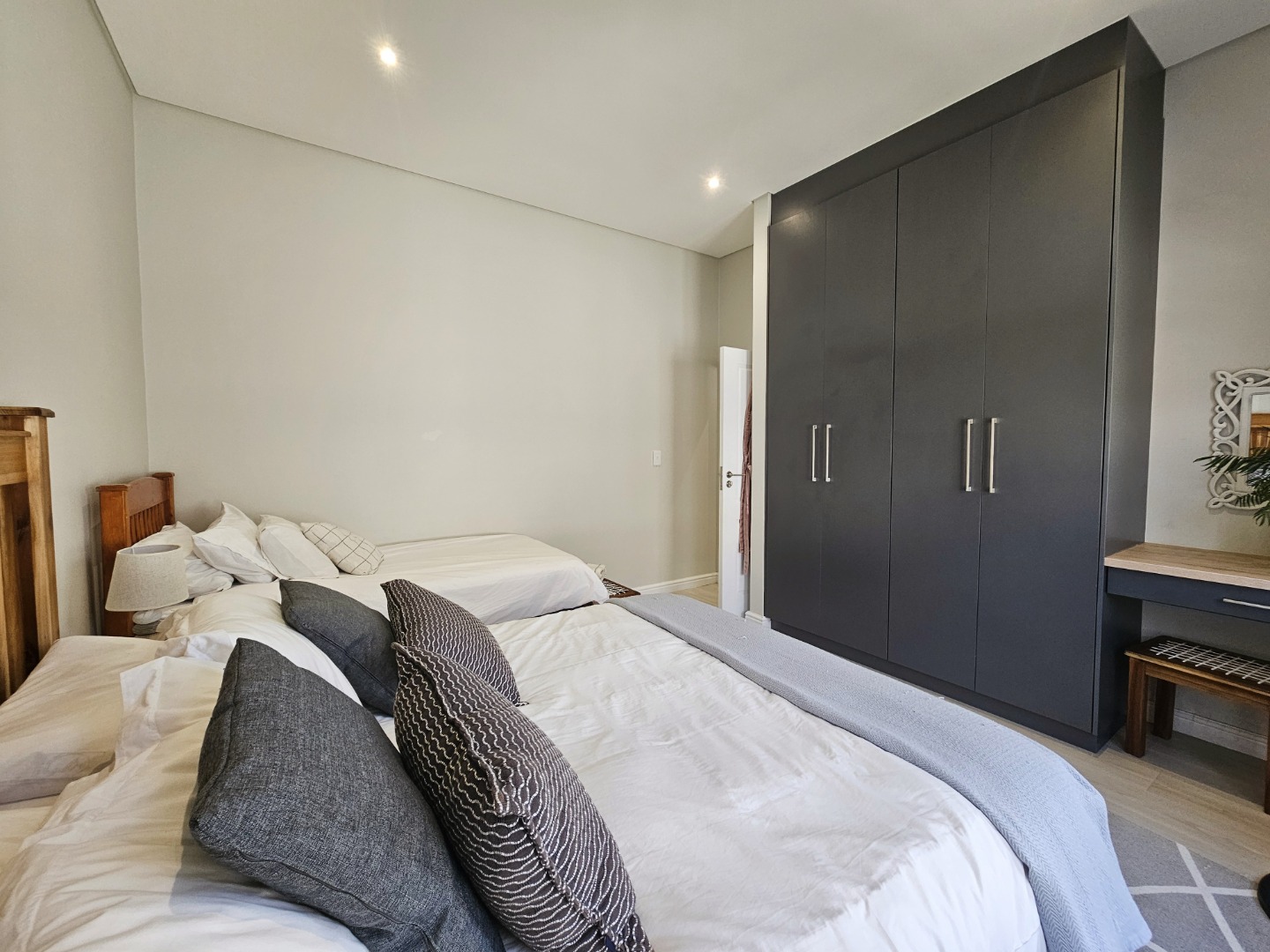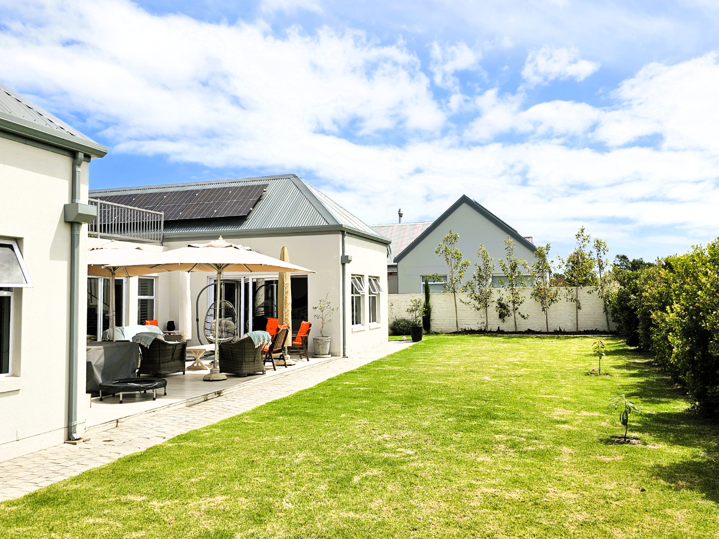Discover modern living in this contemporary 3-bedroom, 2.5-bathroom home is situated within the prestigious Kingswood Golf Estate in George, South Africa. Boasting a clean, light-colored exterior and a striking architectural design, this single-story residence immediately impresses with its meticulously maintained landscaping, unique stepping stone pathway, and expansive paved driveway leading to two spacious garages. The property's kerb appeal is undeniable, offering a welcoming first impression.