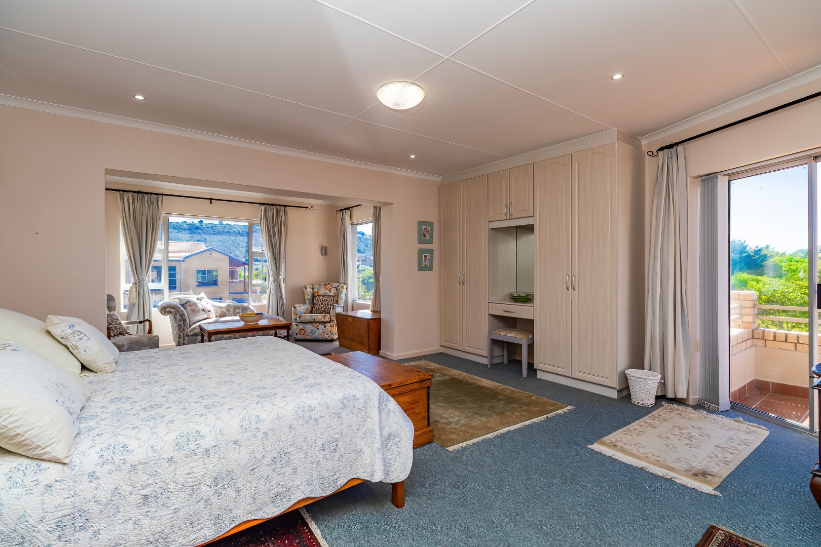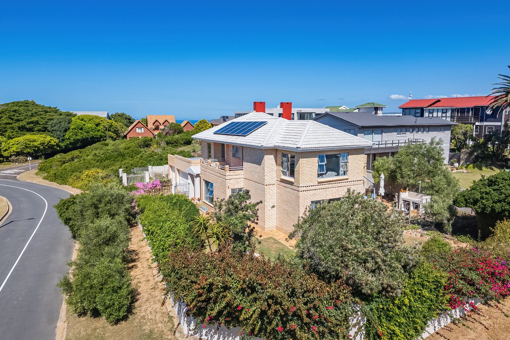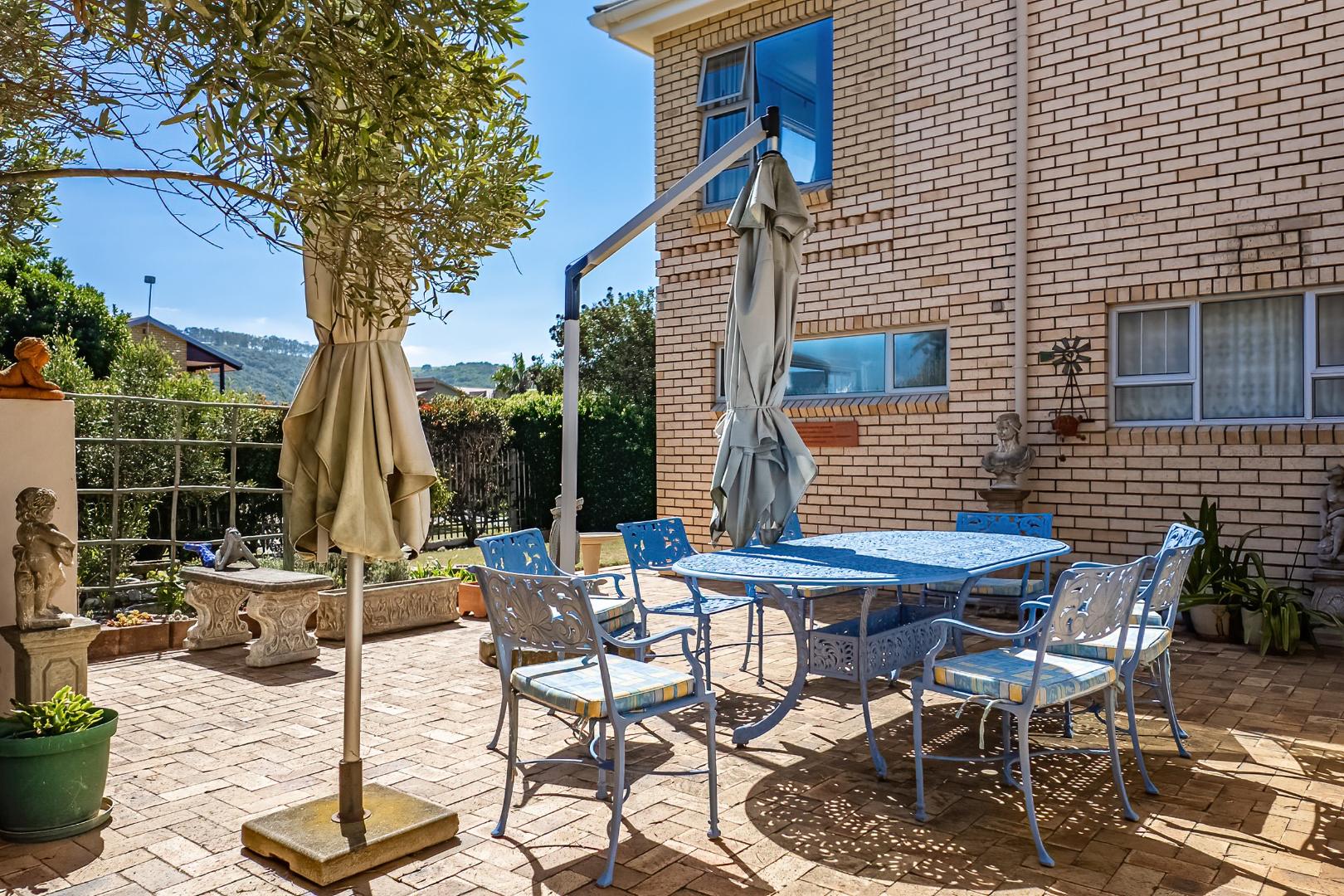 The exterior spaces of this home are designed to maximise enjoyment of the coastal environment. Multiple balconies and a spacious patio extend the living areas outdoors, providing superb vantage points for appreciating the breathtaking scenic and sea views that define this prime location. These outdoor areas are perfect for outdoor dining, relaxation, and entertaining, with an external built-in braai and a dedicated braai room facilitating effortless outdoor entertainment. The property is further enhanced by a maintained garden and a small olive grove, offering a sunny backdrop and a peaceful outdoor retreat.