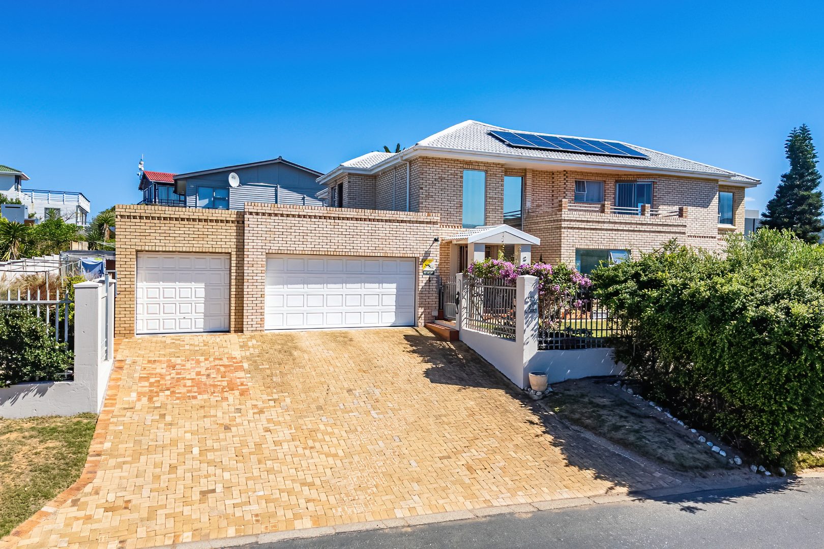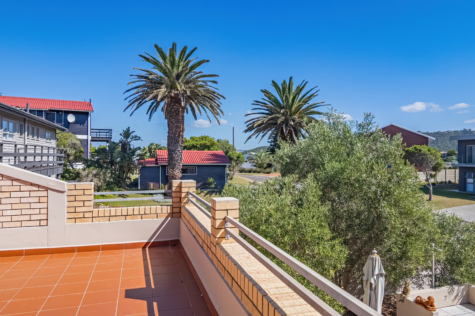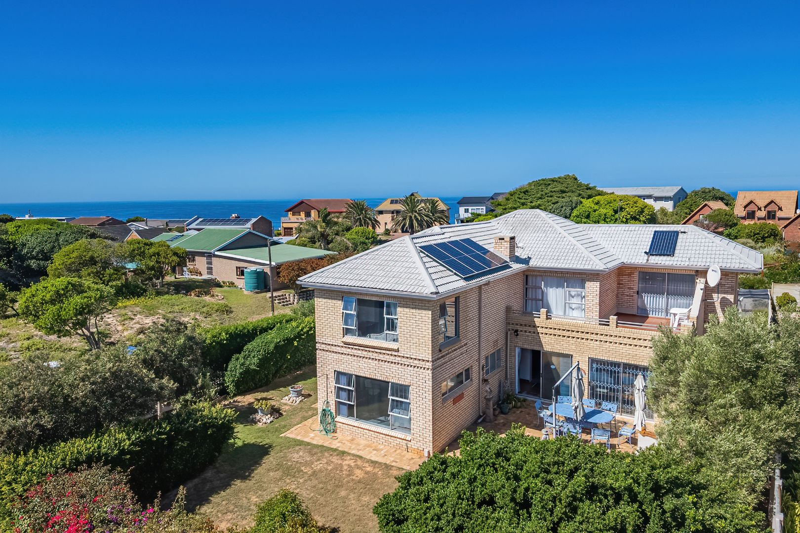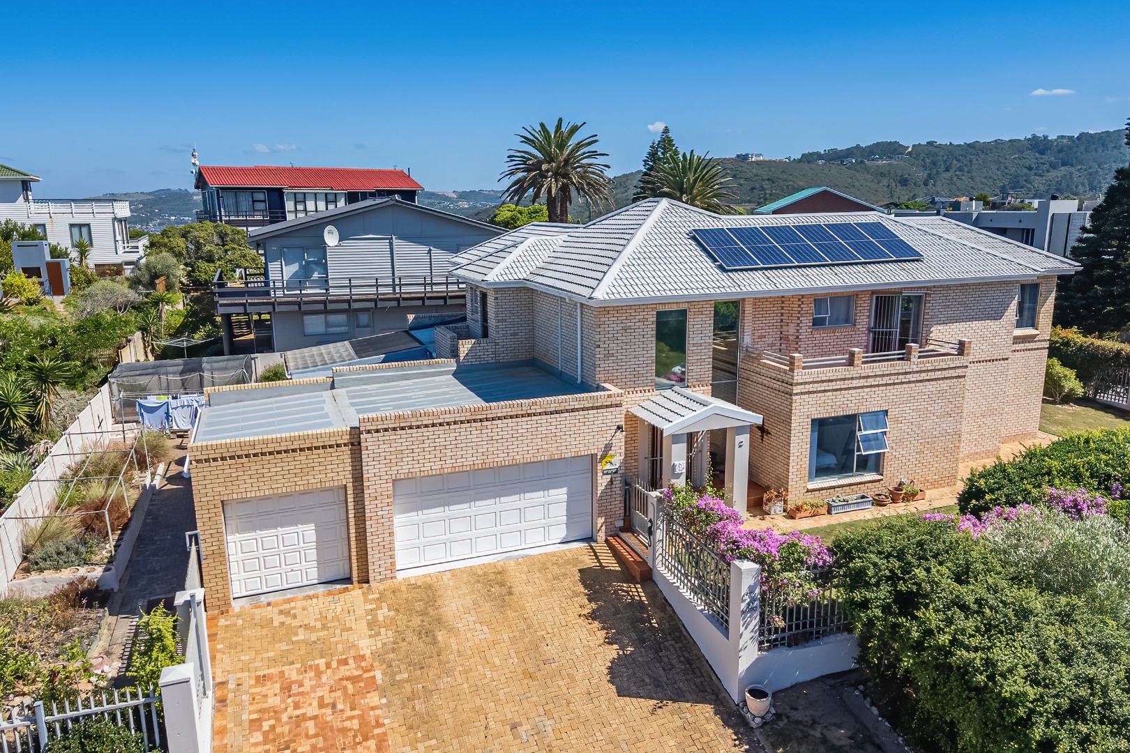 The exterior spaces of this home are designed to maximise enjoyment of the coastal environment. Multiple balconies and a spacious patio extend the living areas outdoors, providing superb vantage points for appreciating the breathtaking scenic and sea views that define this prime location. These outdoor areas are perfect for outdoor dining, relaxation, and entertaining, with an external built-in braai and a dedicated braai room facilitating effortless outdoor entertainment. The property is further enhanced by a maintained garden and a small olive grove, offering a sunny backdrop and a peaceful outdoor retreat.