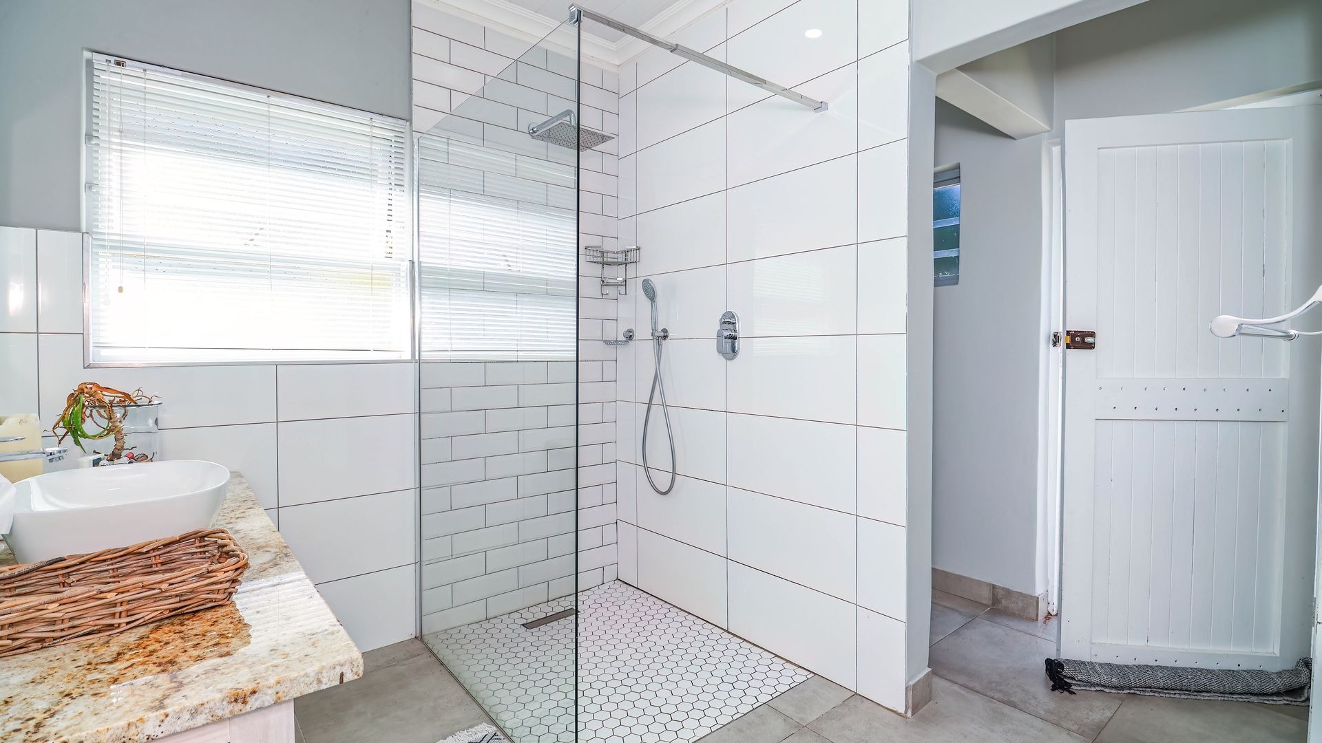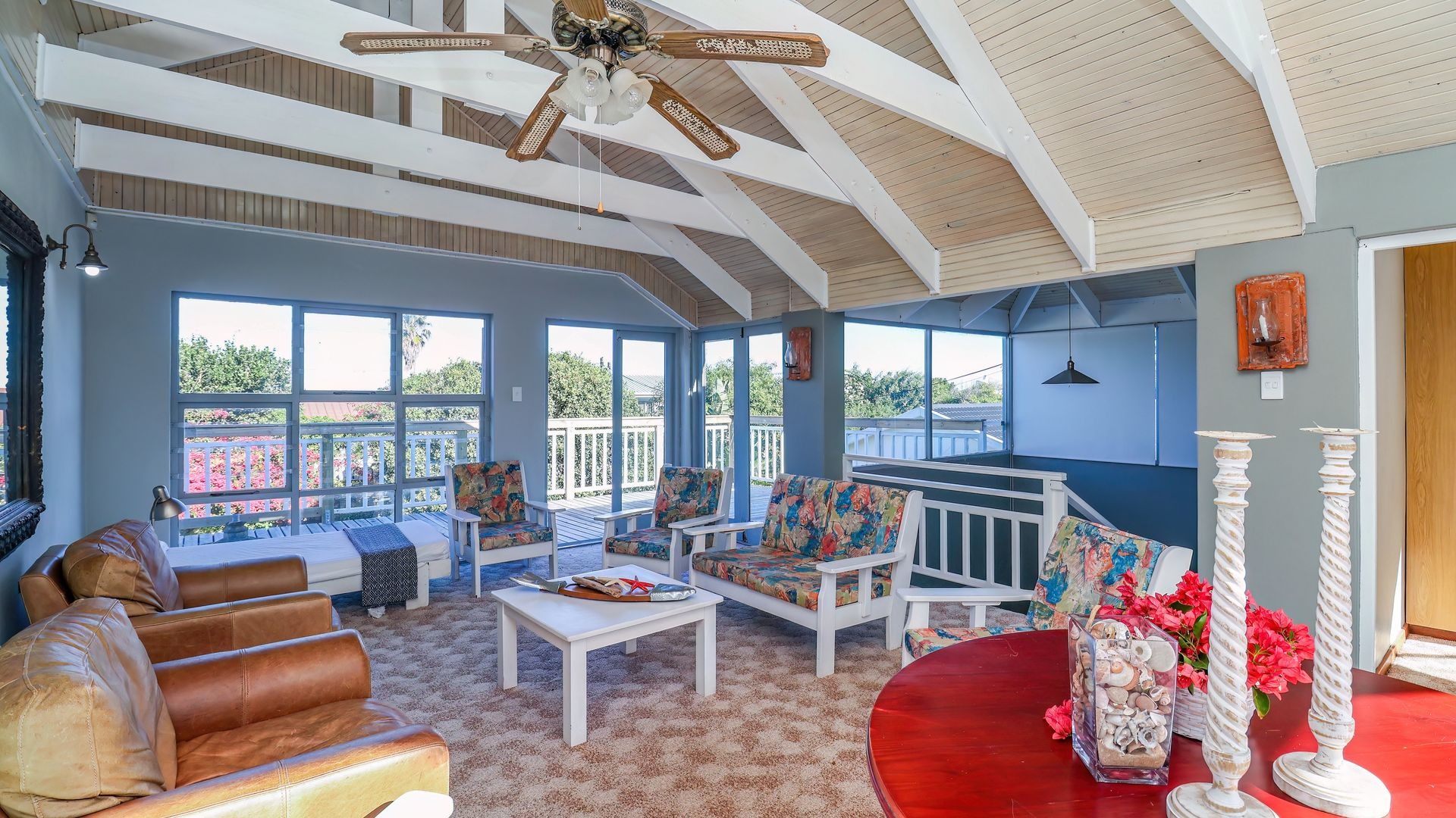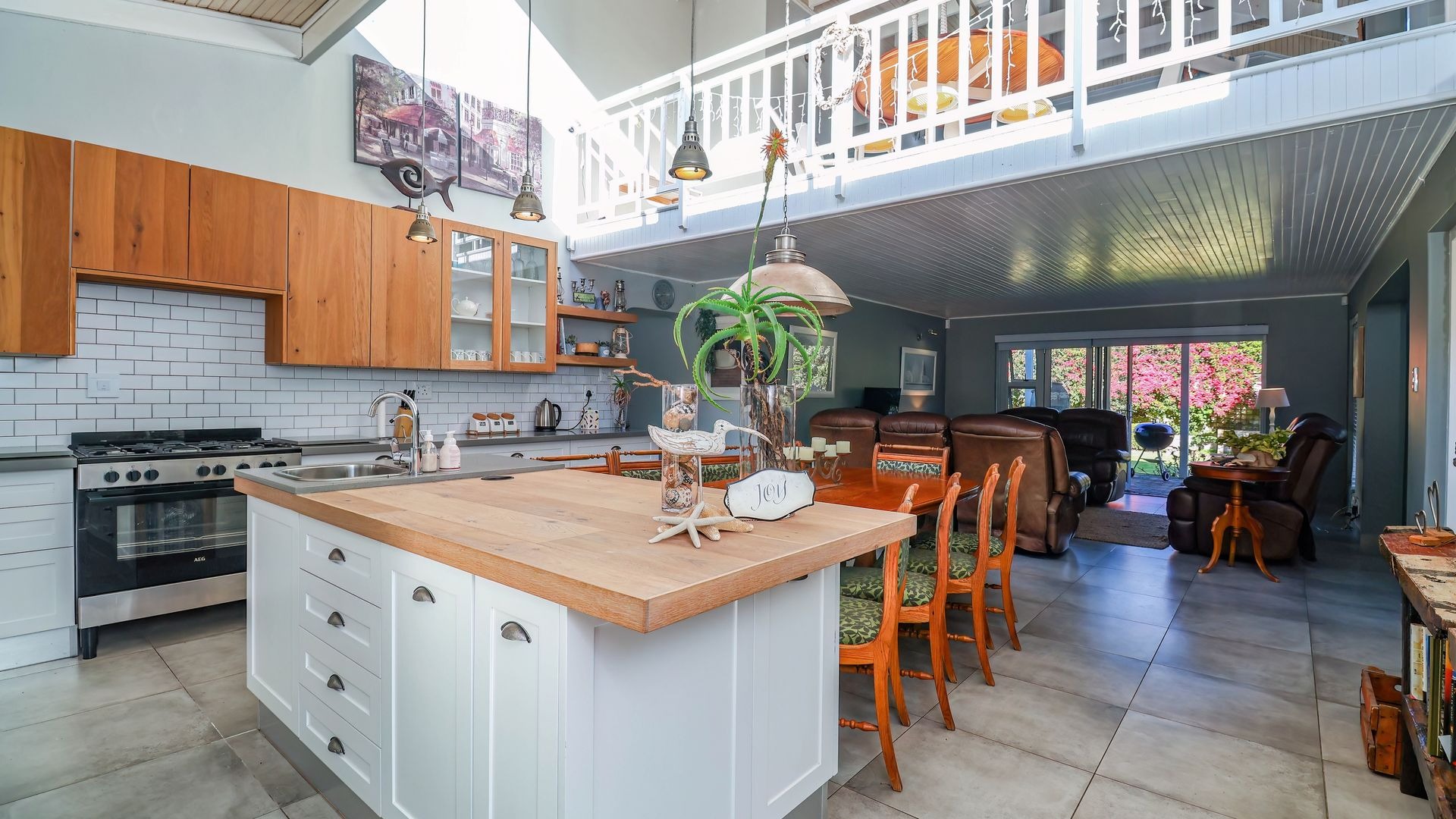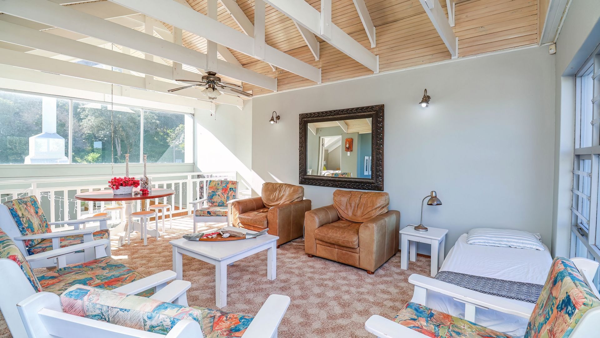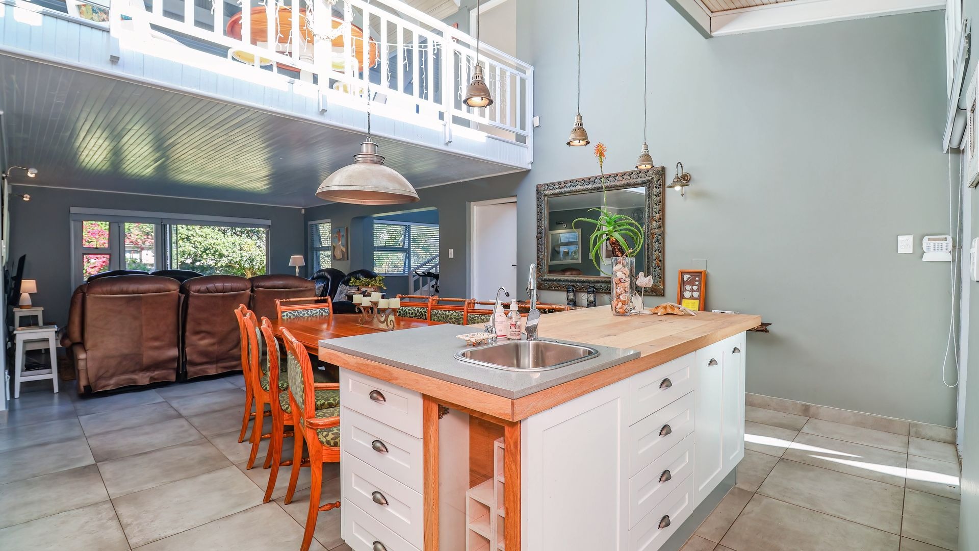 Accommodation comprises four generously sized bedrooms, ensuring comfort for family and guests. Three bathrooms are available, with two of these being convenient ensuites, offering privacy and ease. The property also includes staff quarters providing versatile options for extended family, staff, or potential rental income. The main bedroom upstairs is en suite and comes with a spacious lounge and wooden deck with sea views. Alternatively this area can be used as a guest bedroom with spacious lounge for guests.