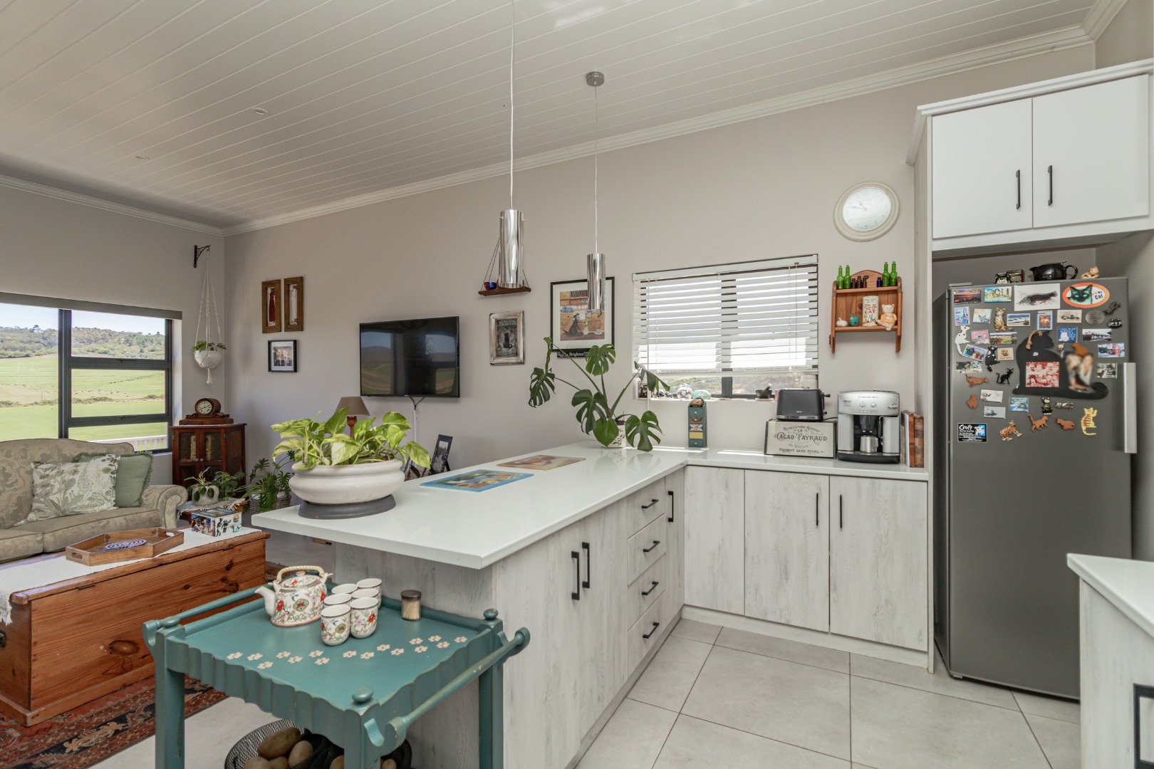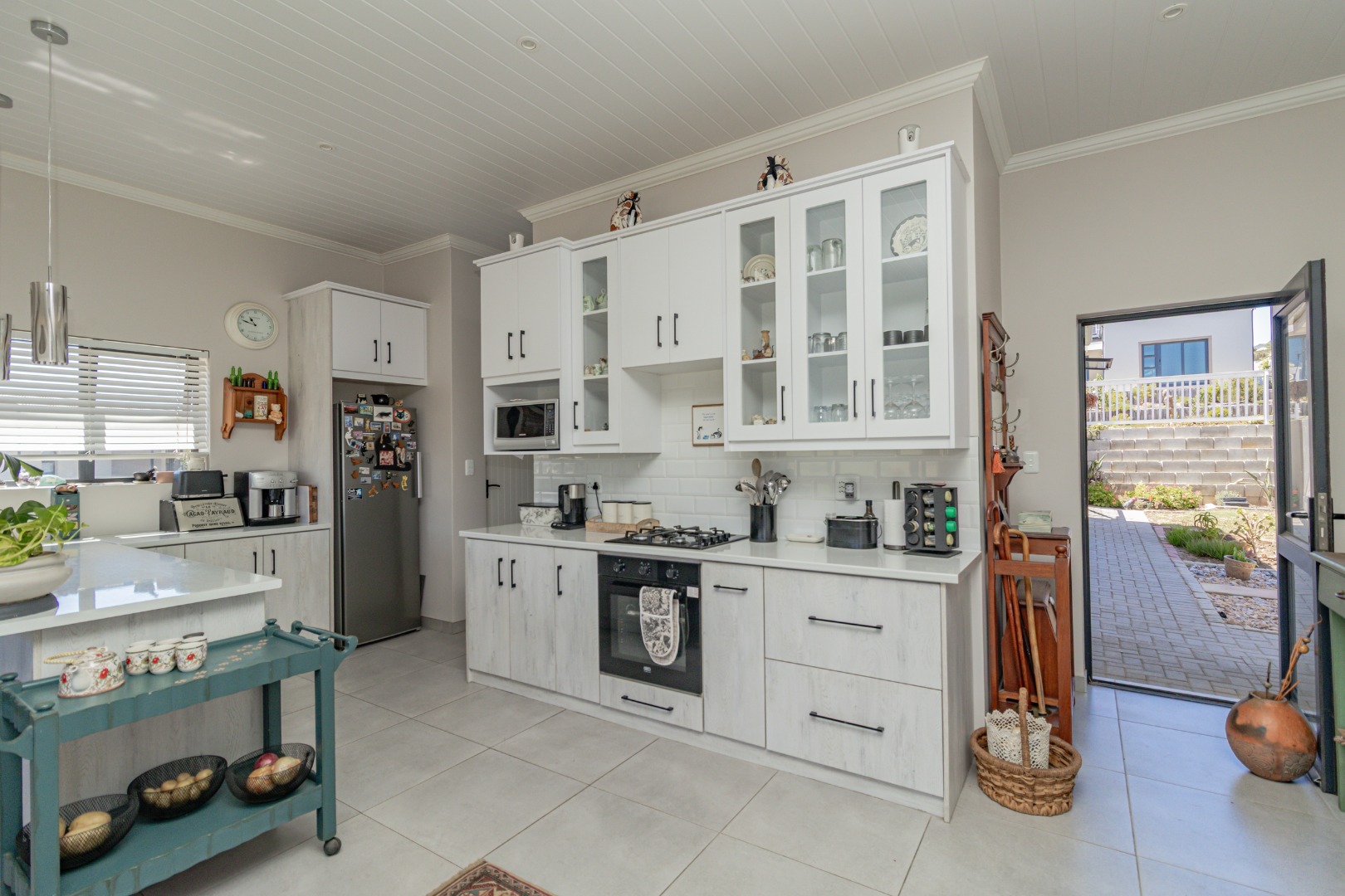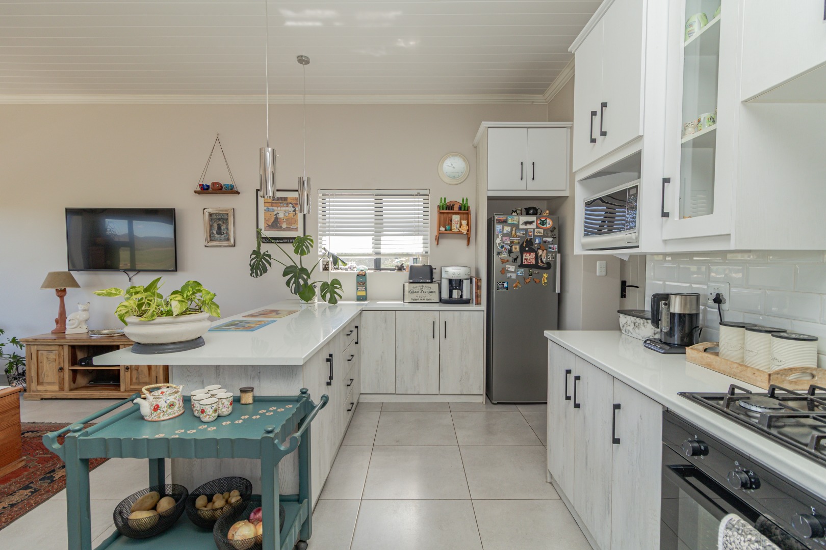 Step inside to an inviting open-plan living space, designed for comfort and modern functionality. The heart of the home is a bright kitchen featuring sleek white and light wood-grain cabinetry, complemented by a white subway tile backsplash and durable tiled flooring. Equipped with a built-in oven, gas hob, and a convenient island/breakfast bar, this kitchen is ideal for both daily meals and entertaining. Ample natural light floods the area, enhancing the spacious feel.