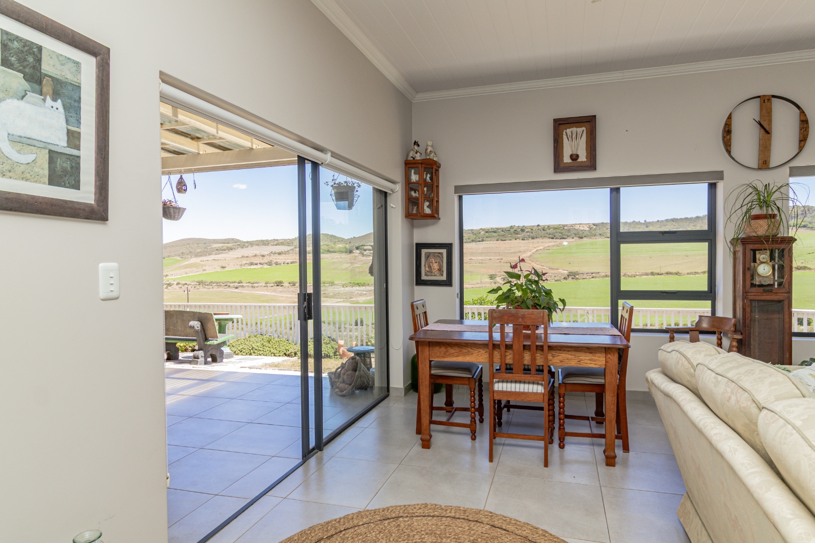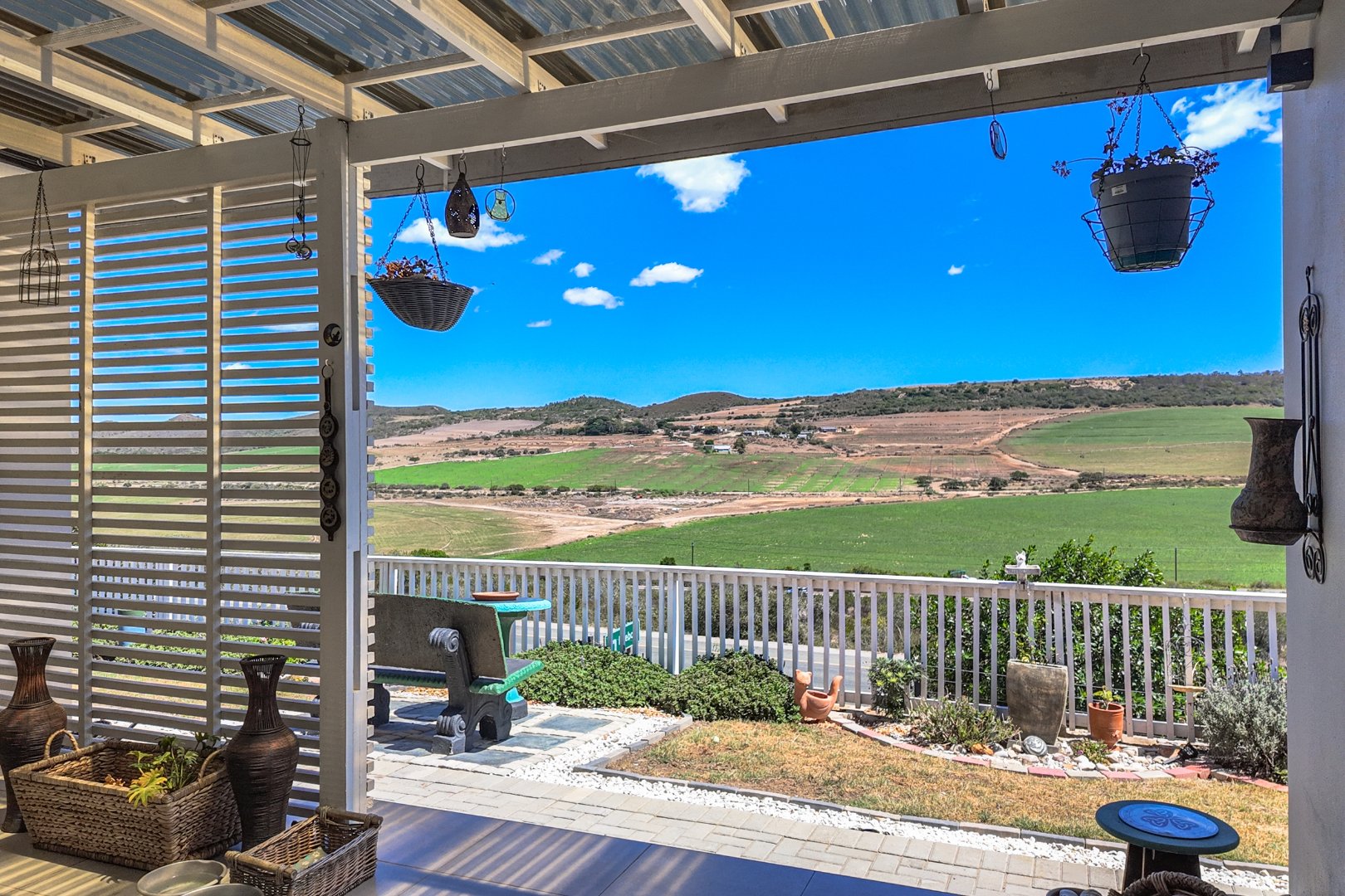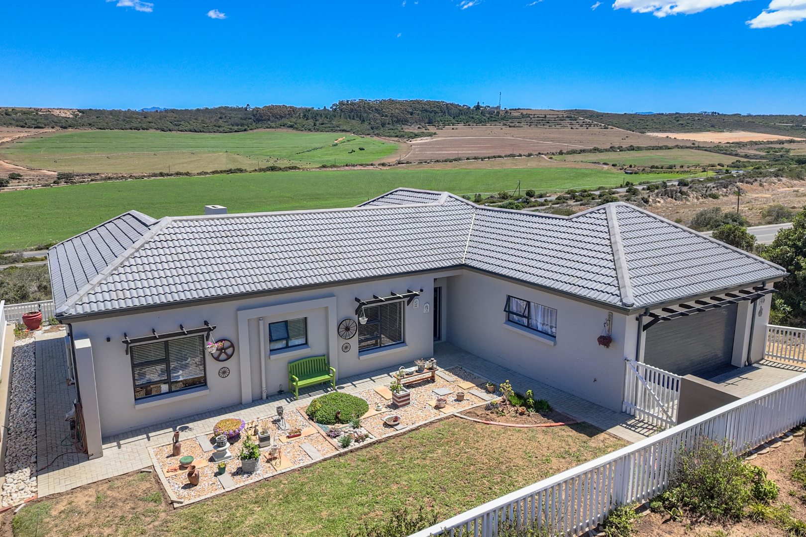 Discover this modern single-story home in the desirable coastal area of Reebok, Groot Brakrivier. Boasting a contemporary light gray exterior and a gray tiled roof, this property offers immediate curb appeal. Enjoy panoramic scenic views of expansive green fields and distant rolling hills, providing a tranquil backdrop to everyday living. Reebok offers a serene coastal lifestyle, perfect for those seeking peace and natural beauty.