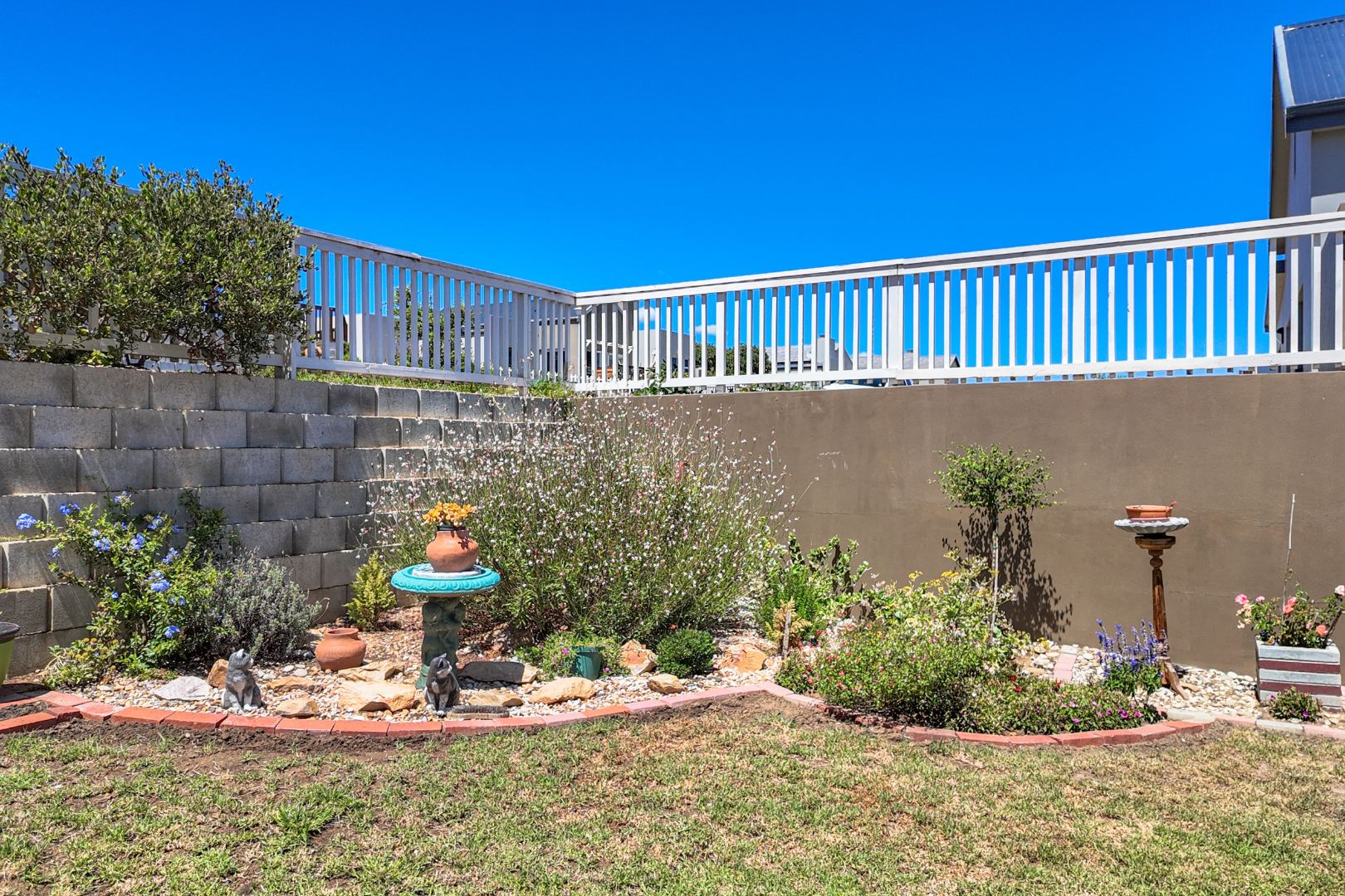 The outdoor areas are designed for enjoyment and low maintenance. A charming, decorative front garden with gravel and varied plantings welcomes you, while the tiered backyard features a well-maintained garden bed, decorative elements, and a paved patio area with a built-in braai, perfect for outdoor entertaining. The property includes a double attached garage and additional parking, ensuring ample space for vehicles. Pets are allowed, making it a true family home.