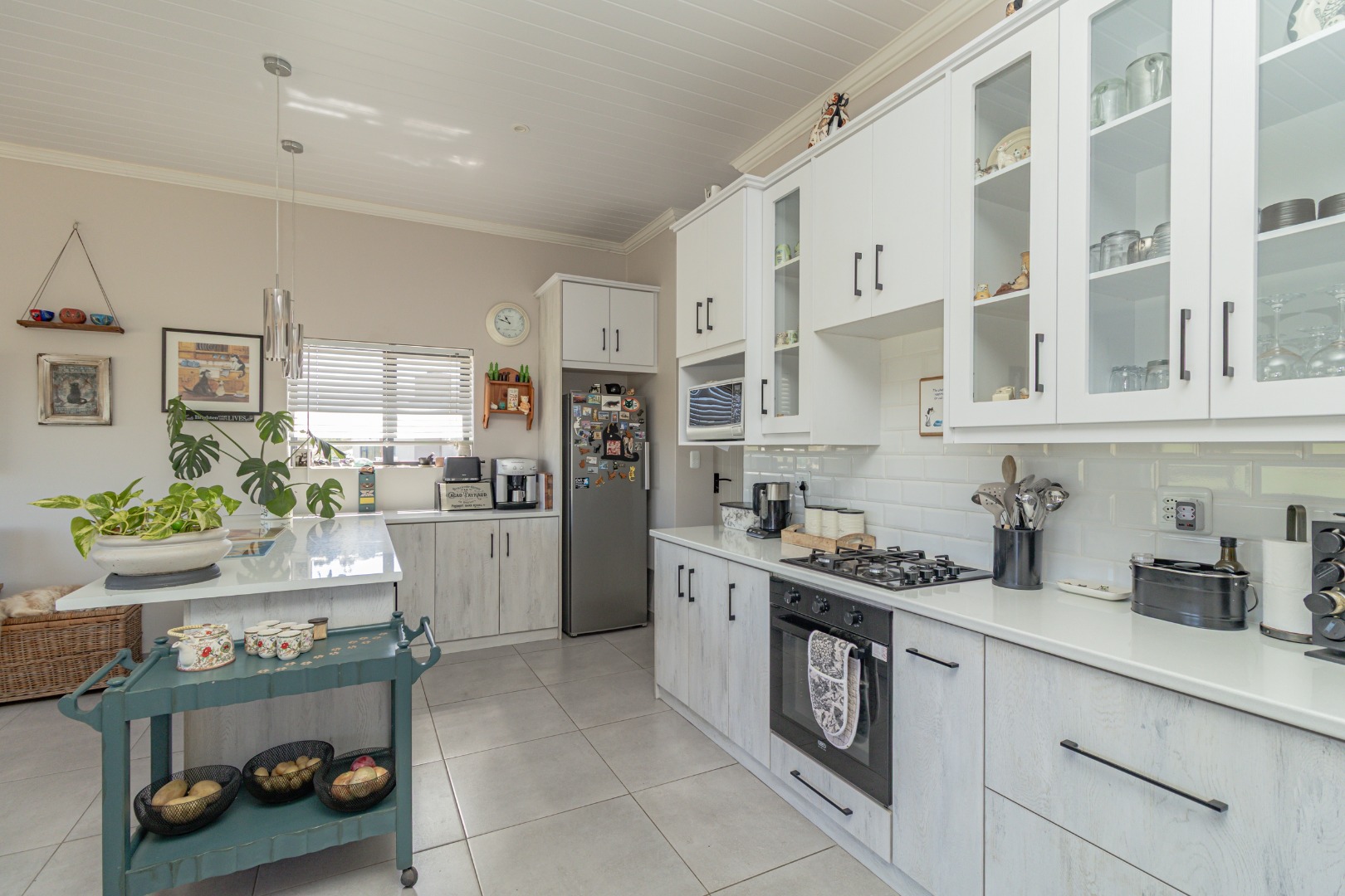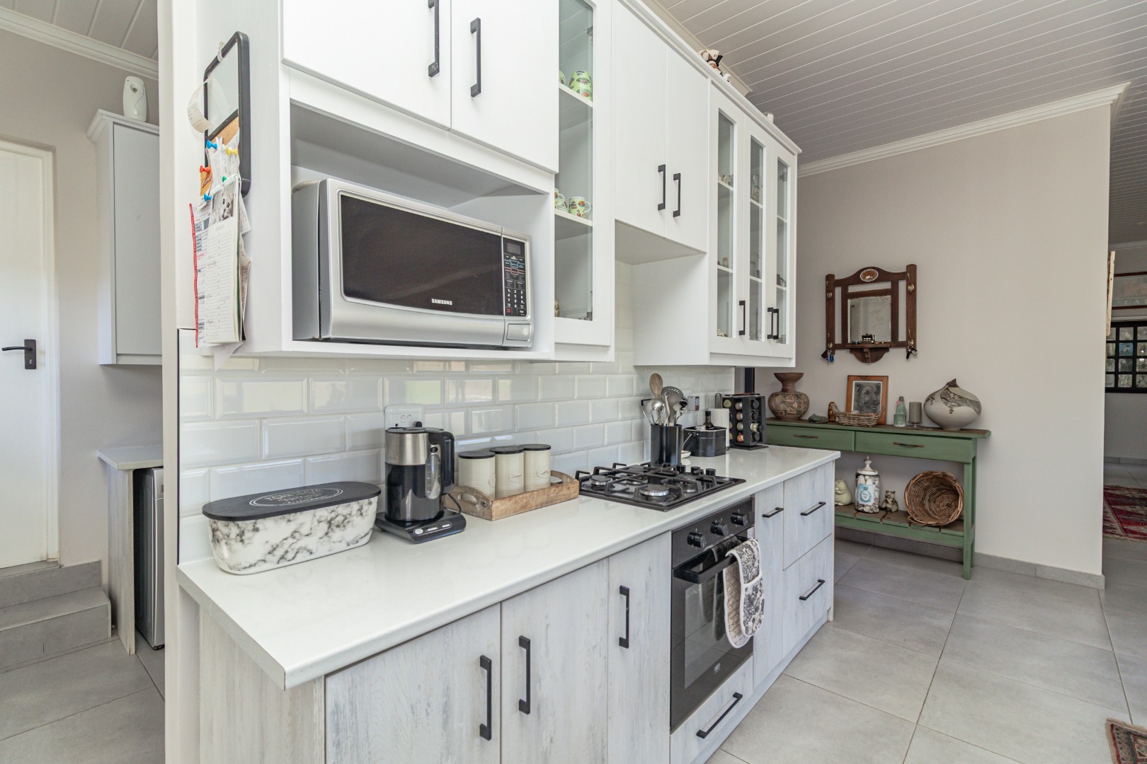 Step inside to an inviting open-plan living space, designed for comfort and modern functionality. The heart of the home is a bright kitchen featuring sleek white and light wood-grain cabinetry, complemented by a white subway tile backsplash and durable tiled flooring. Equipped with a built-in oven, gas hob, and a convenient island/breakfast bar, this kitchen is ideal for both daily meals and entertaining. Ample natural light floods the area, enhancing the spacious feel.