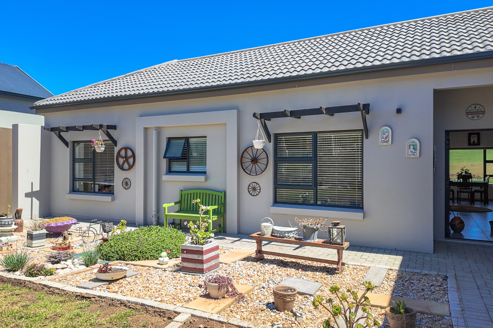 The outdoor areas are designed for enjoyment and low maintenance. A charming, decorative front garden with gravel and varied plantings welcomes you, while the tiered backyard features a well-maintained garden bed, decorative elements, and a paved patio area with a built-in braai, perfect for outdoor entertaining. The property includes a double attached garage and additional parking, ensuring ample space for vehicles. Pets are allowed, making it a true family home.