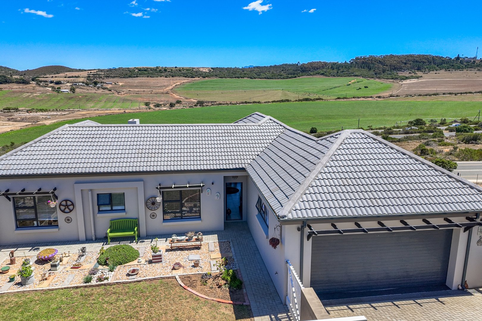 Discover this modern single-story home in the desirable coastal area of Reebok, Groot Brakrivier. Boasting a contemporary light gray exterior and a gray tiled roof, this property offers immediate curb appeal. Enjoy panoramic scenic views of expansive green fields and distant rolling hills, providing a tranquil backdrop to everyday living. Reebok offers a serene coastal lifestyle, perfect for those seeking peace and natural beauty.