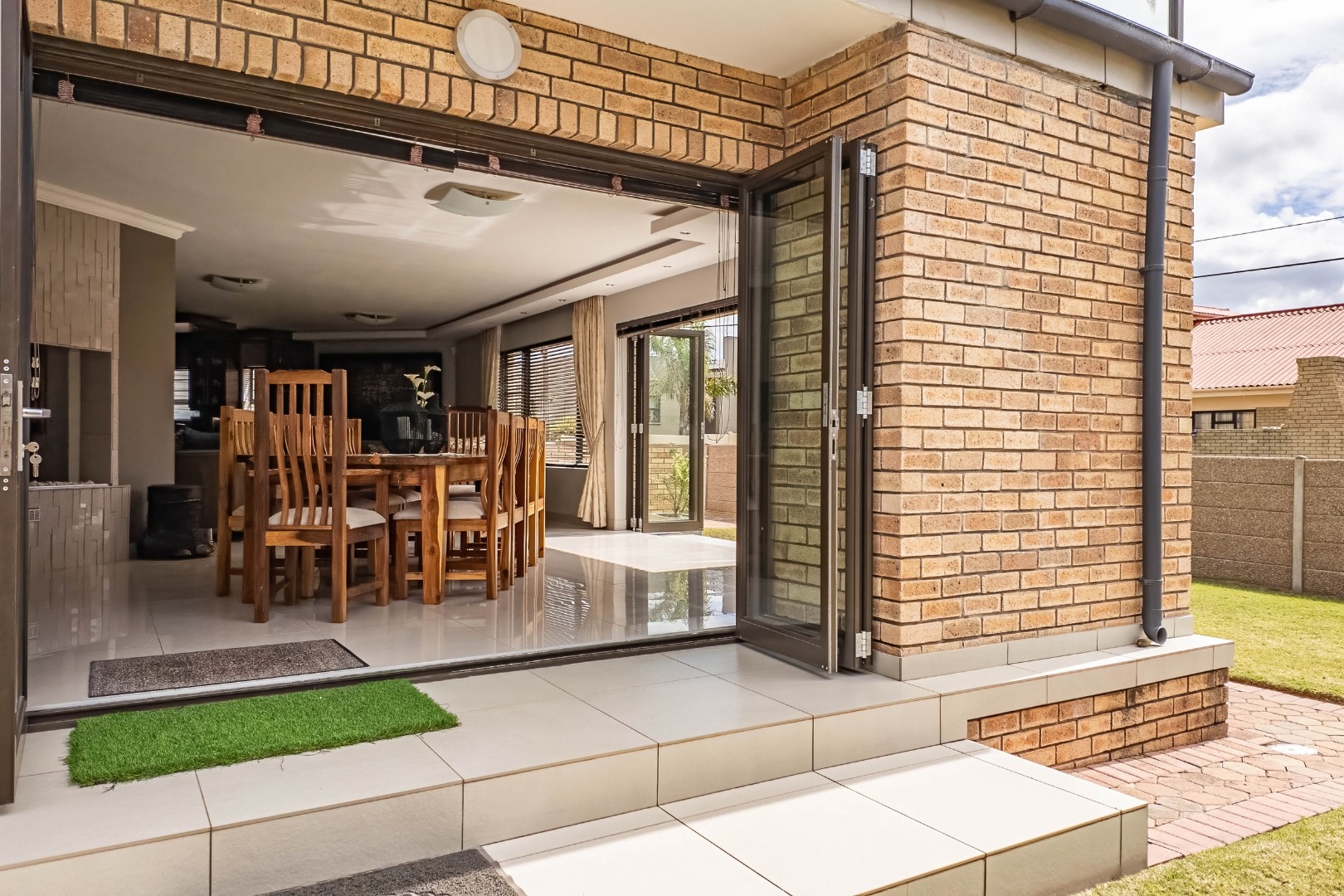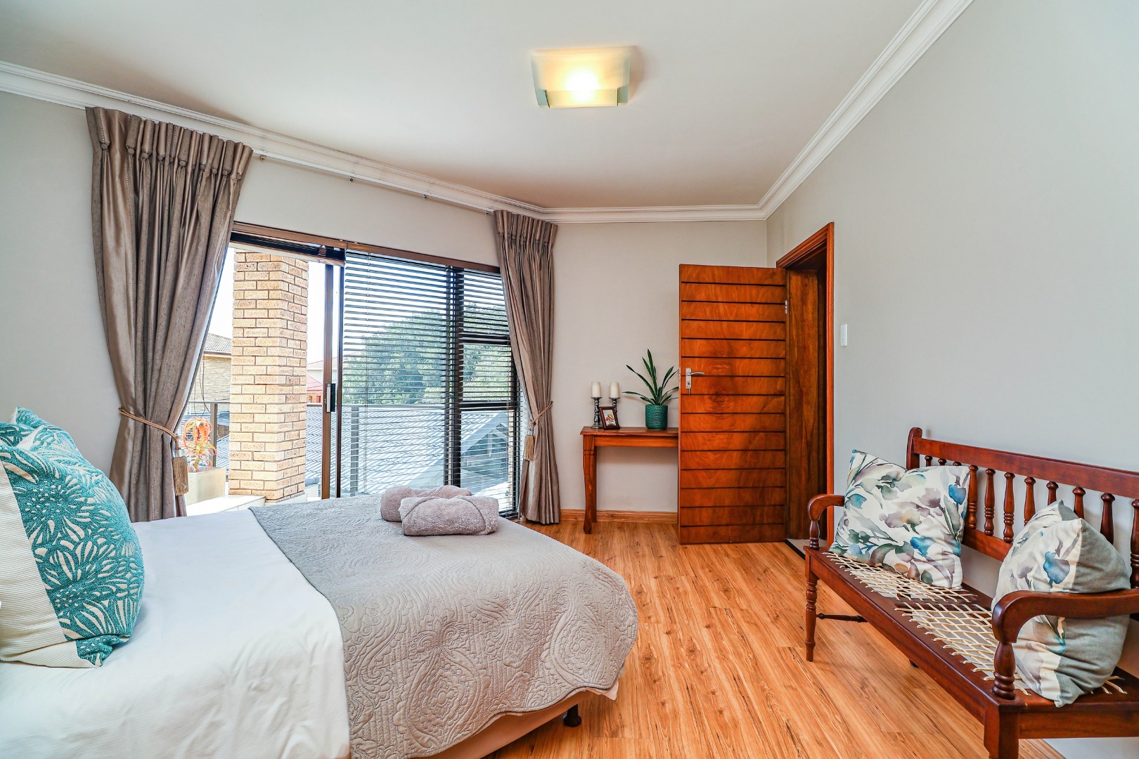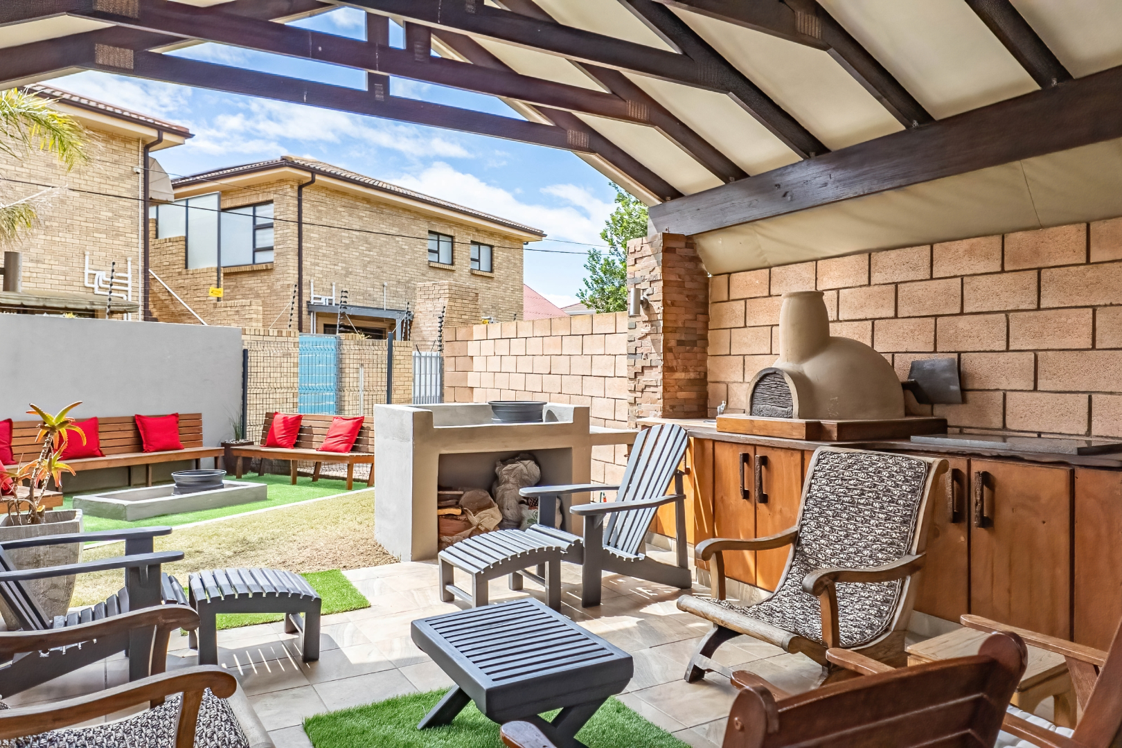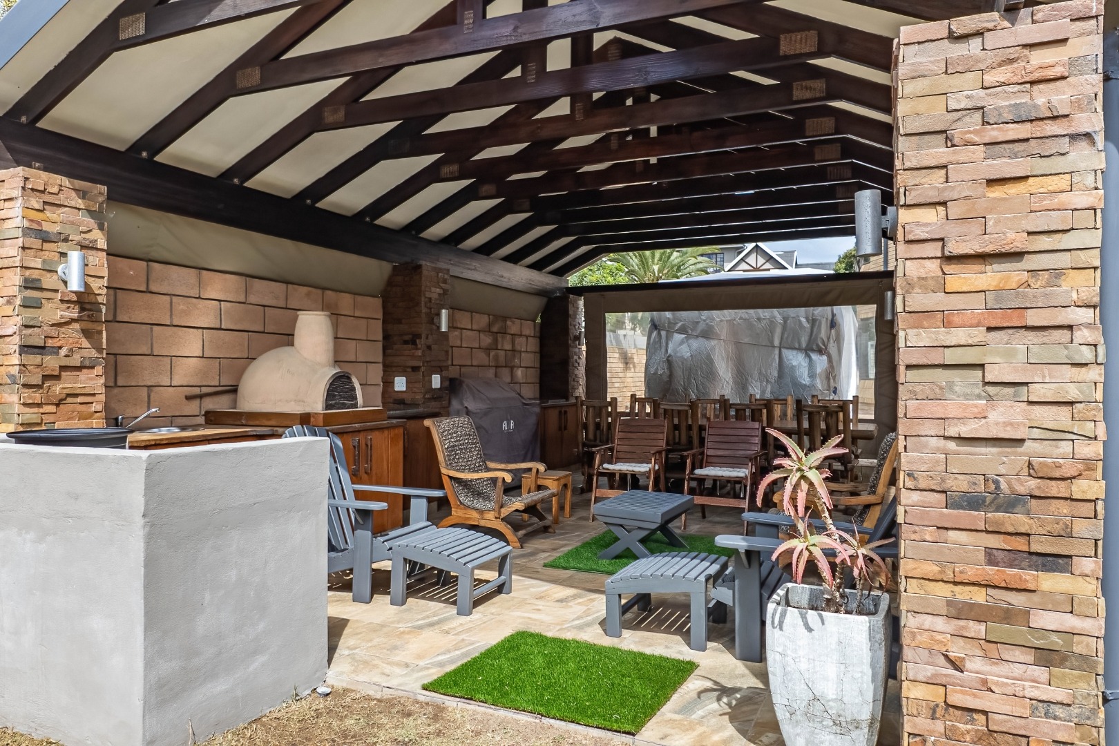 Outdoor living is equally sublime, with multiple balconies, a spacious patio, and a lapa providing idyllic settings for relaxation and al fresco dining. The charming lapa offers a shaded retreat, perfect for enjoying the South African climate. The meticulously maintained garden, complete with an irrigation system and sprinklers, ensures lush greenery year-round. The property is totally walled, providing enhanced privacy and security, further bolstered by an alarm system and intercom. Pets are welcome, making this a truly inclusive family home.