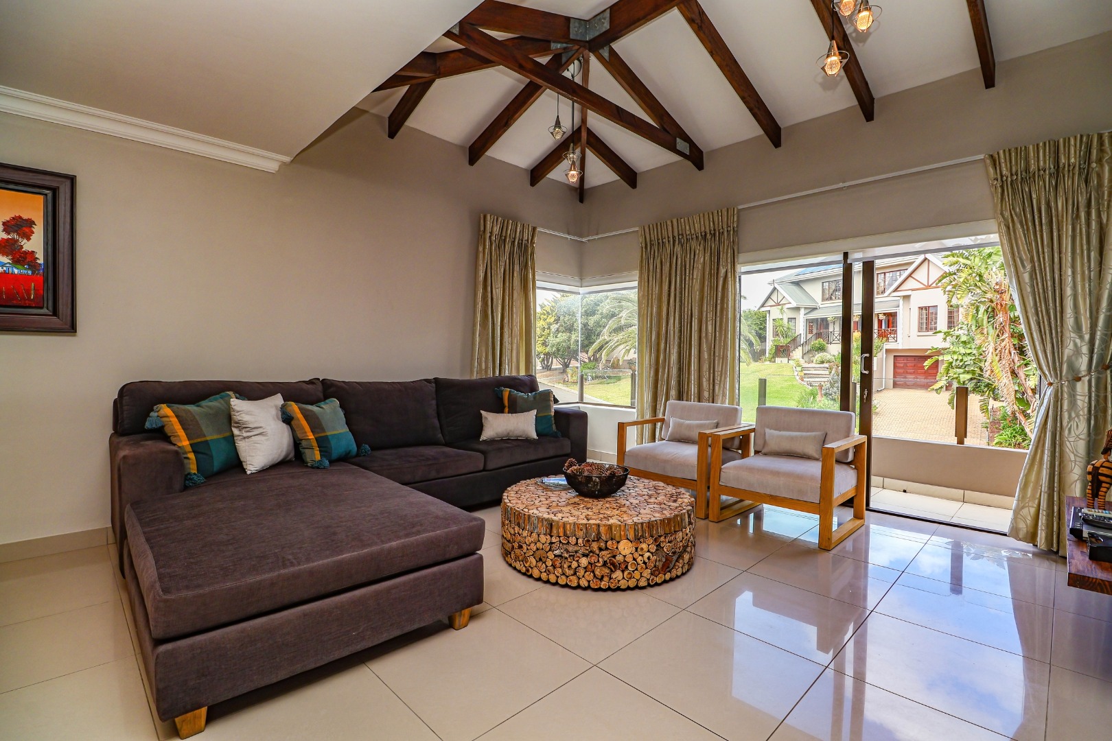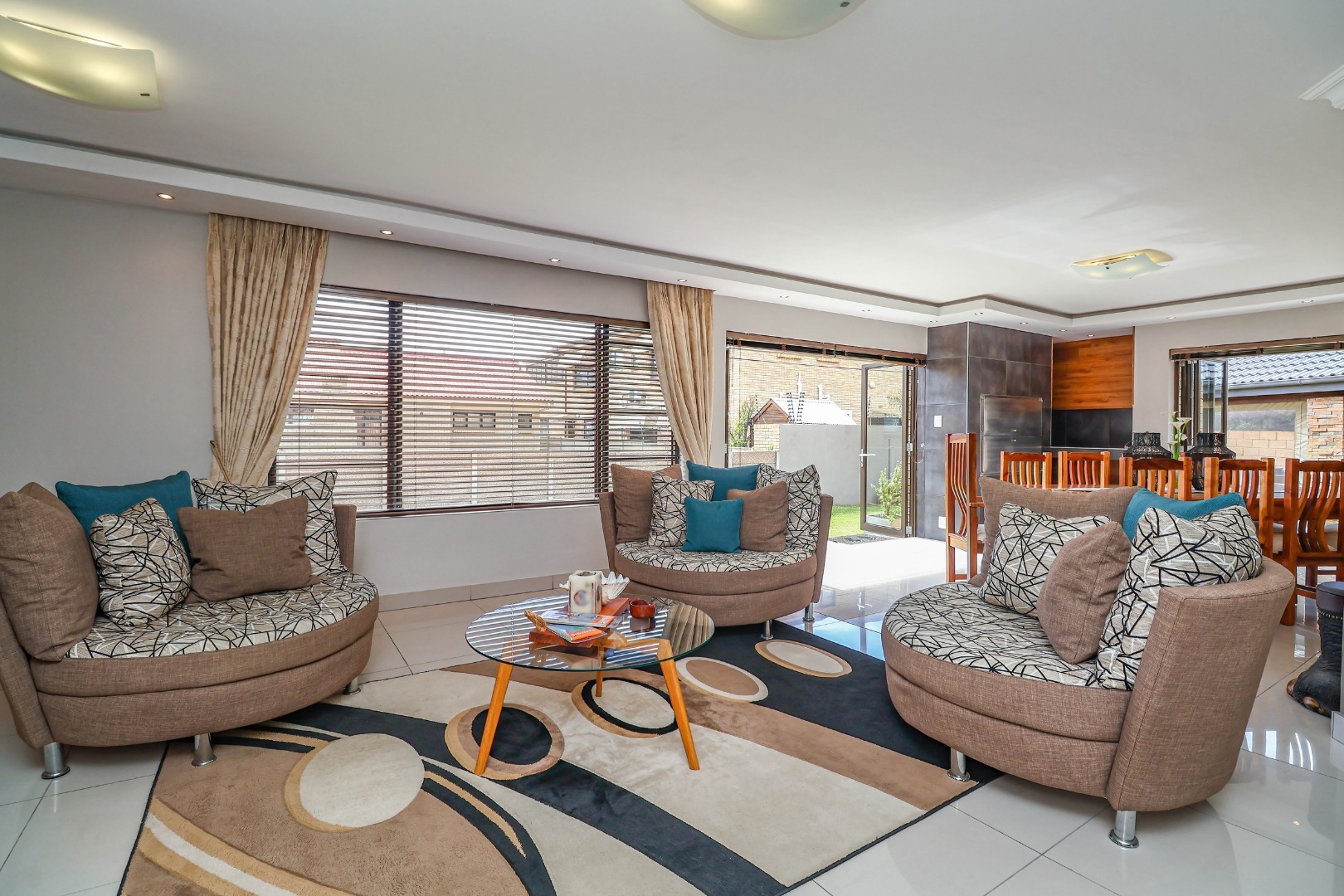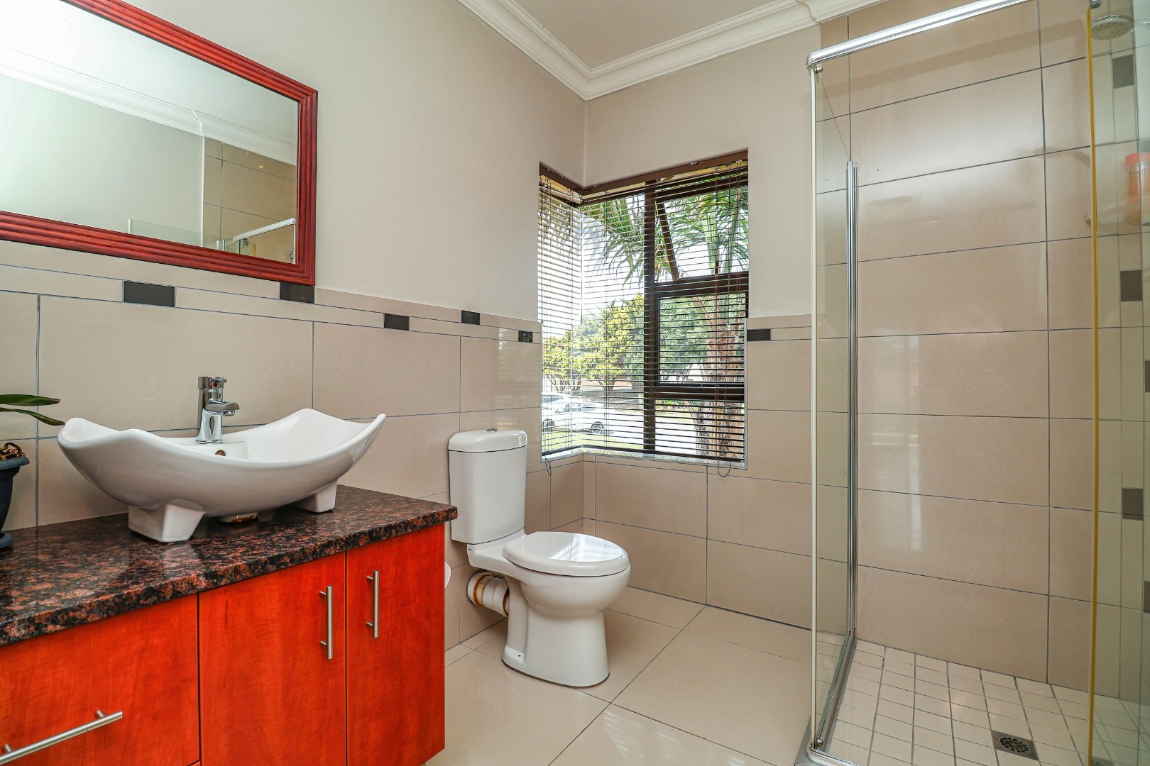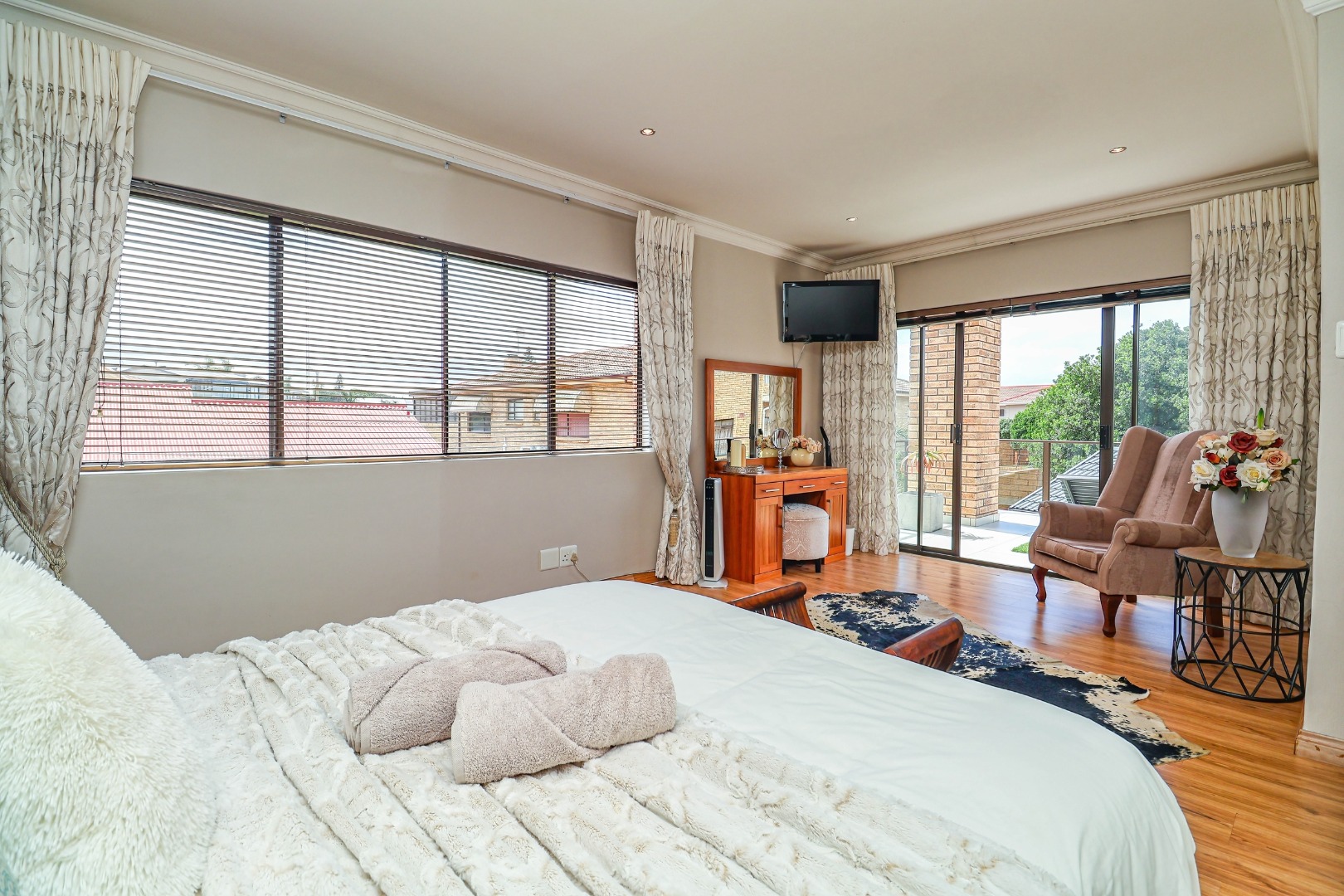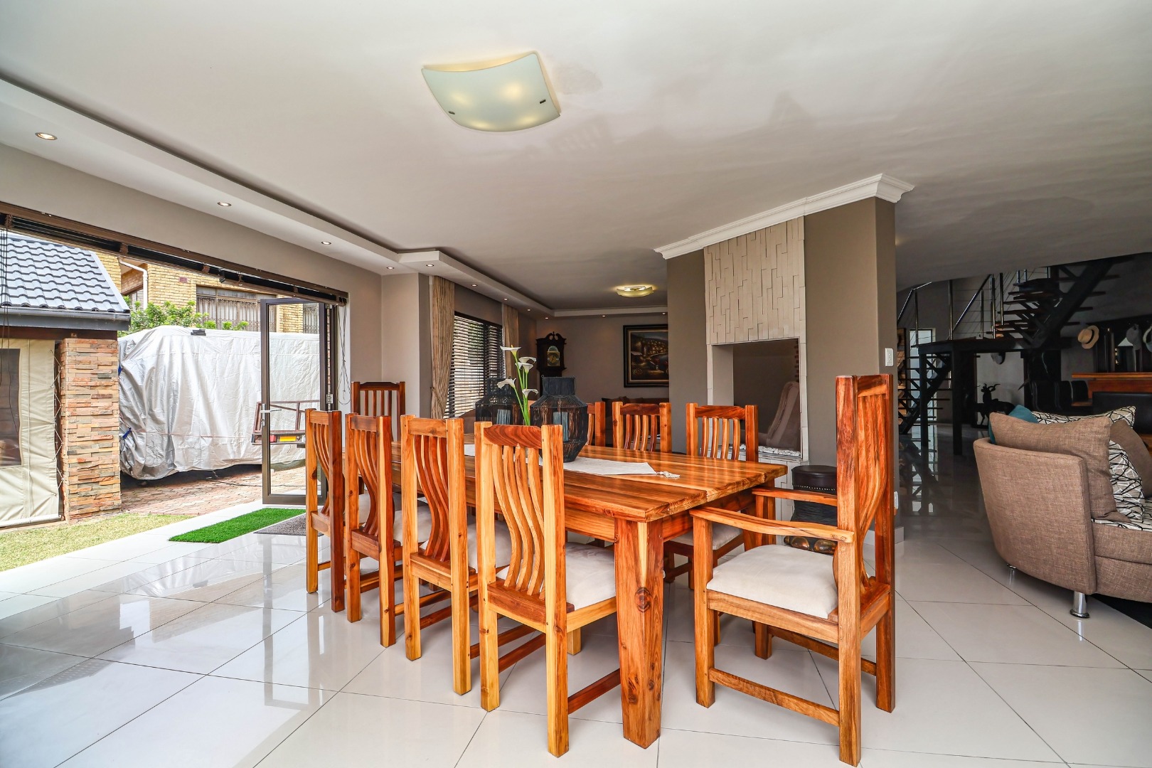 Outdoor living is equally sublime, with multiple balconies, a spacious patio, and a lapa providing idyllic settings for relaxation and al fresco dining. The charming lapa offers a shaded retreat, perfect for enjoying the South African climate. The meticulously maintained garden, complete with an irrigation system and sprinklers, ensures lush greenery year-round. The property is totally walled, providing enhanced privacy and security, further bolstered by an alarm system and intercom. Pets are welcome, making this a truly inclusive family home.