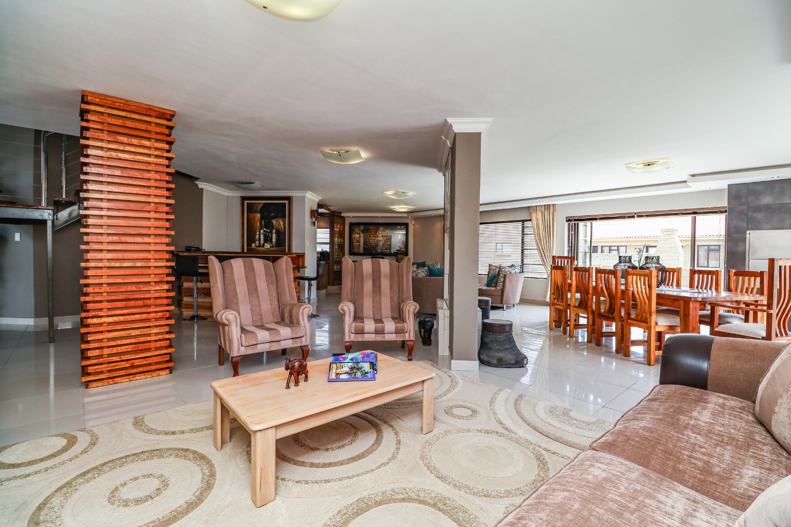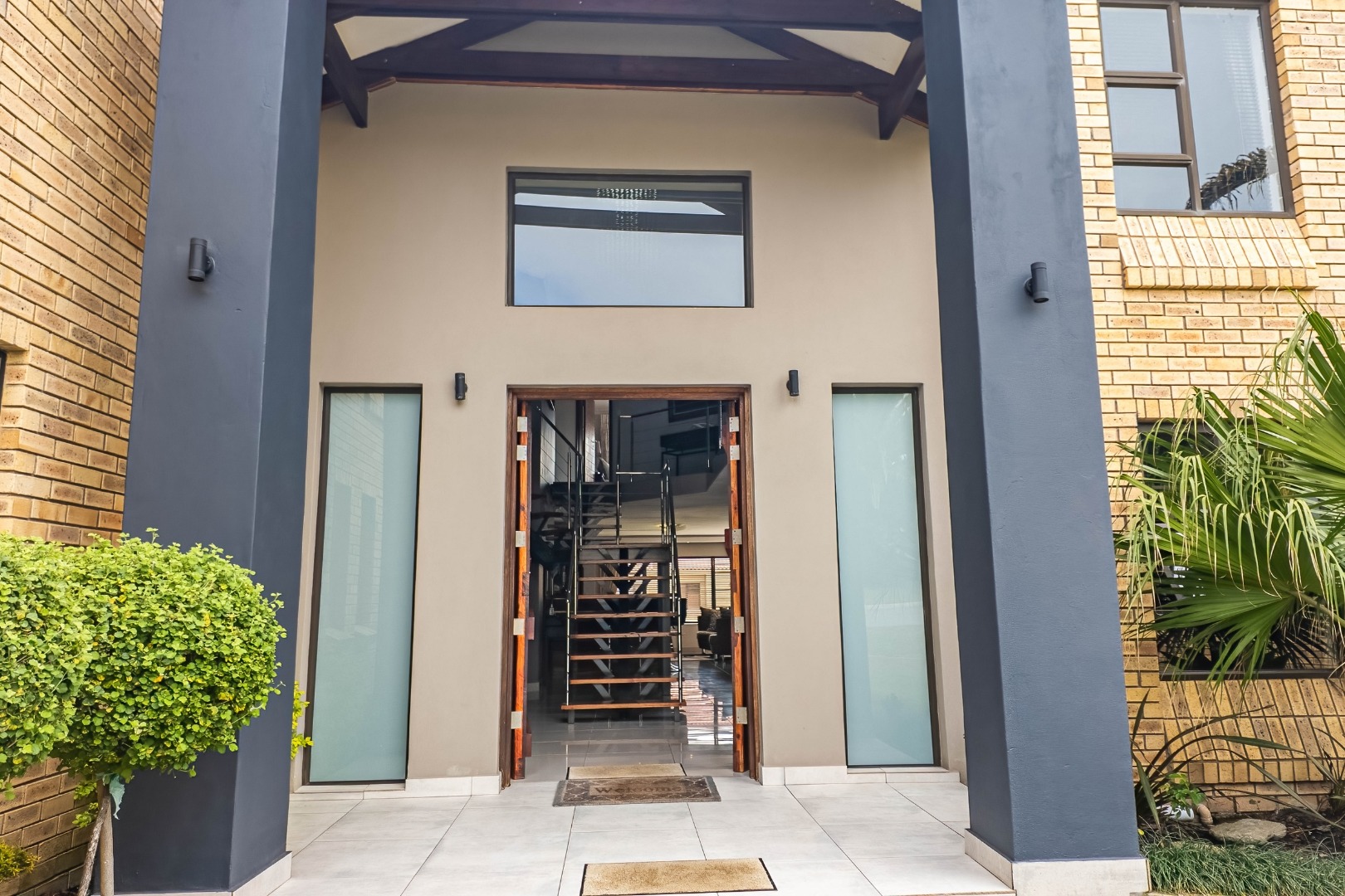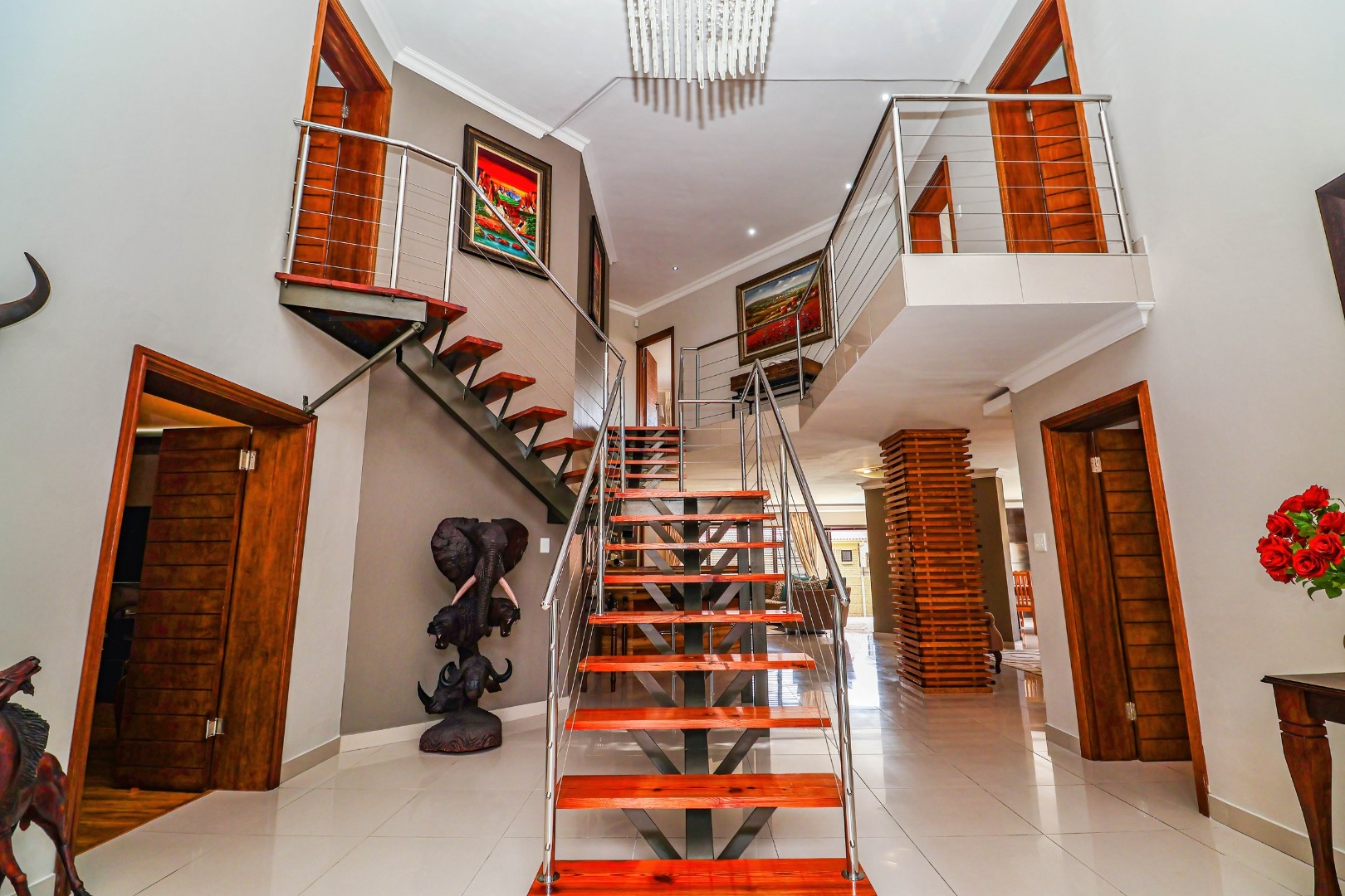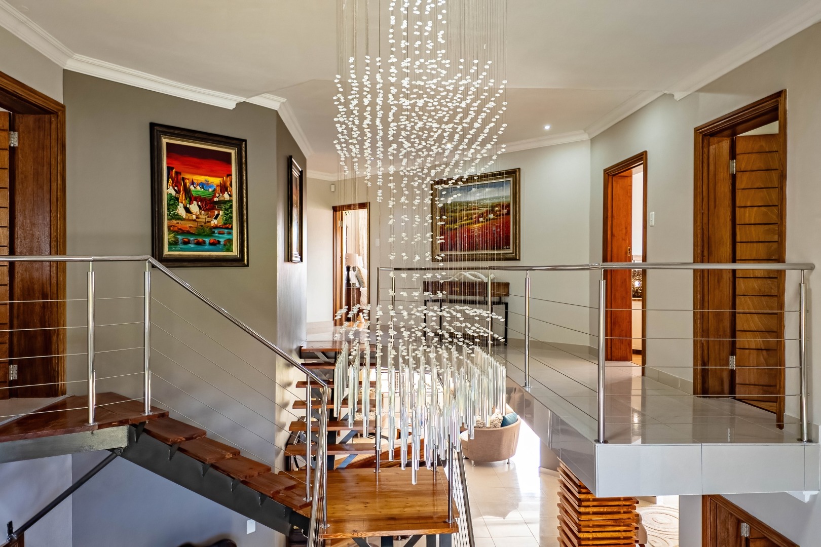 Step inside to discover a world of grandeur, where a multi-level entryway unfolds beneath soaring high ceilings. Ornate wooden double doors, a testament to bespoke craftsmanship, invite you into a luminous foyer adorned with pristine tiled floors and subtle light grey walls. The eye is immediately drawn to the architectural marvel of the open-tread wooden staircase, featuring sleek stainless steel railings, which ascends gracefully to the upper levels. This impressive space is further enhanced by a striking multi-tiered chandelier and strategically placed recessed lighting, illuminating large, impactful artworks and unique decorative sculptures. The residence boasts an exceptional layout designed for both lavish entertaining and intimate family life, offering three distinct lounges, two elegant dining rooms, and a dedicated Cinema room. The open-plan design, complemented by sliding doors and special lighting, creates an effortless flow throughout, while a built-in bar and a cozy fireplace add to the allure of the living spaces. The two state-of-the-art kitchens, complete with a vast pantry, cater to every culinary desire, supported by a dedicated scullery, laundry and ample storage.