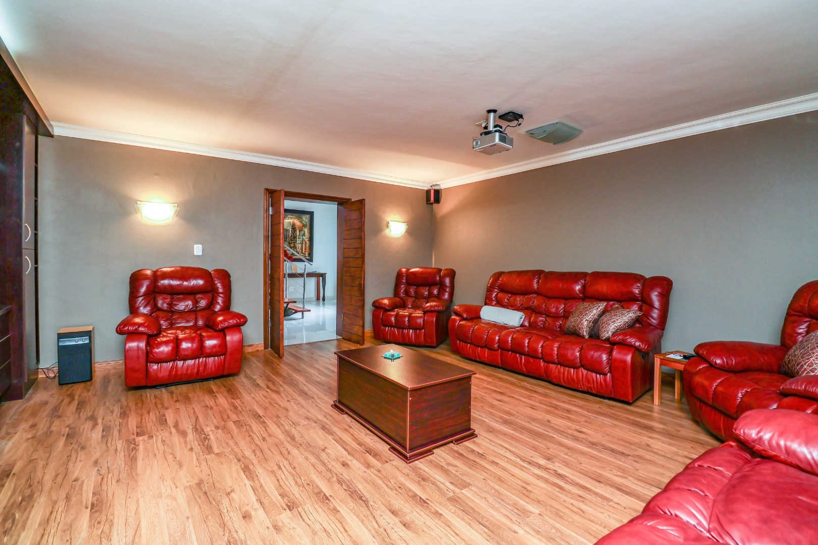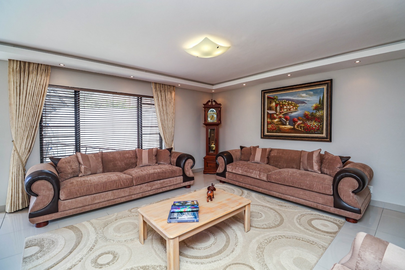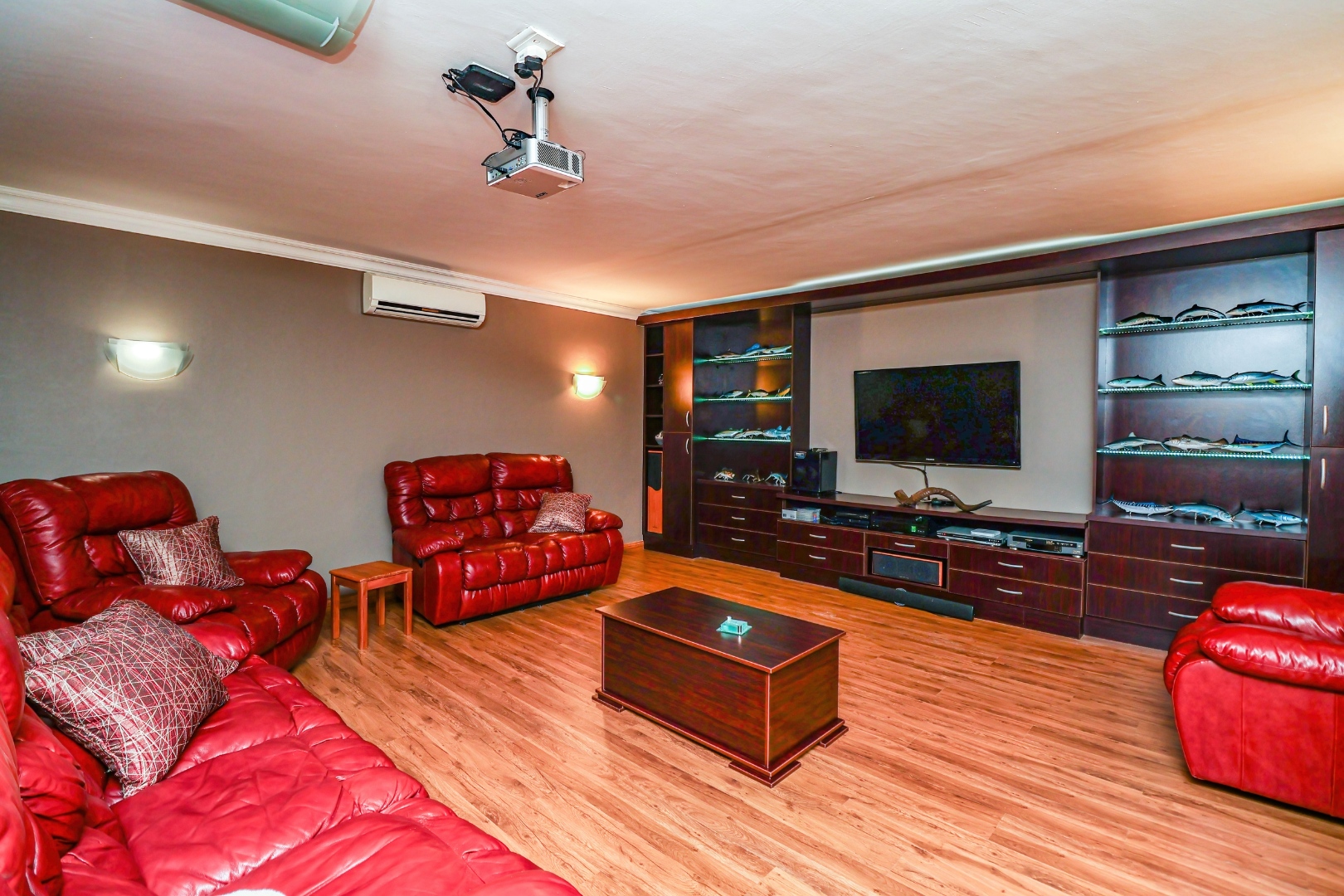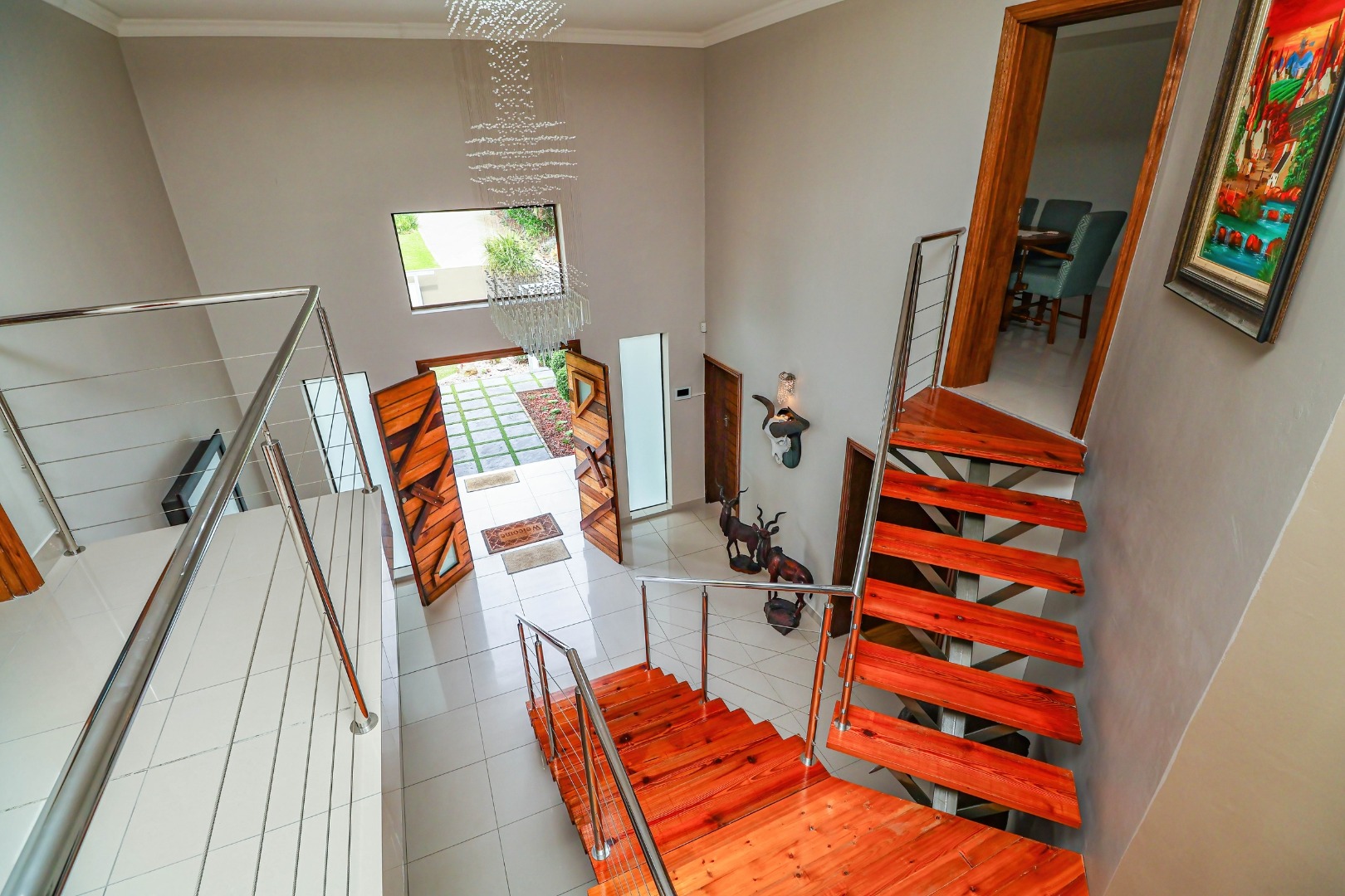 Step inside to discover a world of grandeur, where a multi-level entryway unfolds beneath soaring high ceilings. Ornate wooden double doors, a testament to bespoke craftsmanship, invite you into a luminous foyer adorned with pristine tiled floors and subtle light grey walls. The eye is immediately drawn to the architectural marvel of the open-tread wooden staircase, featuring sleek stainless steel railings, which ascends gracefully to the upper levels. This impressive space is further enhanced by a striking multi-tiered chandelier and strategically placed recessed lighting, illuminating large, impactful artworks and unique decorative sculptures. The residence boasts an exceptional layout designed for both lavish entertaining and intimate family life, offering three distinct lounges, two elegant dining rooms, and a dedicated Cinema room. The open-plan design, complemented by sliding doors and special lighting, creates an effortless flow throughout, while a built-in bar and a cozy fireplace add to the allure of the living spaces. The two state-of-the-art kitchens, complete with a vast pantry, cater to every culinary desire, supported by a dedicated scullery, laundry and ample storage.