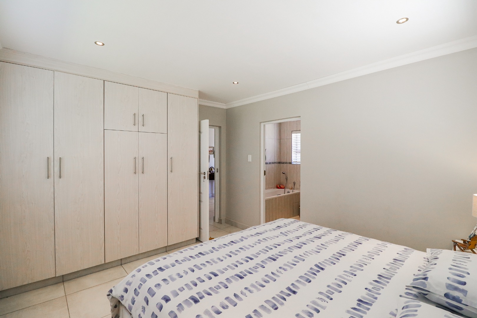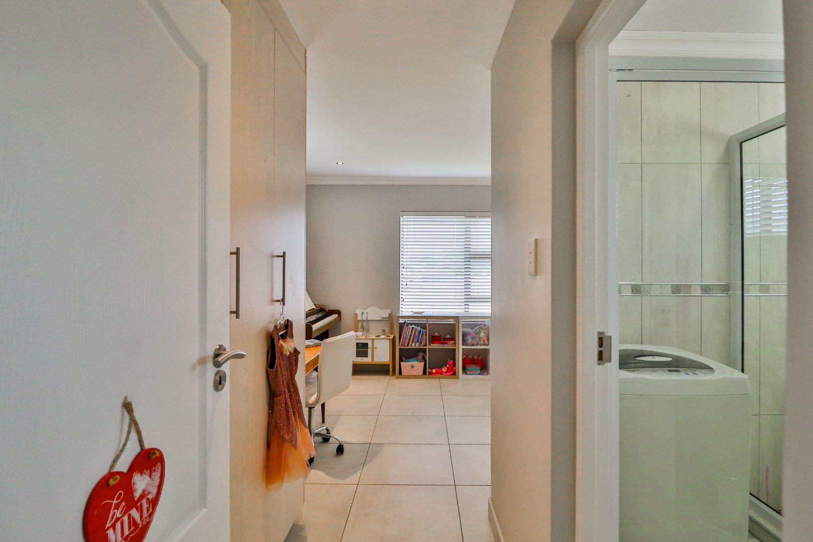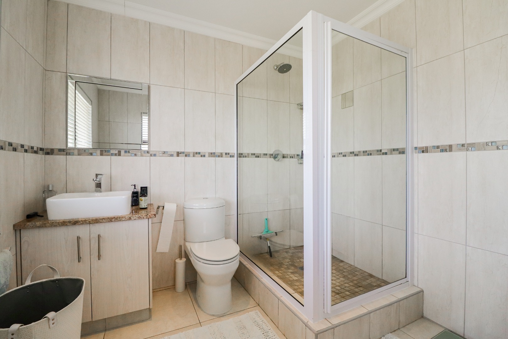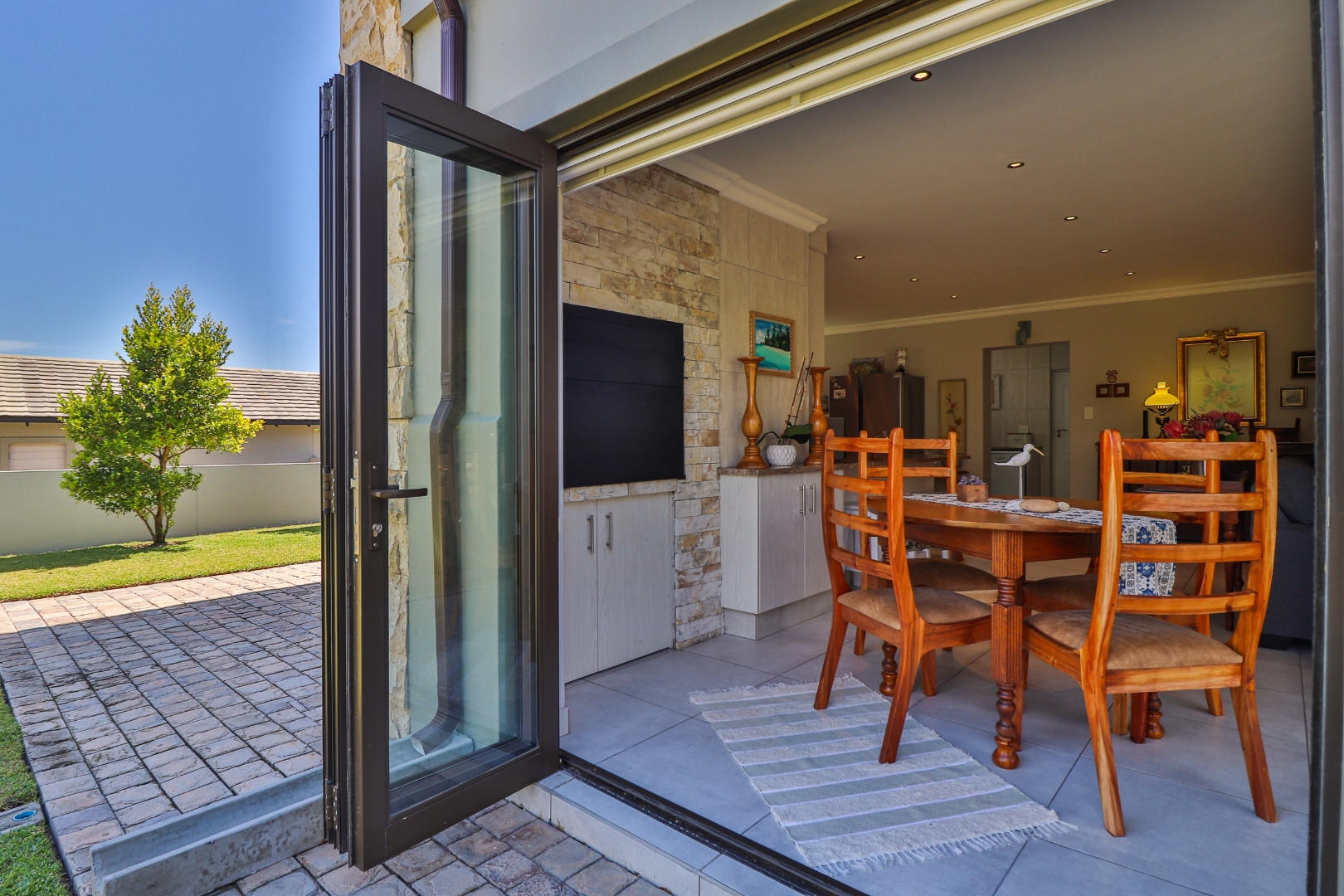 The well-designed dual-level floorplan boasts a total of 3 bright bedrooms, 3 elegant ensuite bathrooms, a separate guest bathroom, a welcoming entrance hall, vast open plan lounge and dining room that is delightfully served with an abundance of natural light filtering through a multitude of windowpanes and stacking doors. A beautifully assigned kitchen set in quality finishes and appliances, with separate scullery and laundry area, a covered patio that flows seamlessly from the interior entertainment area with a built-in braai towards a perfectly manicured garden, extended single and automated garage with additional storage space for all your extra’s!