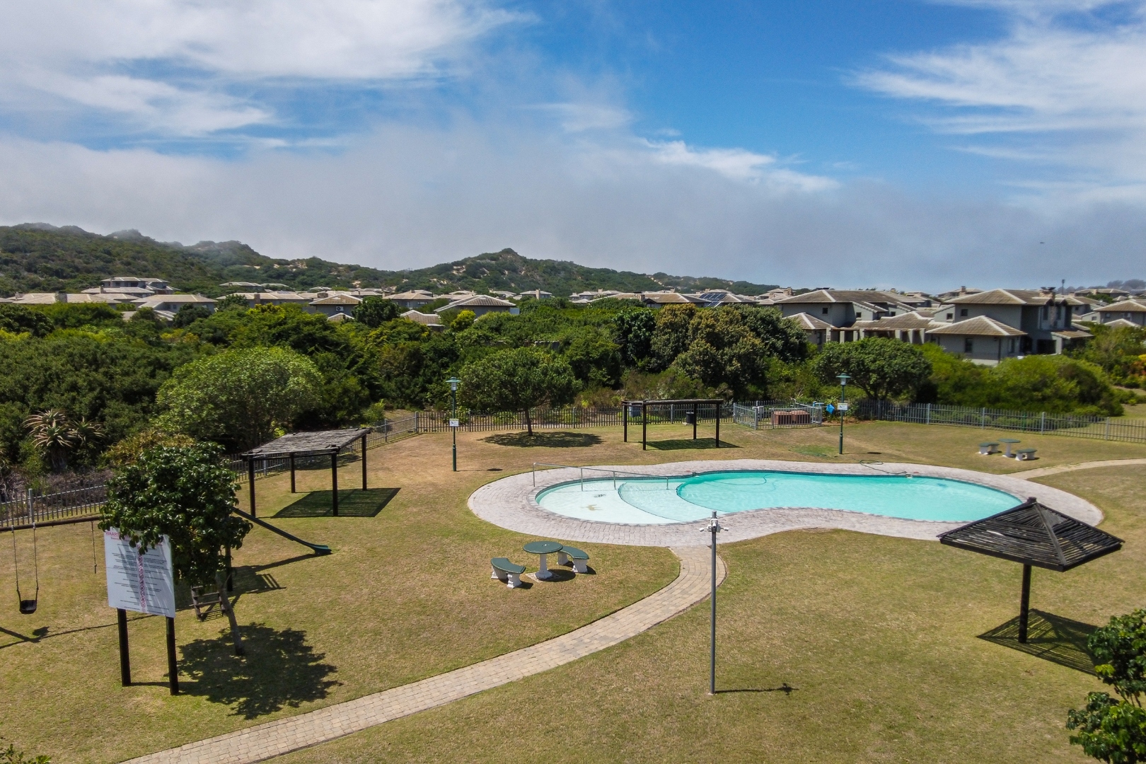 Lifestyle amenities includes a sparkling blue communal swimming pool, communal terraces with set footpaths crossing evergreen coastal fynbos, and direct beach-access from the estate.