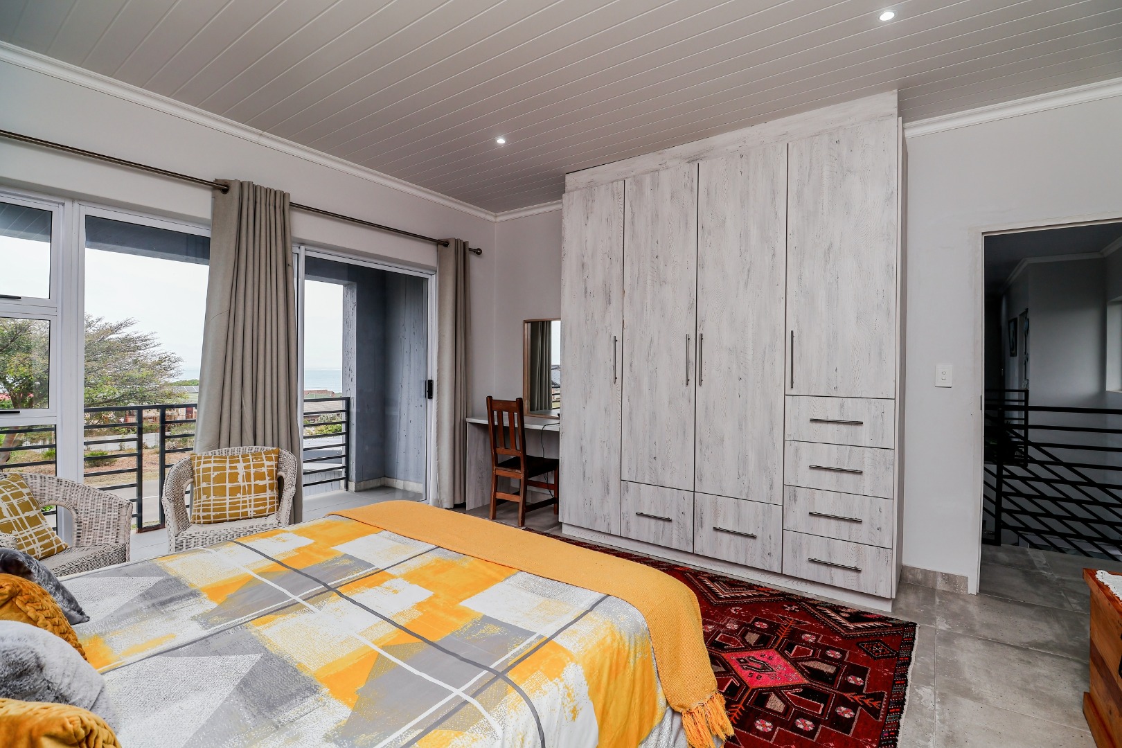 The outdoor spaces are equally impressive, designed for leisure and enjoyment. A private balcony invites you to savour the captivating sea vistas, while the built-in braai and dedicated braai room provide the perfect setting for alfresco dining and entertaining. The meticulously maintained garden, complete with an irrigation system and elegant paving, offers a serene retreat. A double garage provides secure parking, and the property is pet-friendly, ensuring every family member feels at home.