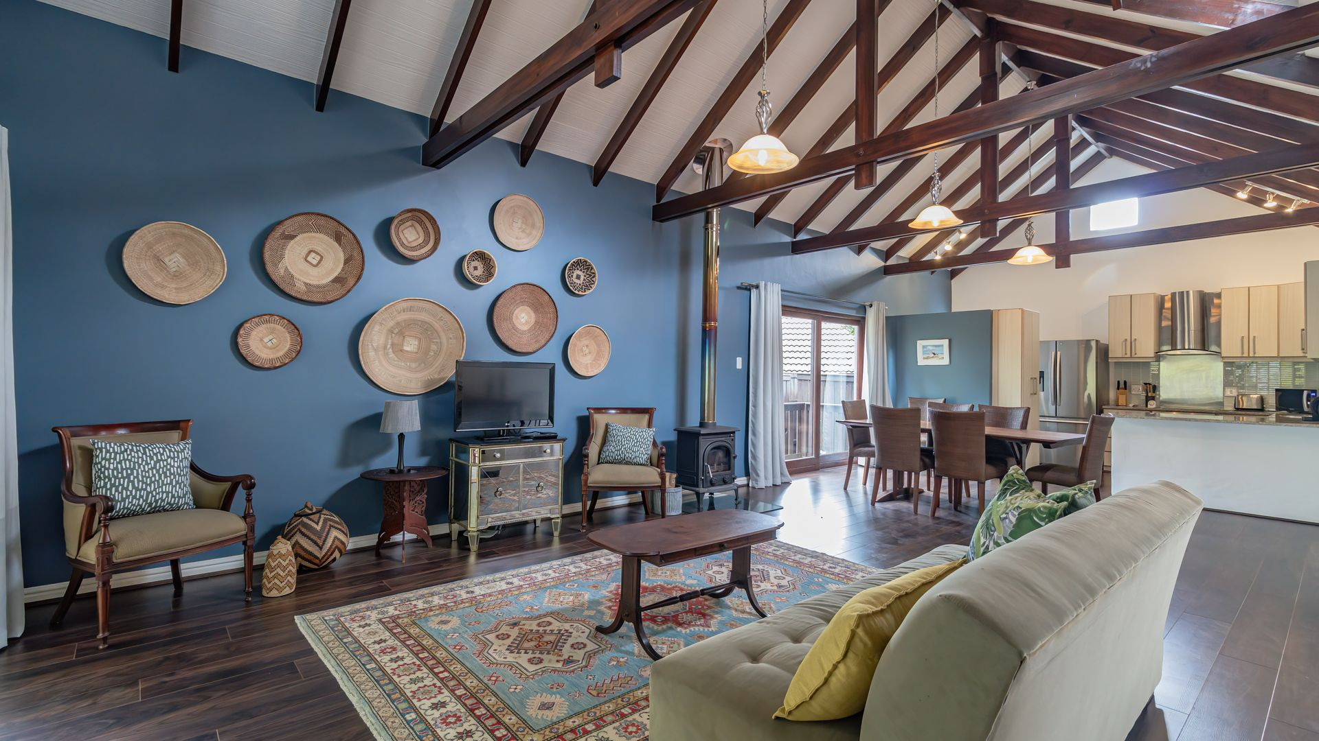 The lounge opens onto a covered patio overlooking the natural garden and greenbelt beyond, creating a private outdoor space for entertaining or quiet relaxation. A second sliding door on the west side of the home opens onto a small verandah, allowing additional light into the living area and creating a natural cross-draft that is especially welcome during warm summer days.