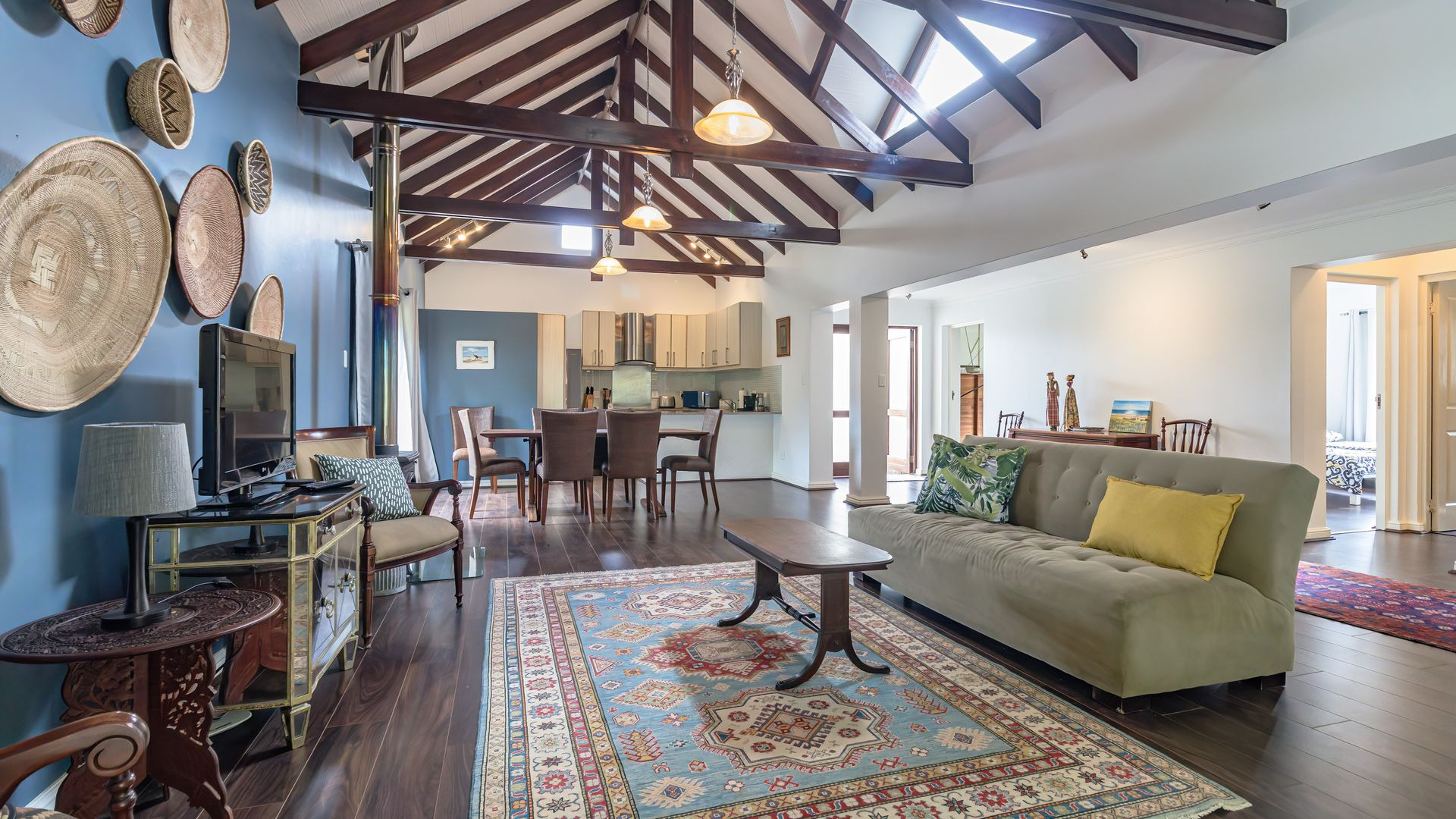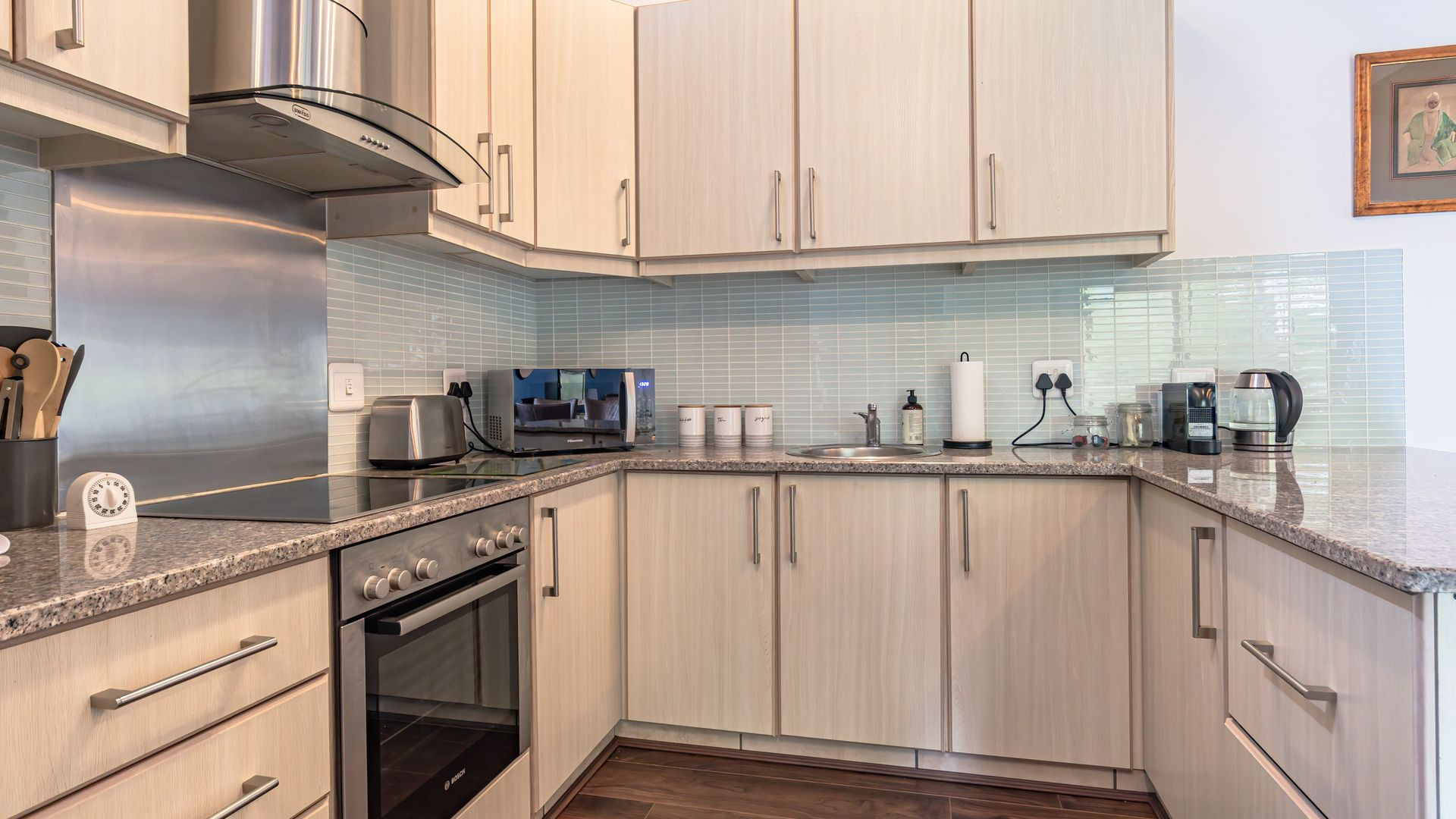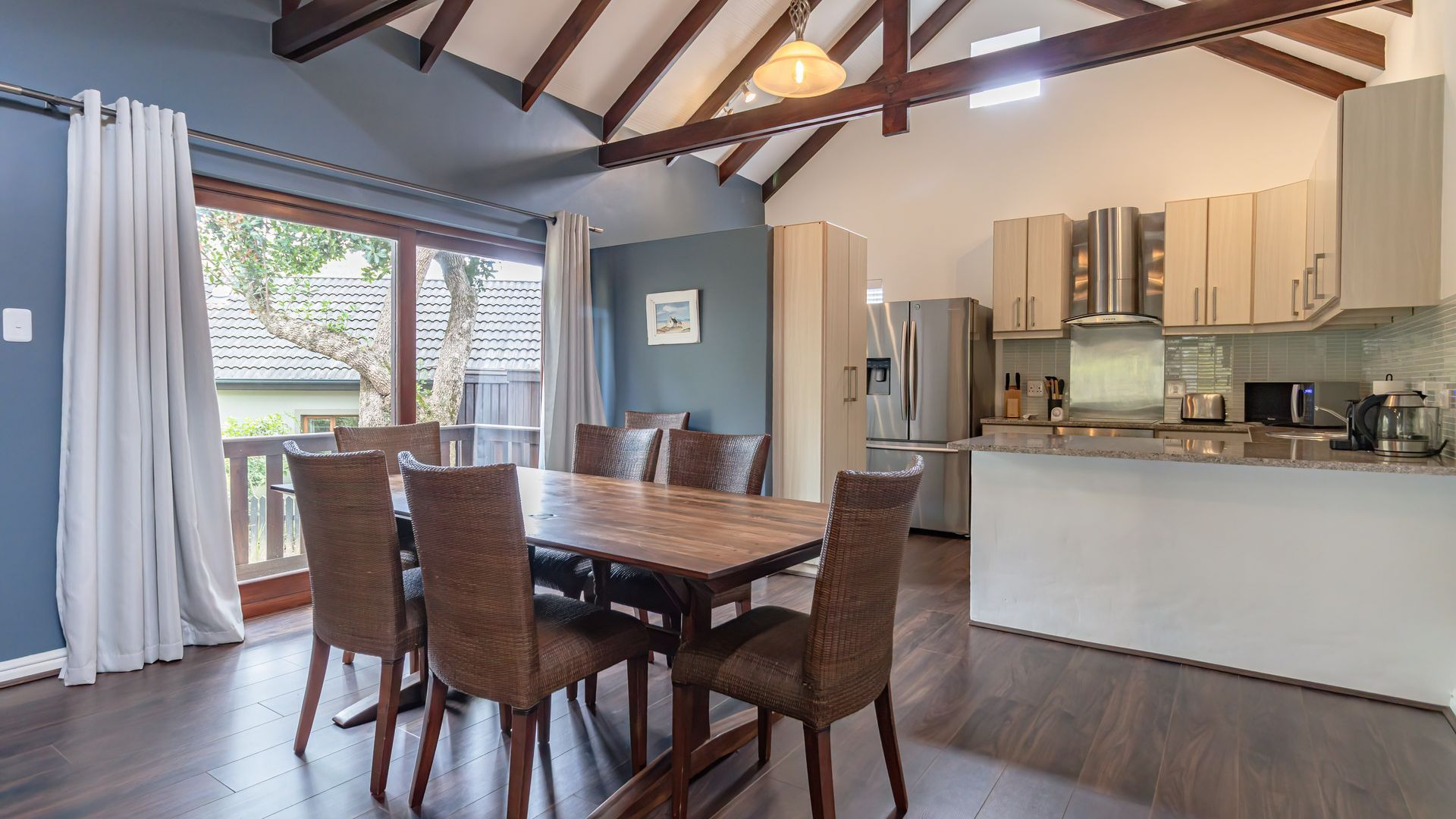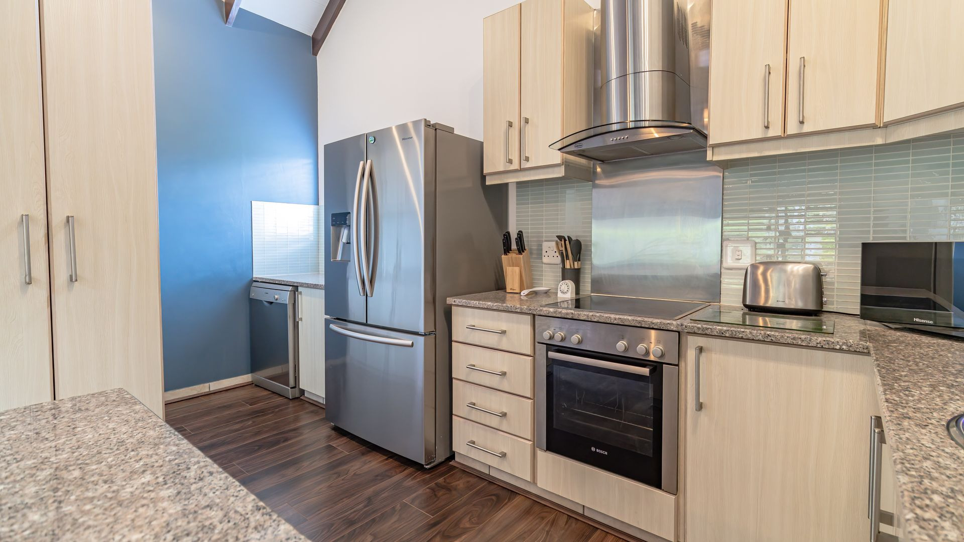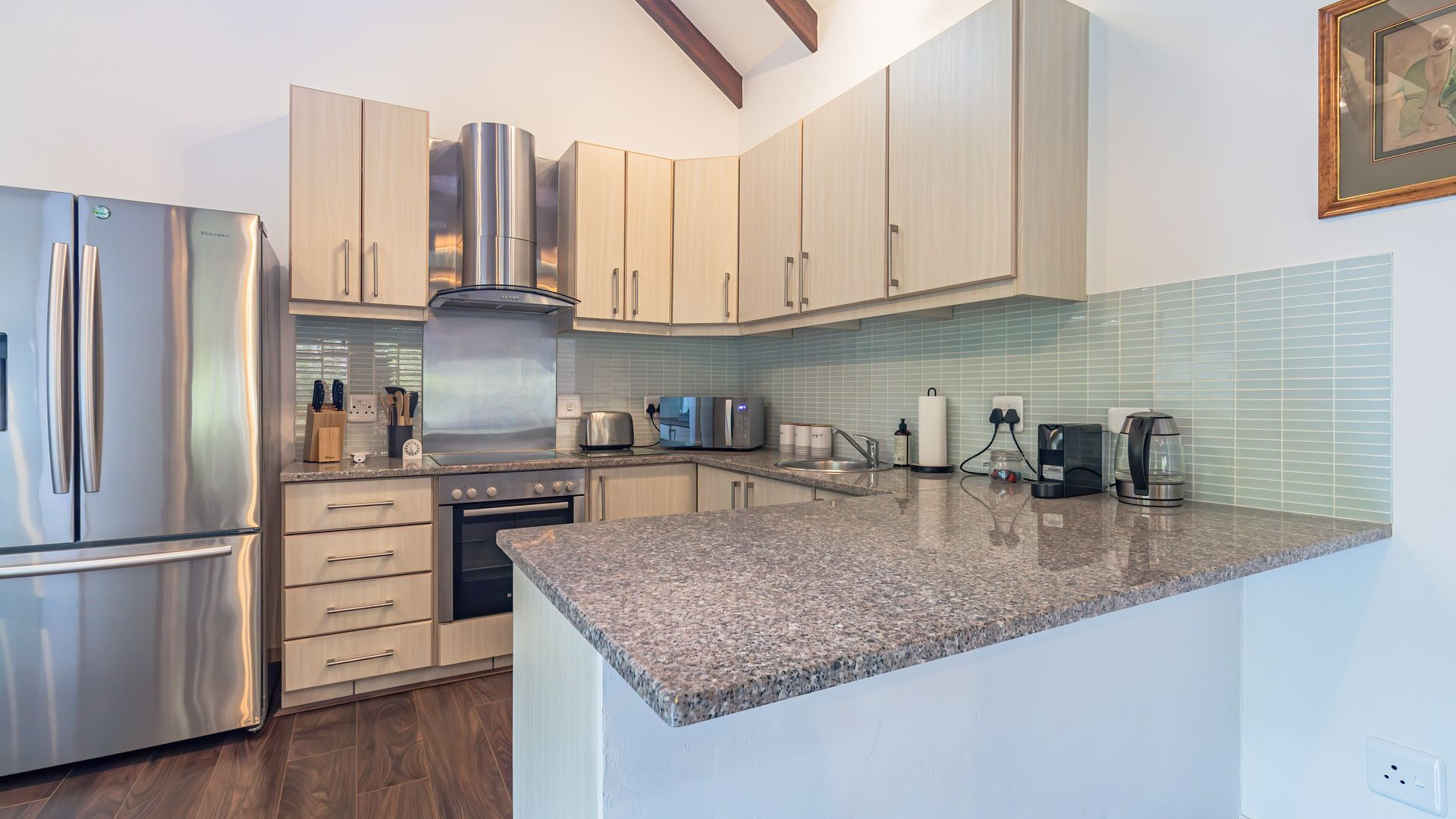 The interior is light, open, and notably spacious for a two-bedroom home. High-volume ceilings enhance the sense of scale, while the large open-plan lounge and dining area connect seamlessly to a well-fitted kitchen with granite countertops. Durable vinyl flooring throughout keeps maintenance low and suits both permanent living and short-term rental use.