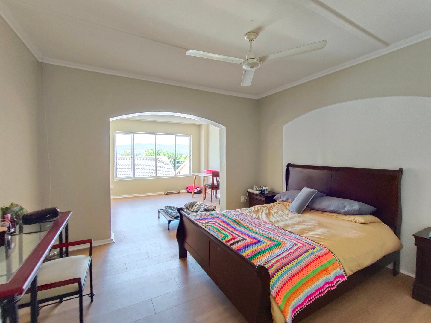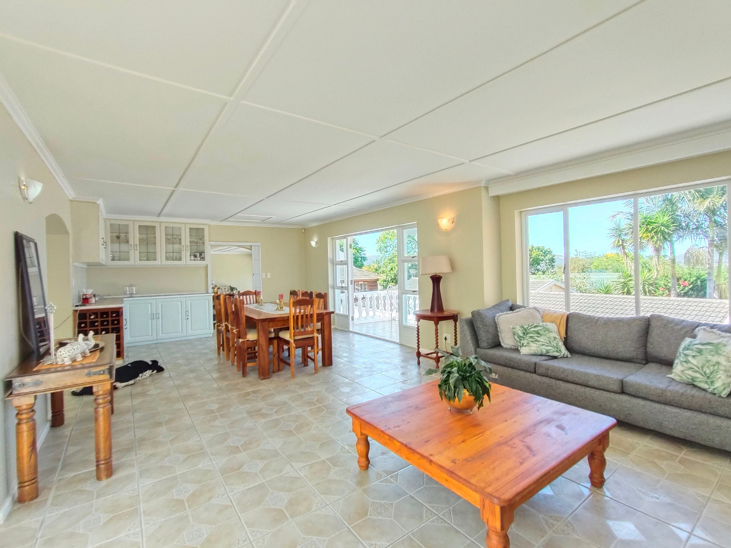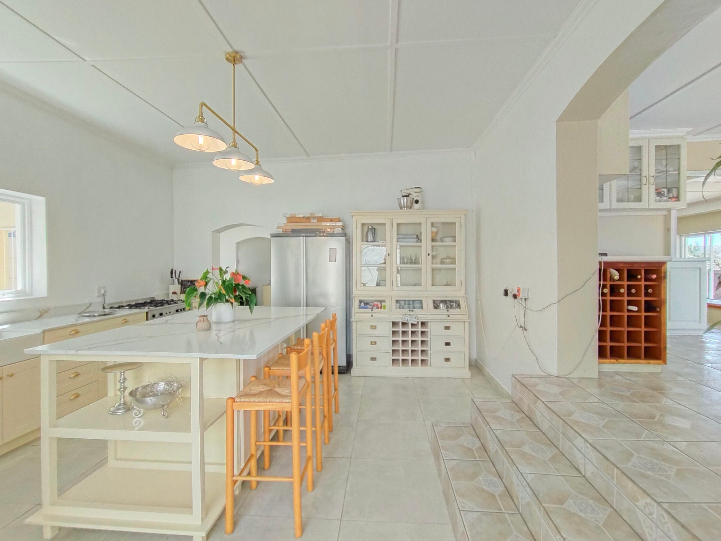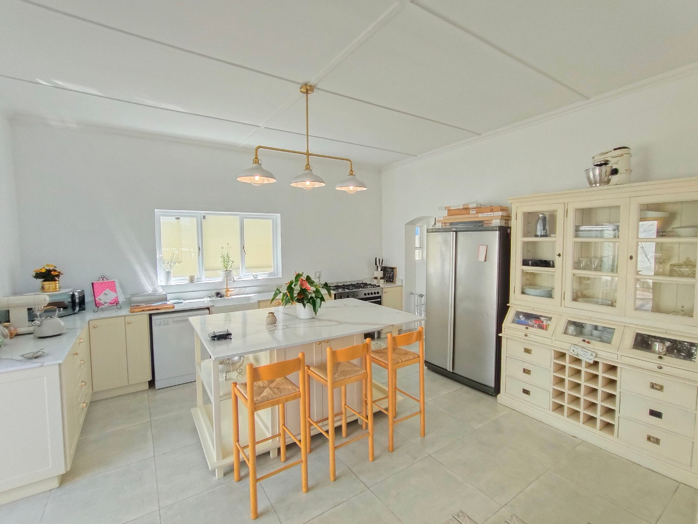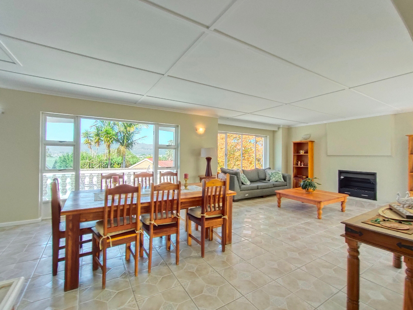 At the heart of the home lies a modern chef’s kitchen fitted with a new oven, hob, and central island — a perfect space for family cooking and entertaining. The open-plan lounge and dining area is warm and inviting, featuring an open wood-burning fireplace and double-door access to two outdoor spaces: one side opens to a sun-filled balcony overlooking Thesen Island and the Knysna Heads, while the other leads to a covered patio with a built-in braai.