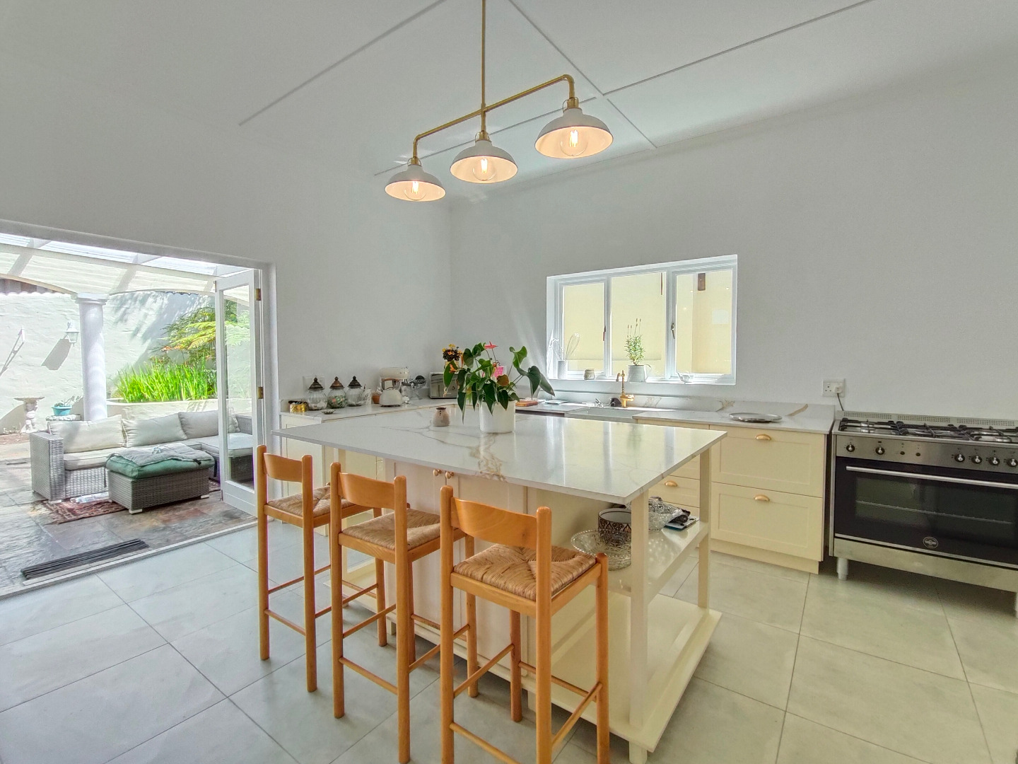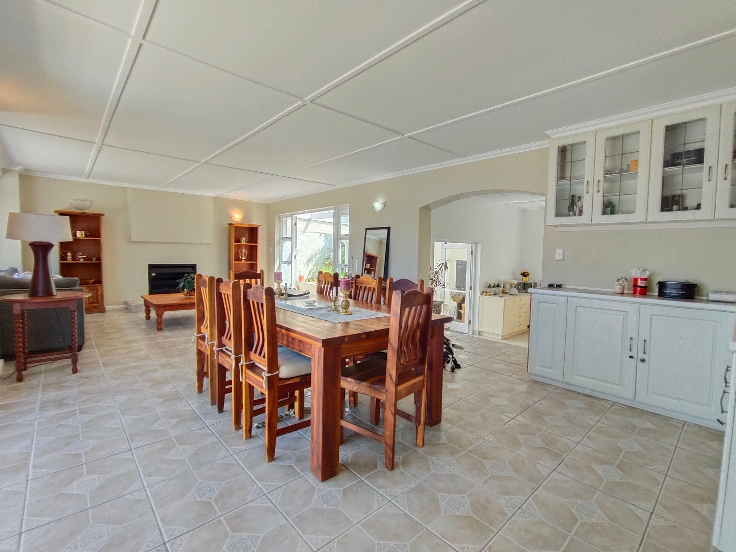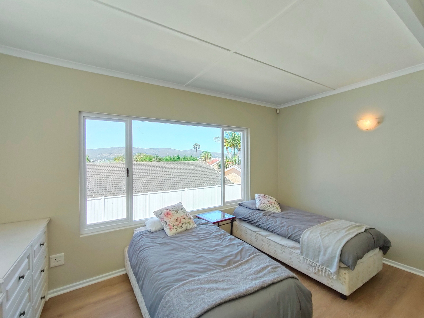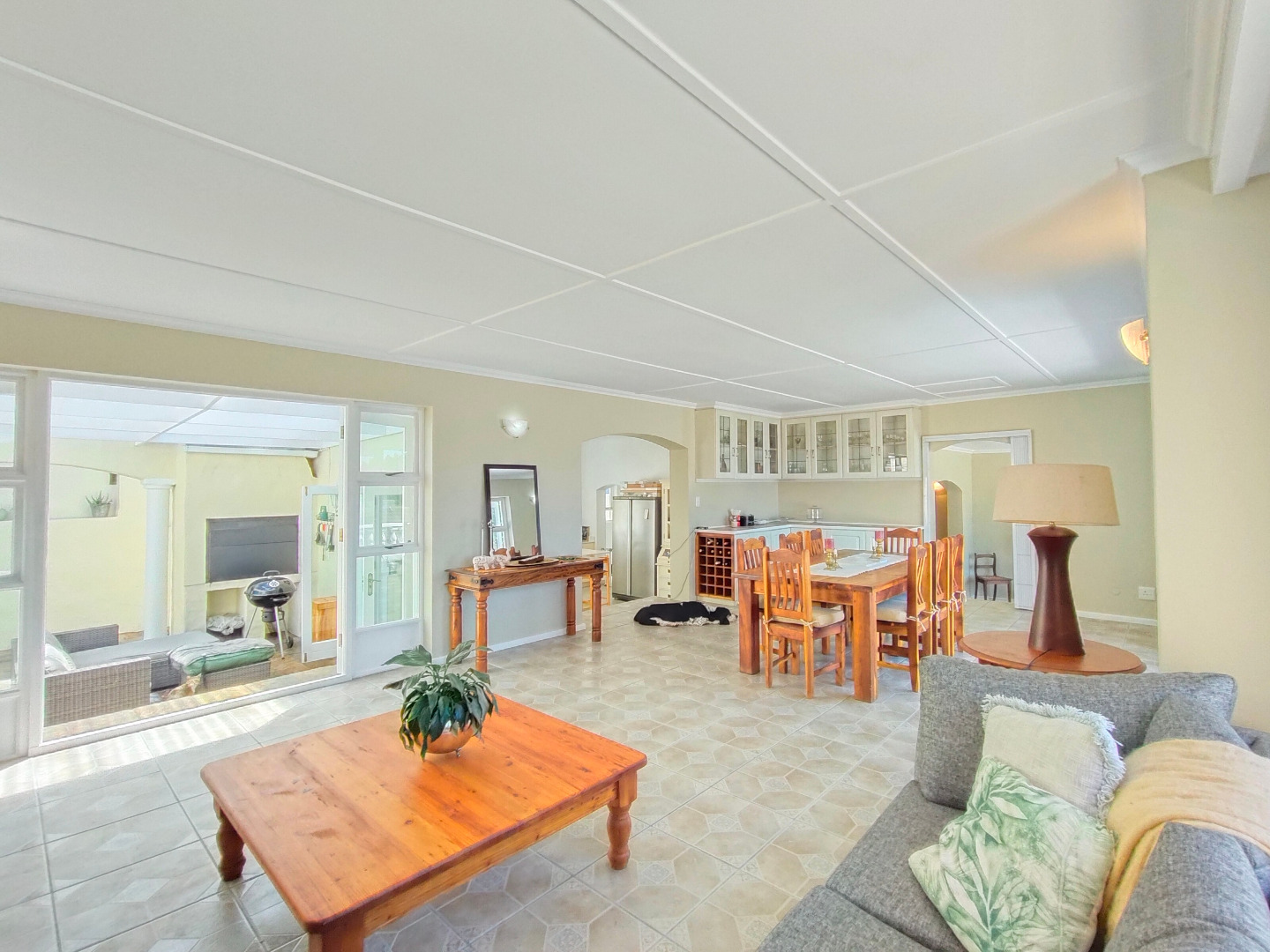 At the heart of the home lies a modern chef’s kitchen fitted with a new oven, hob, and central island — a perfect space for family cooking and entertaining. The open-plan lounge and dining area is warm and inviting, featuring an open wood-burning fireplace and double-door access to two outdoor spaces: one side opens to a sun-filled balcony overlooking Thesen Island and the Knysna Heads, while the other leads to a covered patio with a built-in braai.