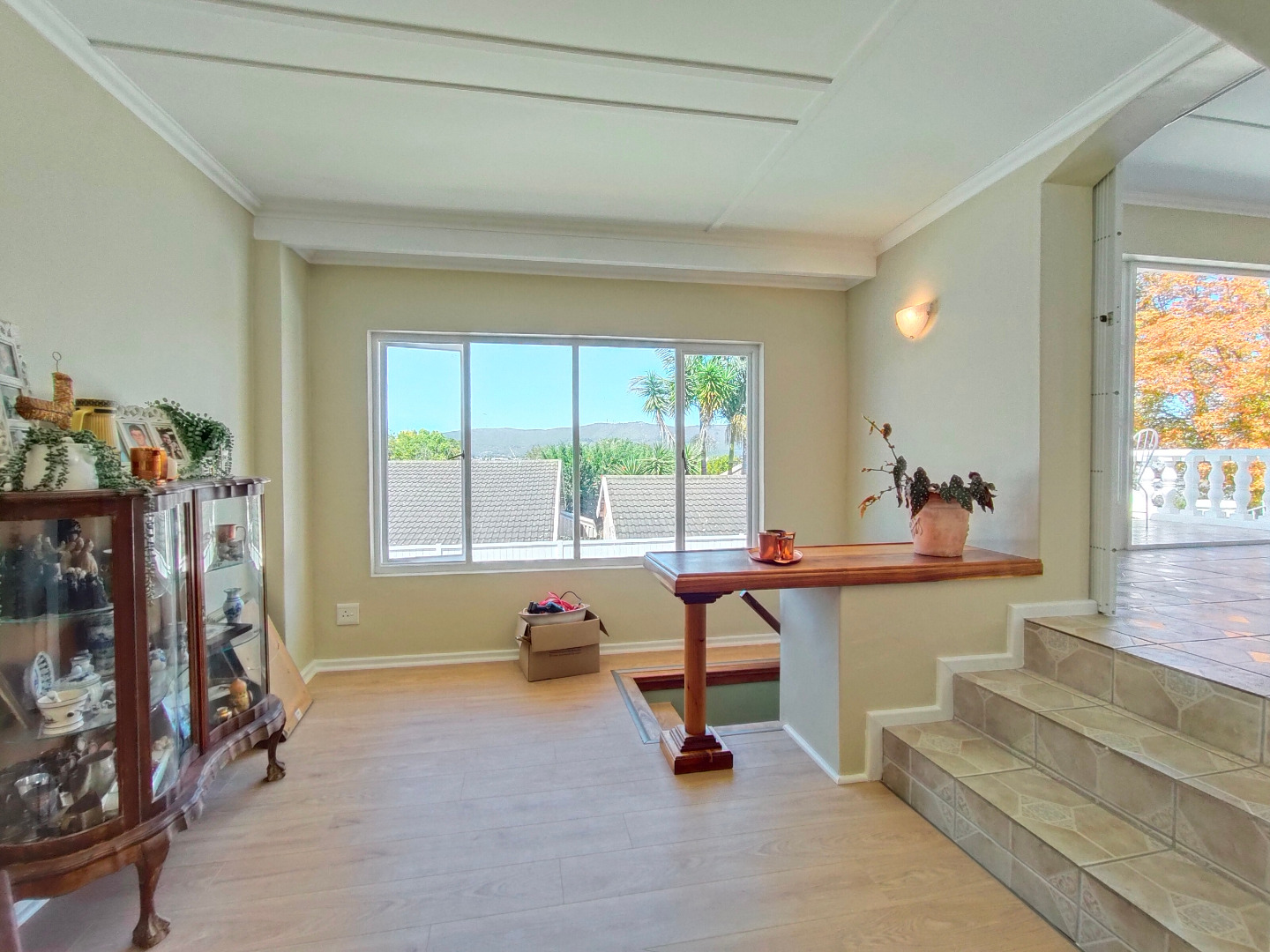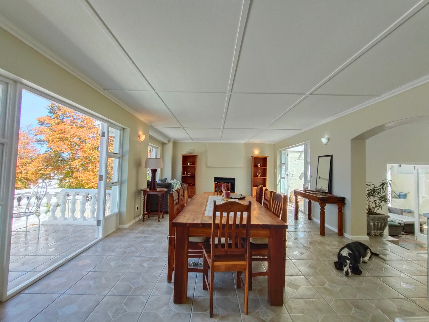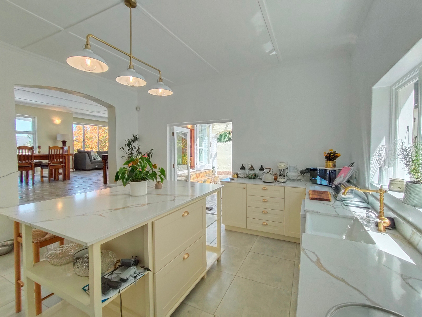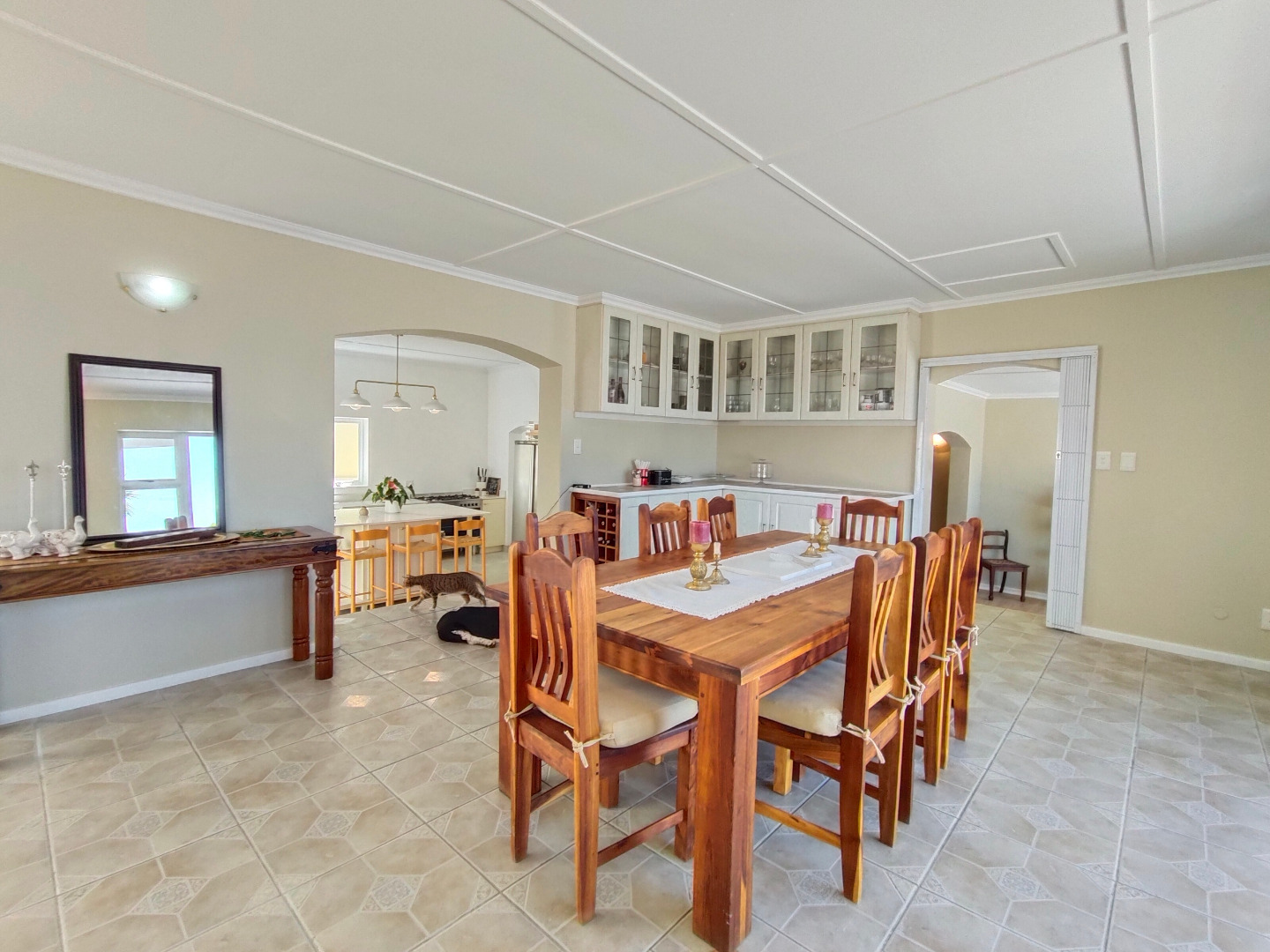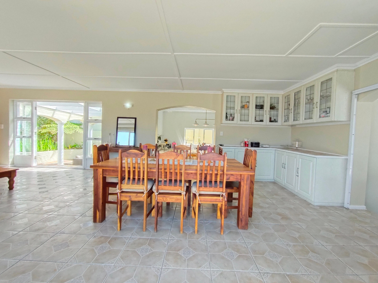 At the heart of the home lies a modern chef’s kitchen fitted with a new oven, hob, and central island — a perfect space for family cooking and entertaining. The open-plan lounge and dining area is warm and inviting, featuring an open wood-burning fireplace and double-door access to two outdoor spaces: one side opens to a sun-filled balcony overlooking Thesen Island and the Knysna Heads, while the other leads to a covered patio with a built-in braai.