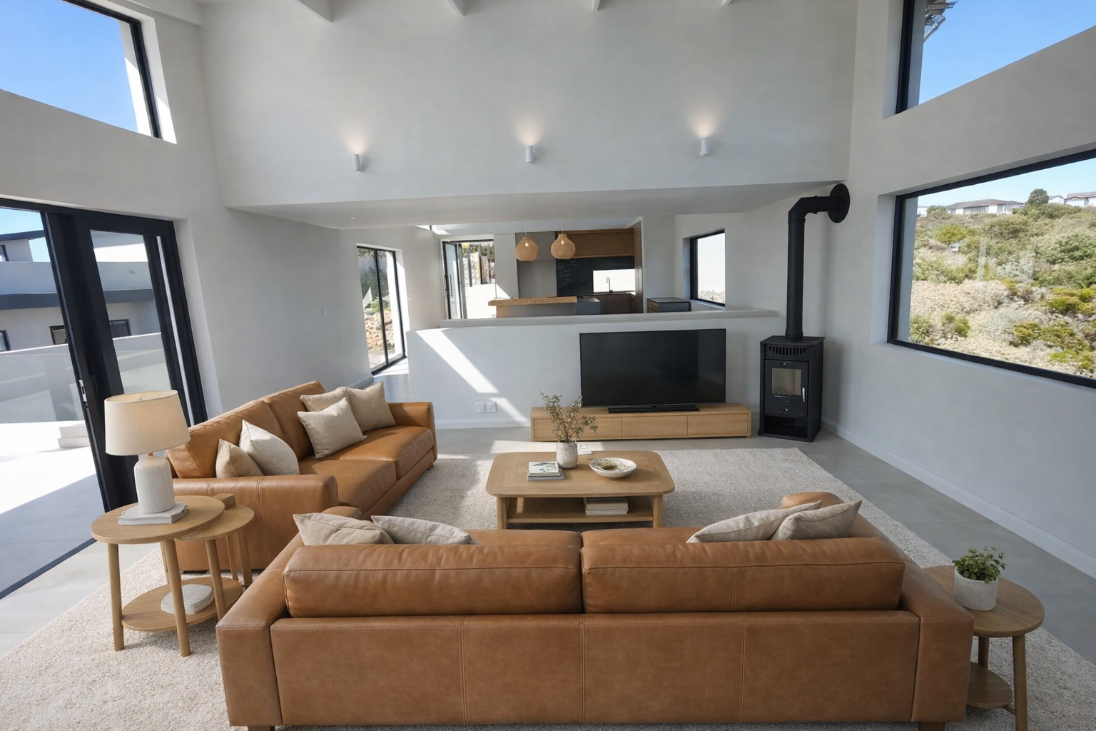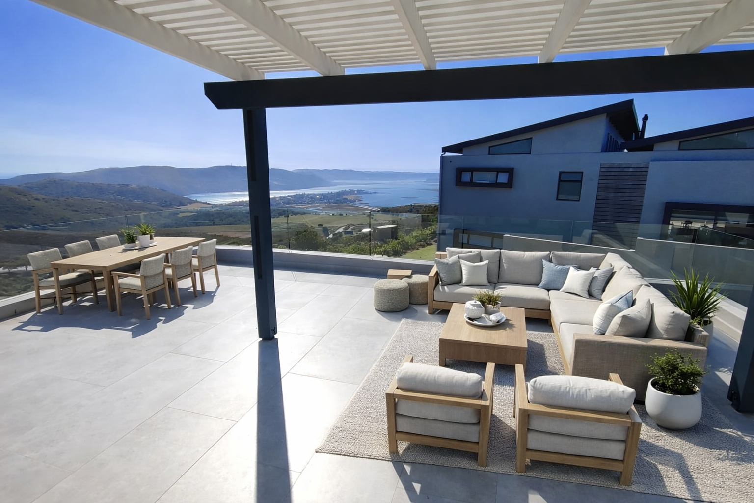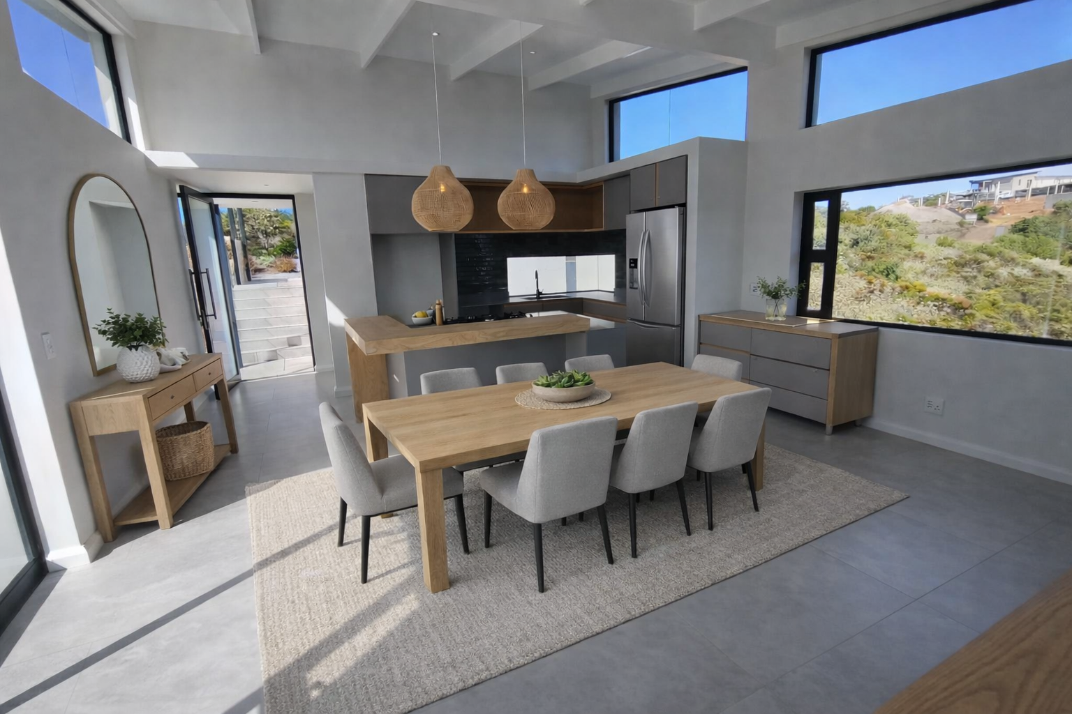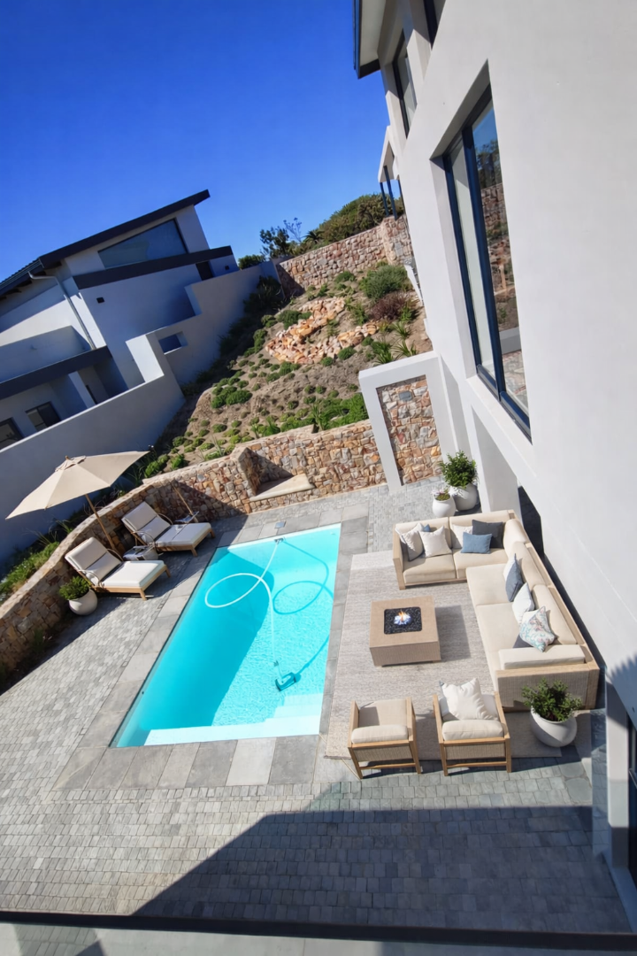 Outdoor living is elevated to an art form with multiple balconies and a spacious patio, framed by elegant glass railings that maximise the spectacular sea and mountain views. A louvered pergola offers shaded respite, while the private swimming pool invites serene relaxation. Entertain effortlessly with a built-in braai, perfect for enjoying the South African climate. The property also includes a double garage and additional parking.