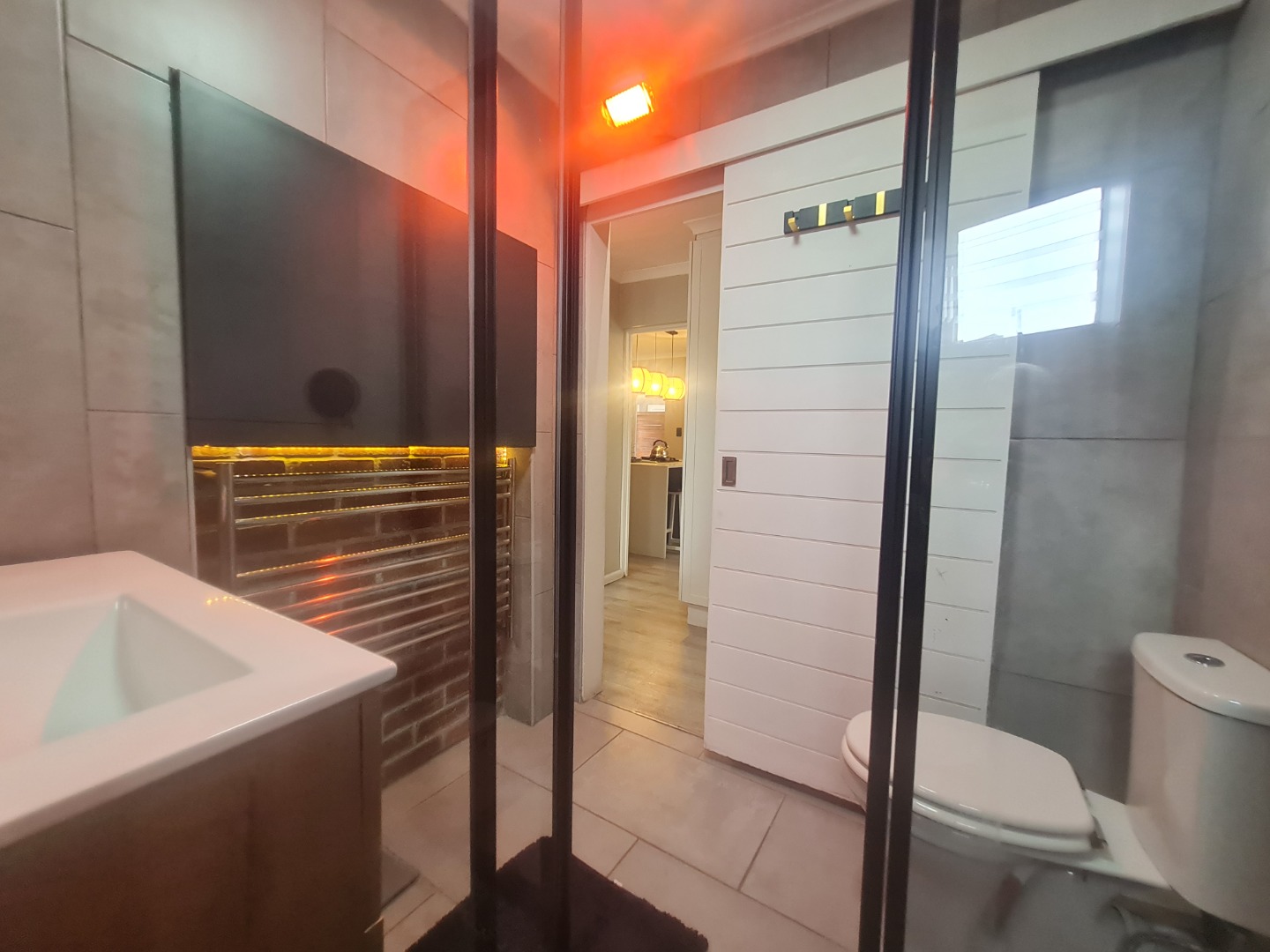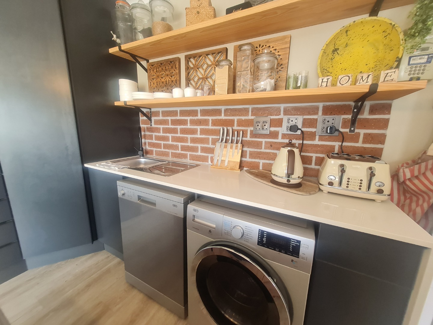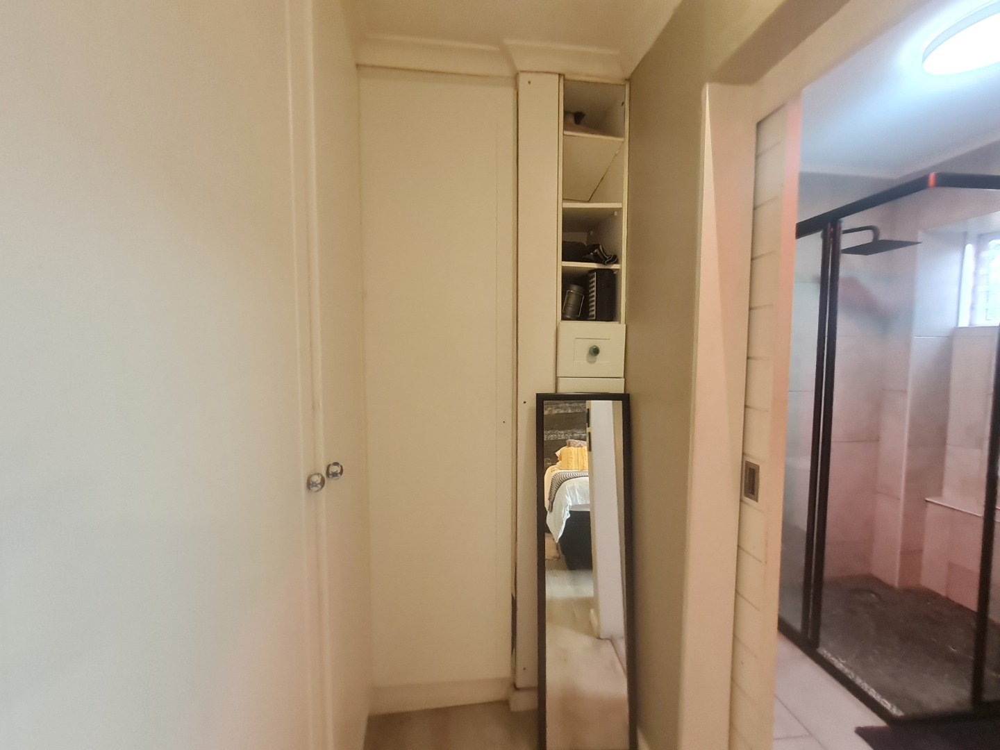 The bedroom includes built-in cupboards and a quality air-conditioning unit, while the modern en-suite bathroom is finished with clean, contemporary fittings.