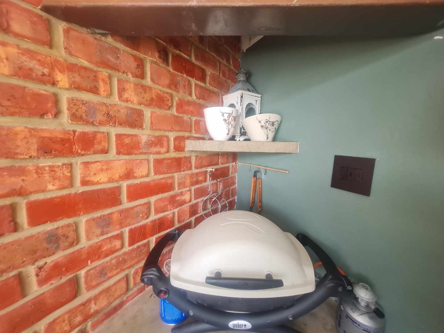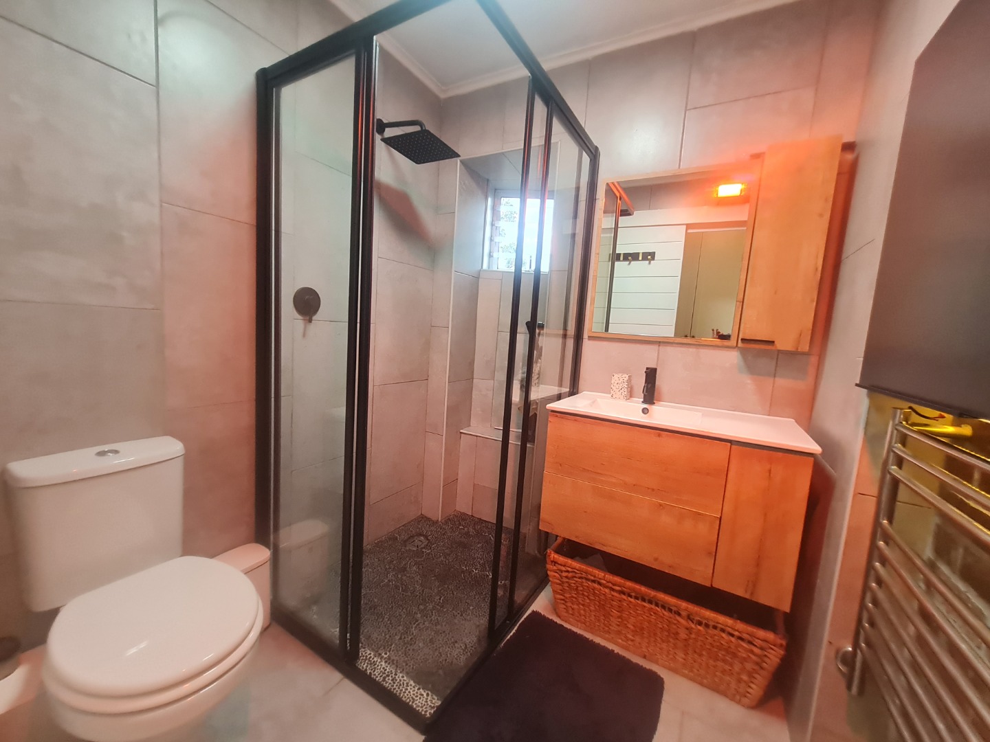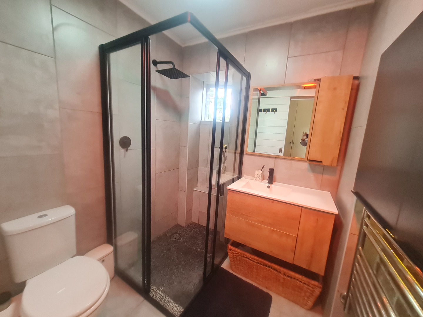 The bedroom includes built-in cupboards and a quality air-conditioning unit, while the modern en-suite bathroom is finished with clean, contemporary fittings.
