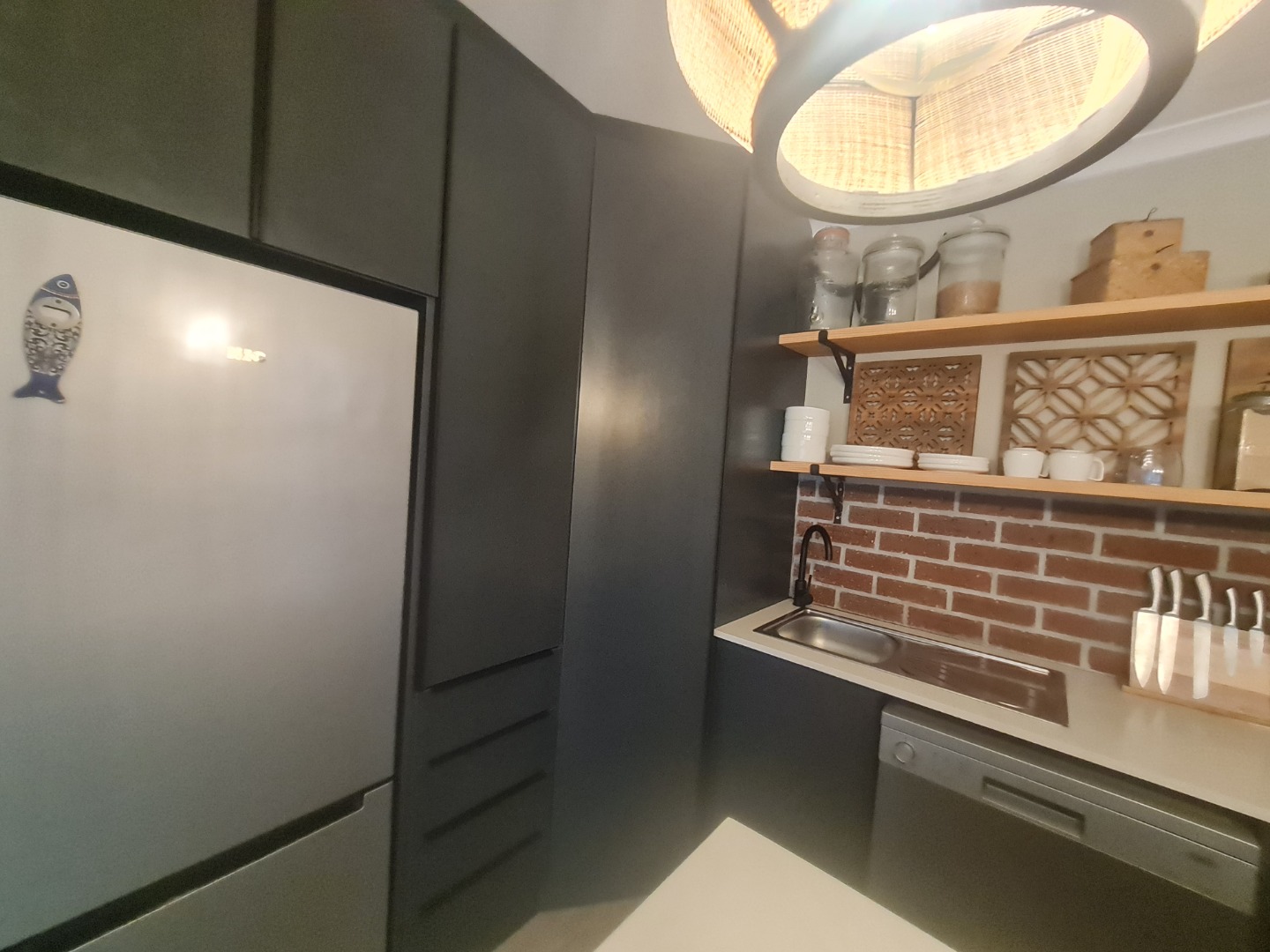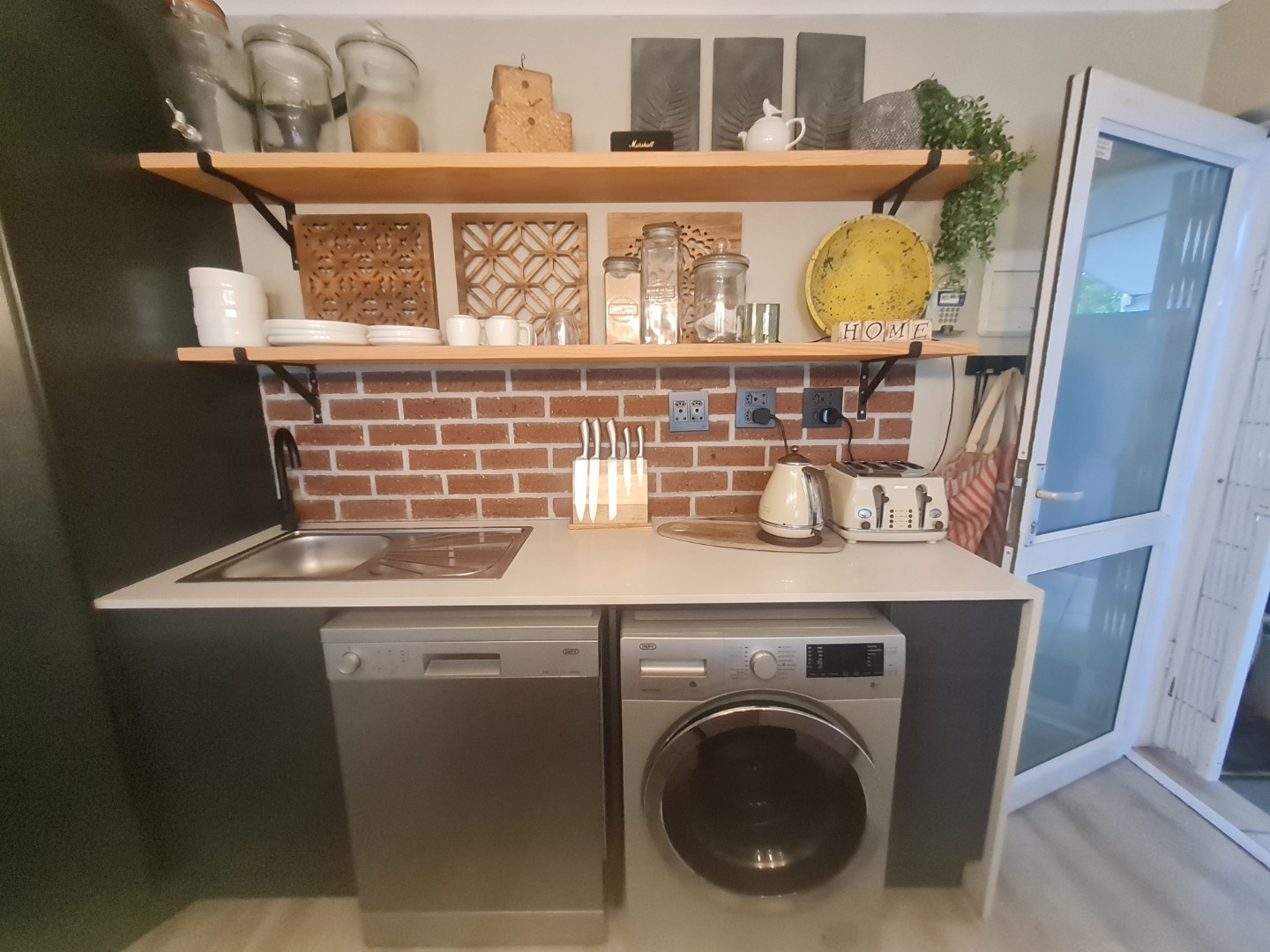 The apartment offers a bright and well-designed open-plan living area with a contemporary kitchen fitted with a central island and gas hob, creating a practical and welcoming space for everyday living and entertaining. Large double-glazed windows allow plenty of natural light while providing excellent insulation and reducing outside noise.