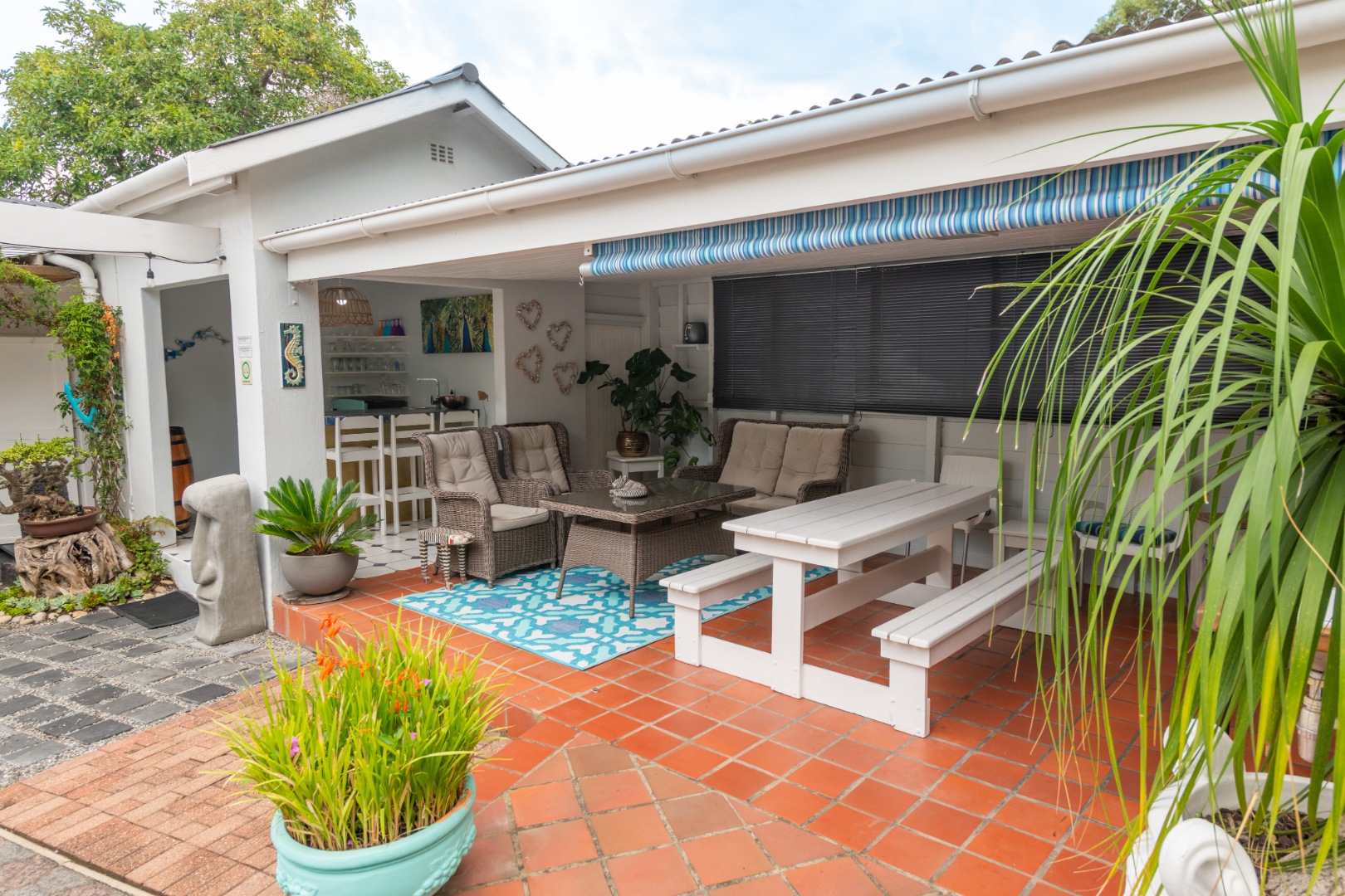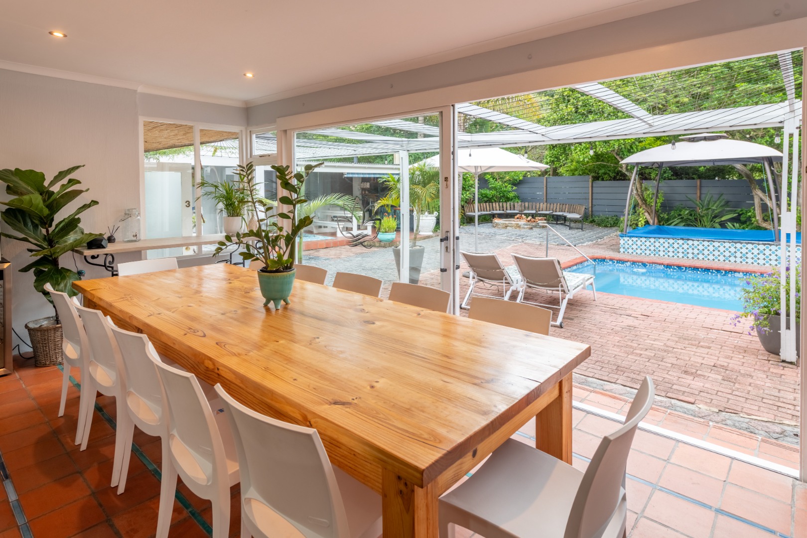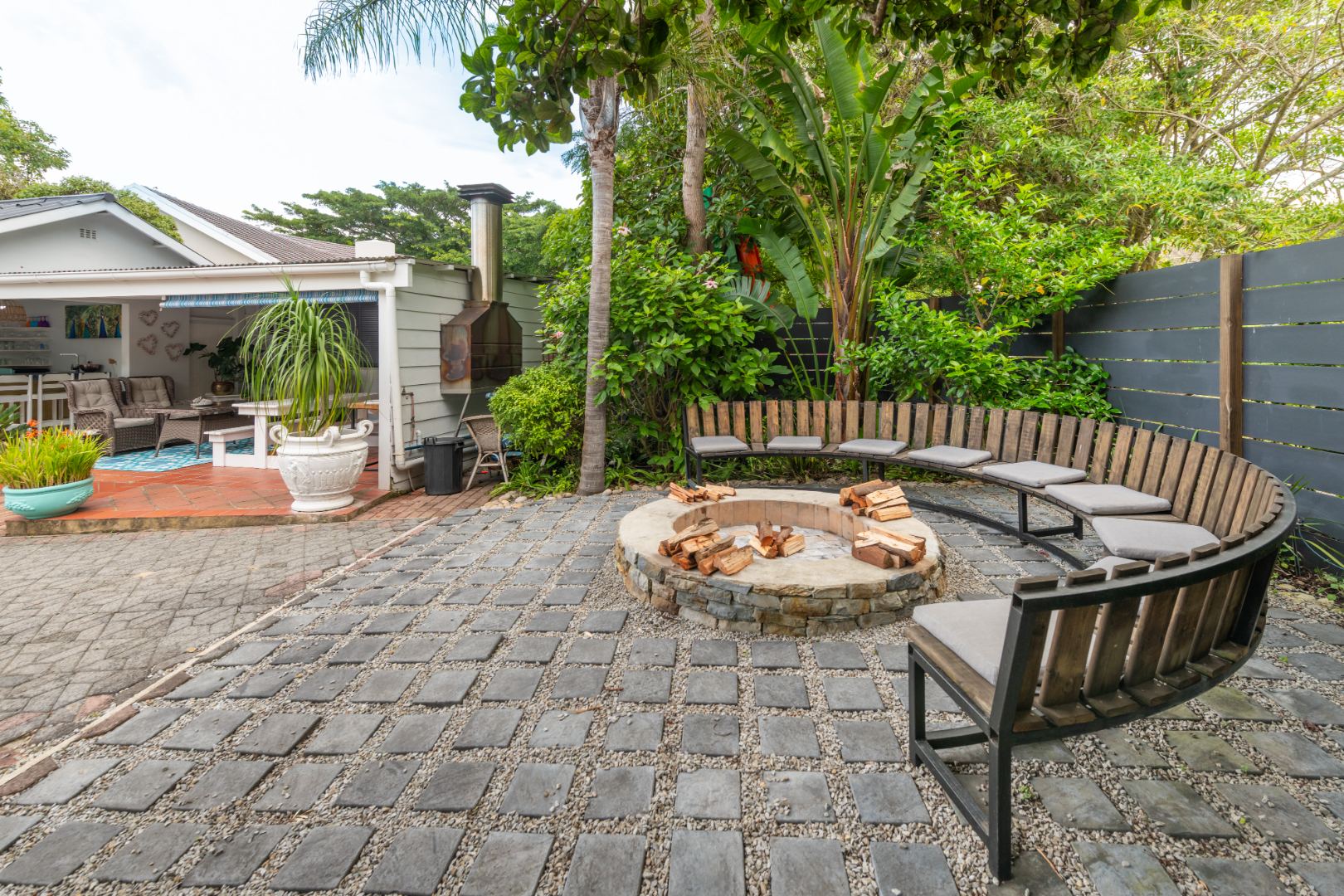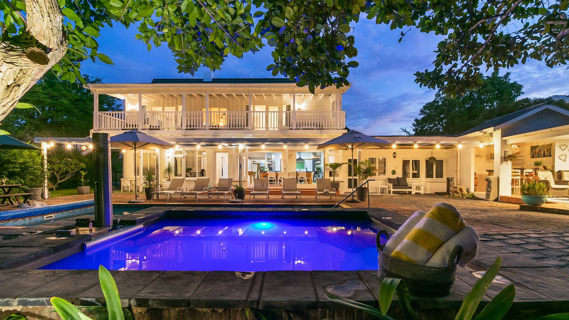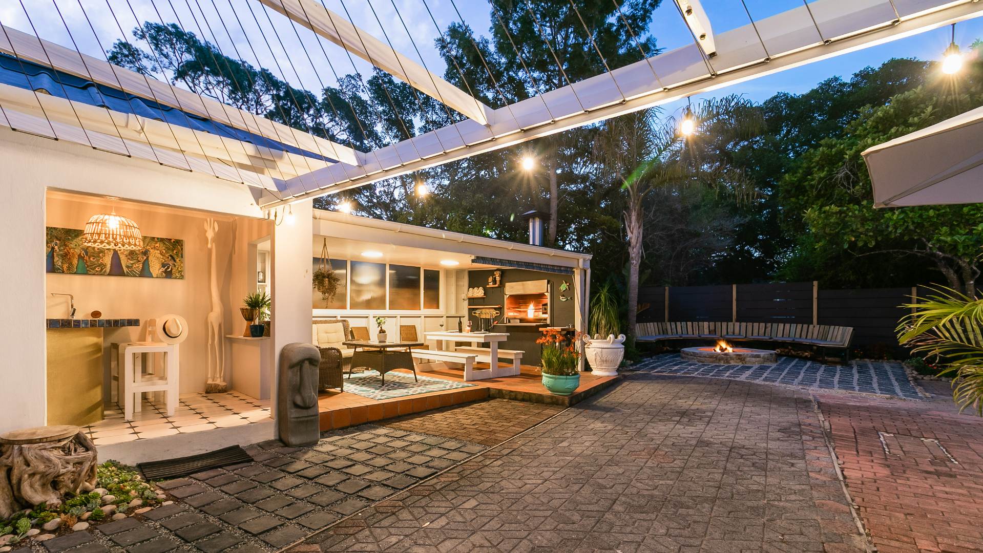 The entertainment options from this laid-back haven are truly endless, with a focus on barefoot luxury and relaxation. From the established garden to the expansive balconies and sunny covered patios, the property features a built-in braai, a wood-fired hot tub, separate outdoor built-in bar, fire pit and a swimming pool.