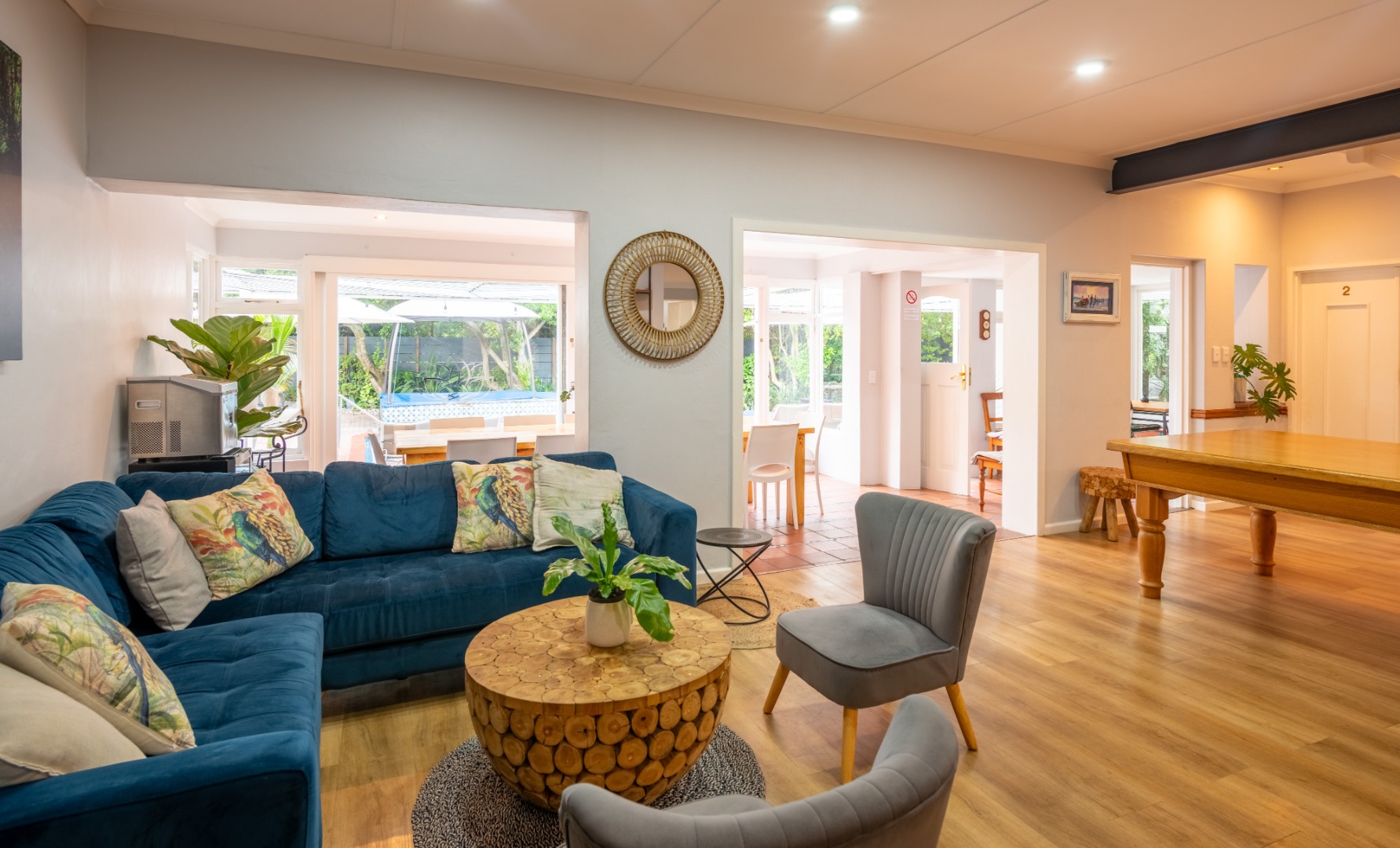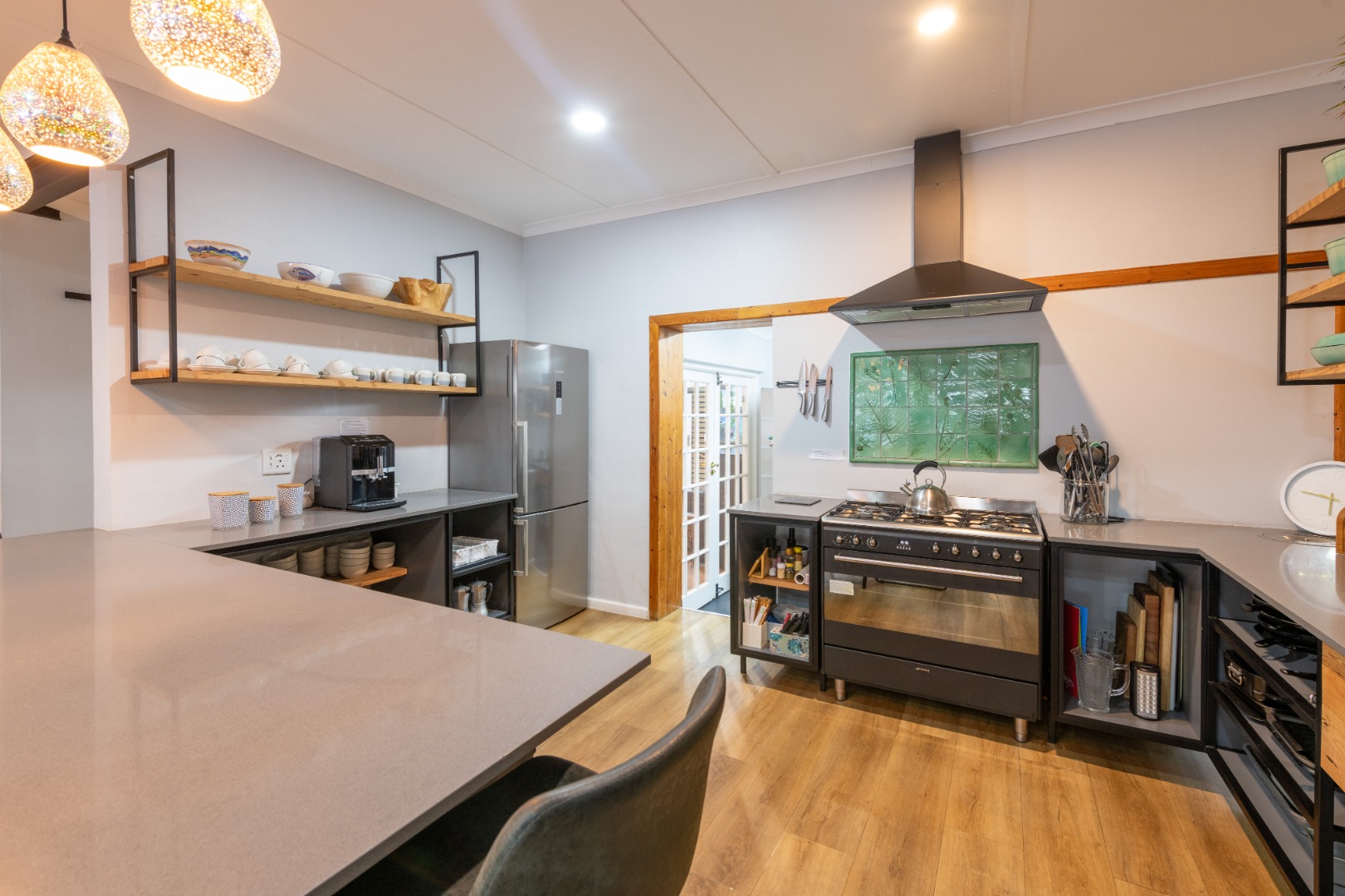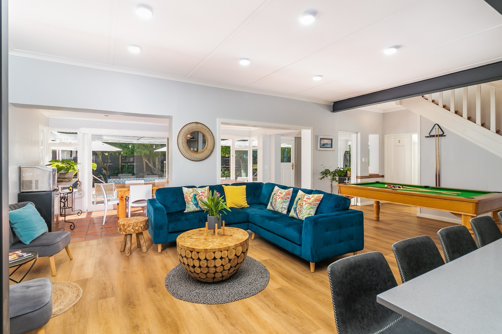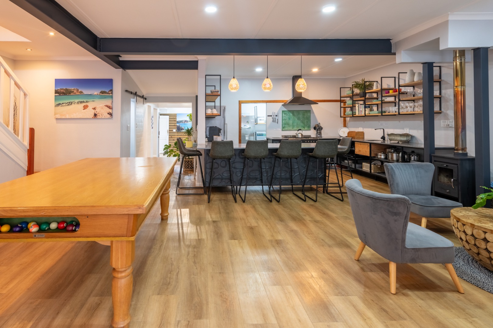 Open plan living that includes 2 lounges, pool room and big dining areas to accommodate large groups of up to 20 people. The open-plan kitchen is well equipped and includes 2 fridges, wine fridge, coffee machine and 90 inch Smeg oven. The separate scullery comes complete with dishwasher and washing machine.