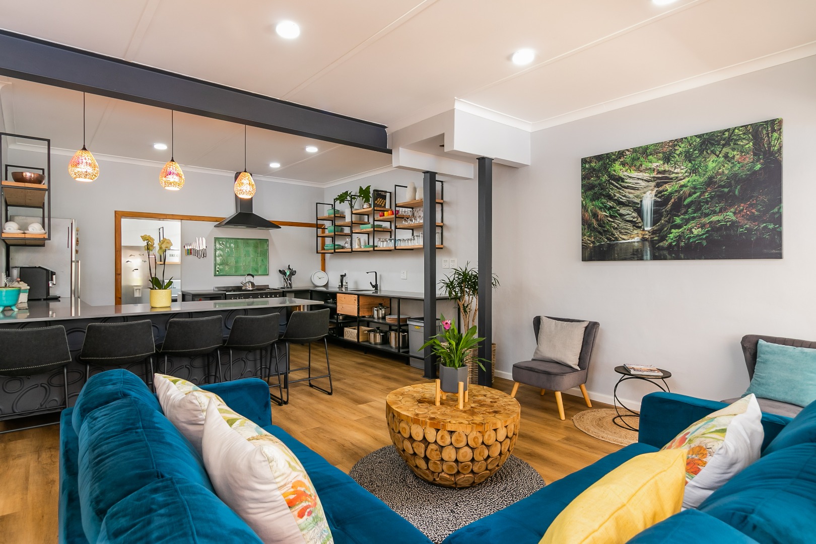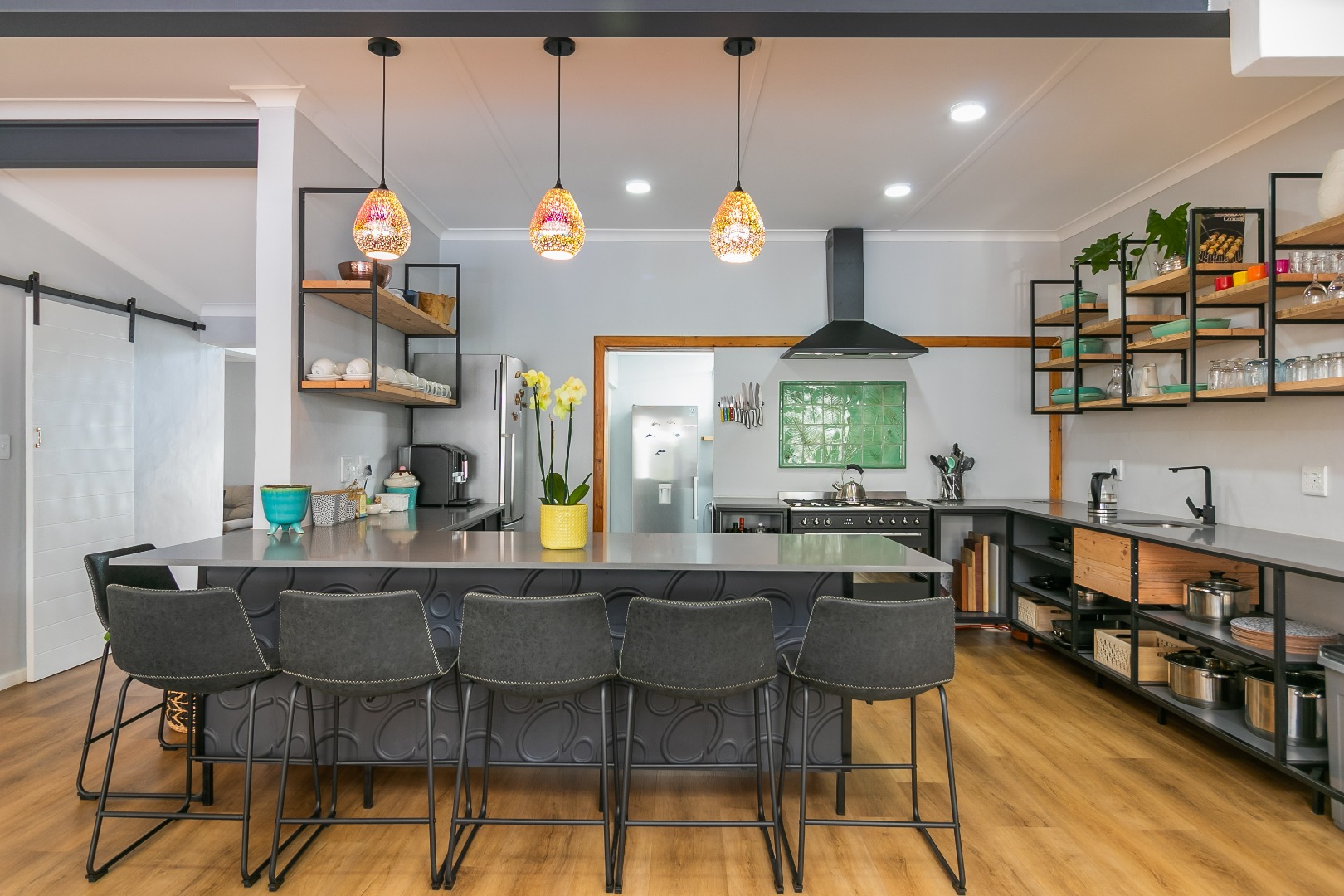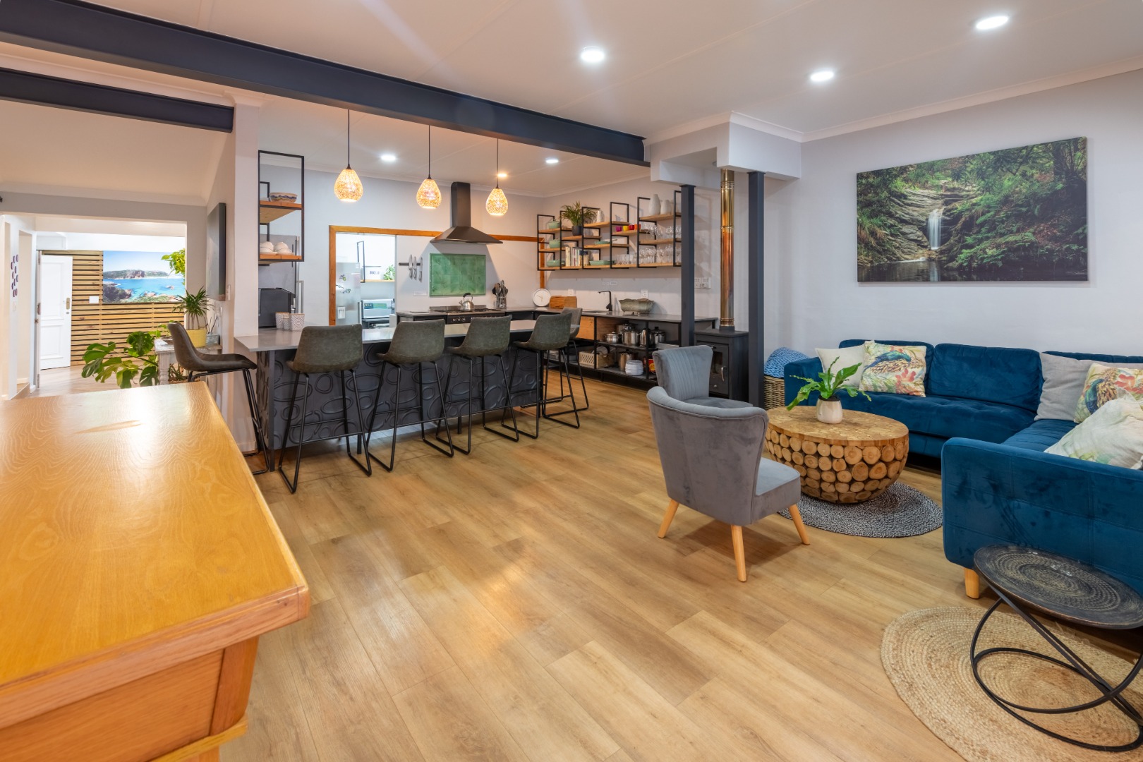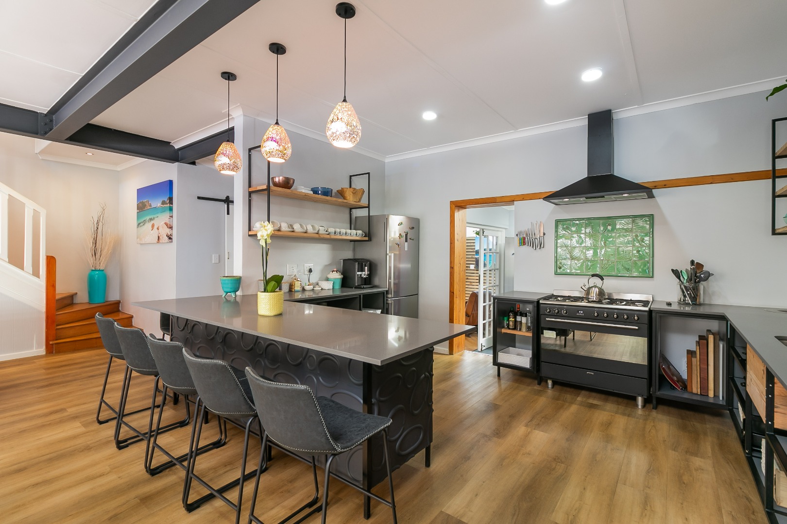 Open plan living that includes 2 lounges, pool room and big dining areas to accommodate large groups of up to 20 people. The open-plan kitchen is well equipped and includes 2 fridges, wine fridge, coffee machine and 90 inch Smeg oven. The separate scullery comes complete with dishwasher and washing machine.