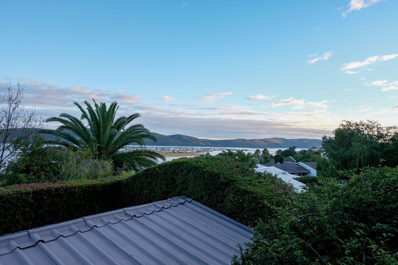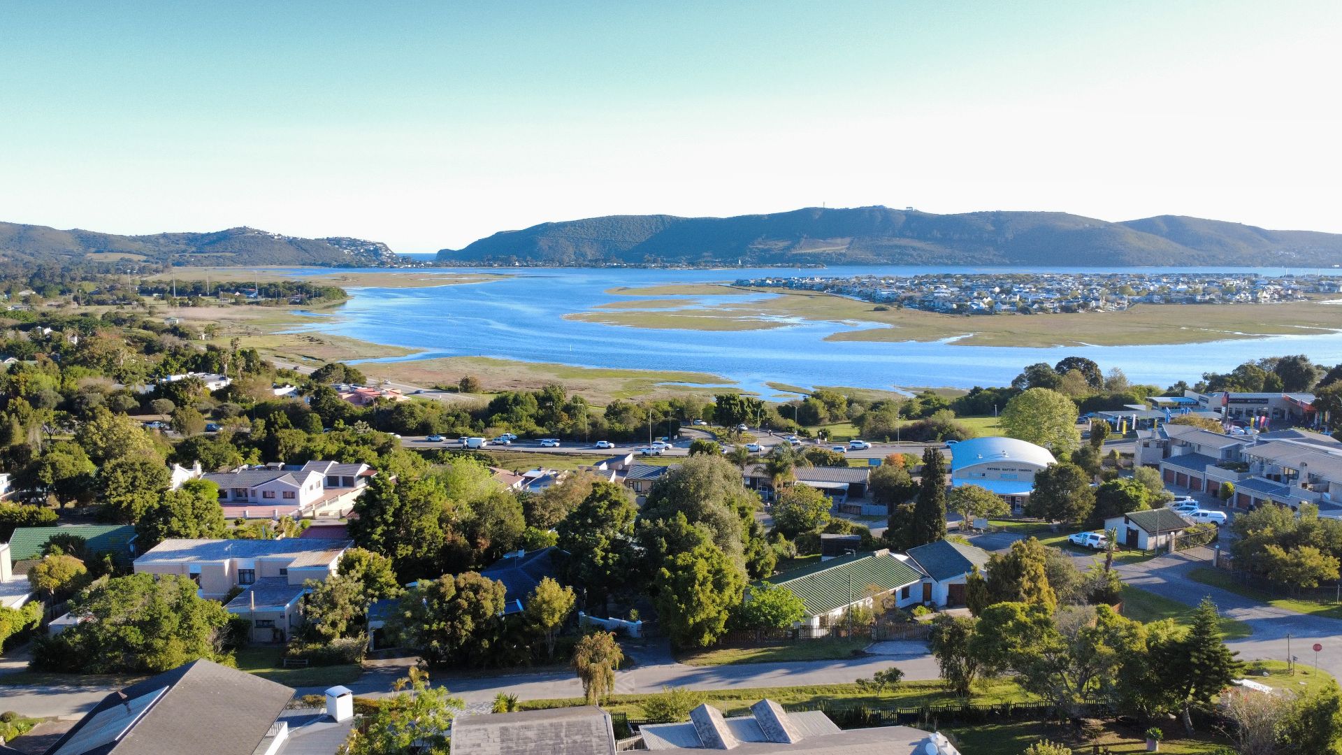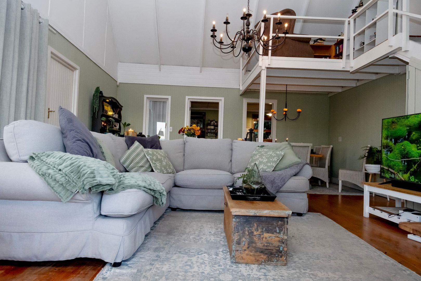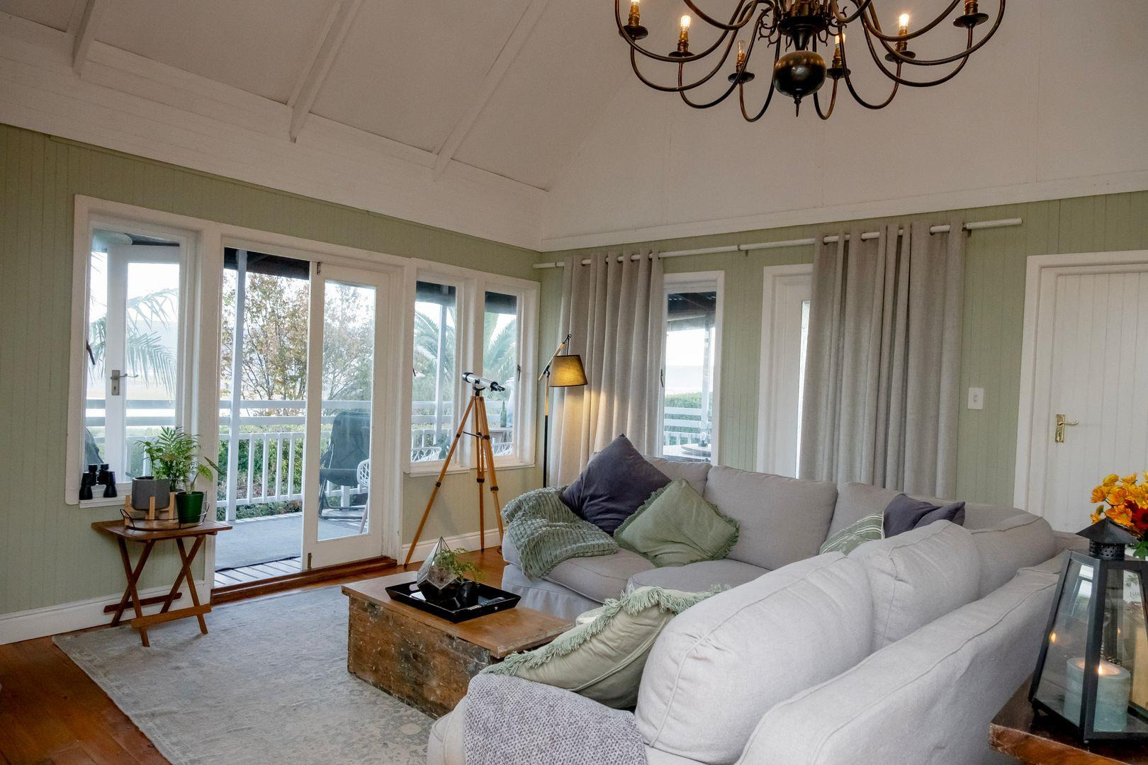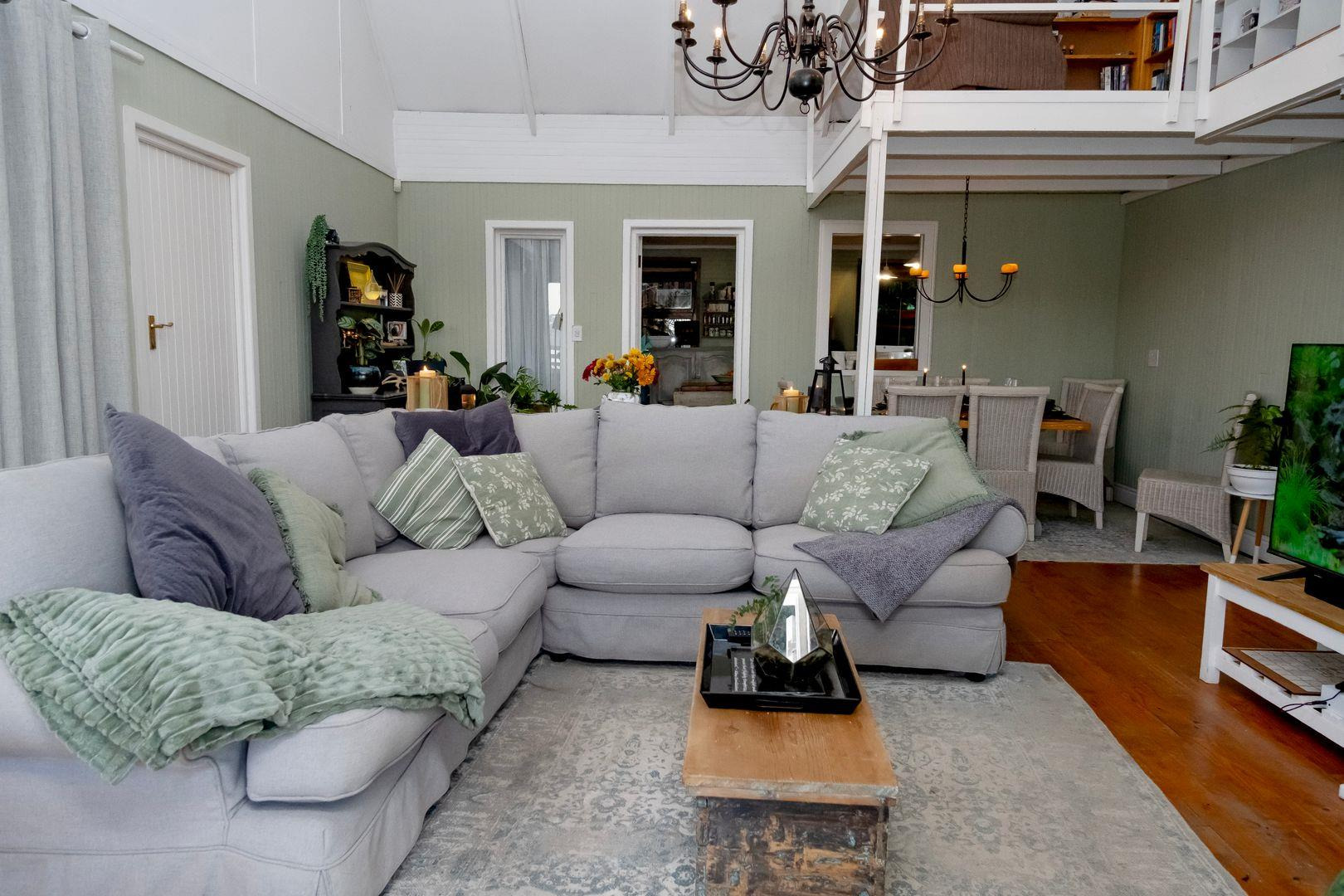 Spacious and inviting: The open-plan lounge and dining area flow seamlessly onto a wide, wrap-around timber deck—perfect for soaking up breathtaking views of the Knysna Heads and lagoon.
