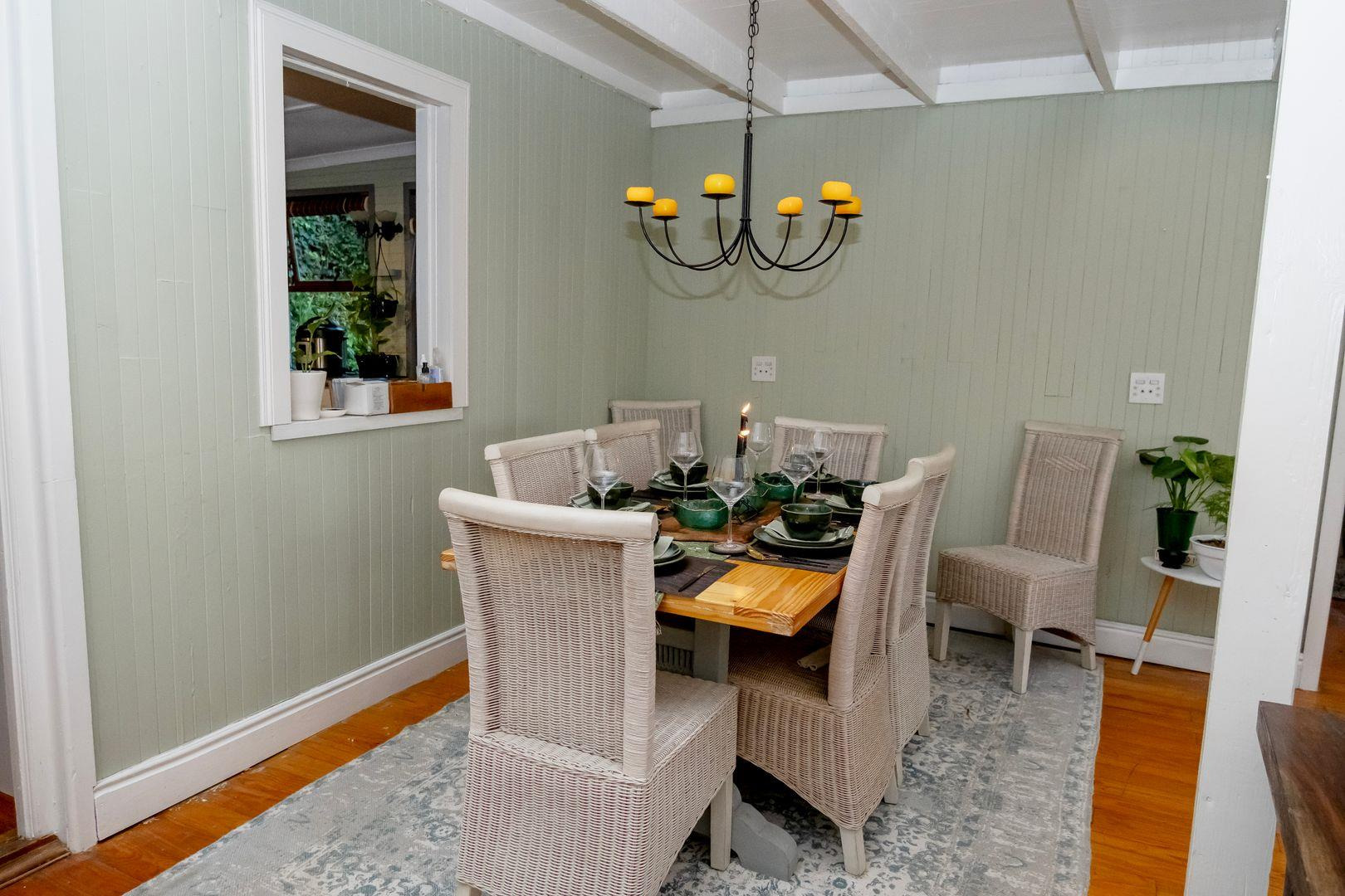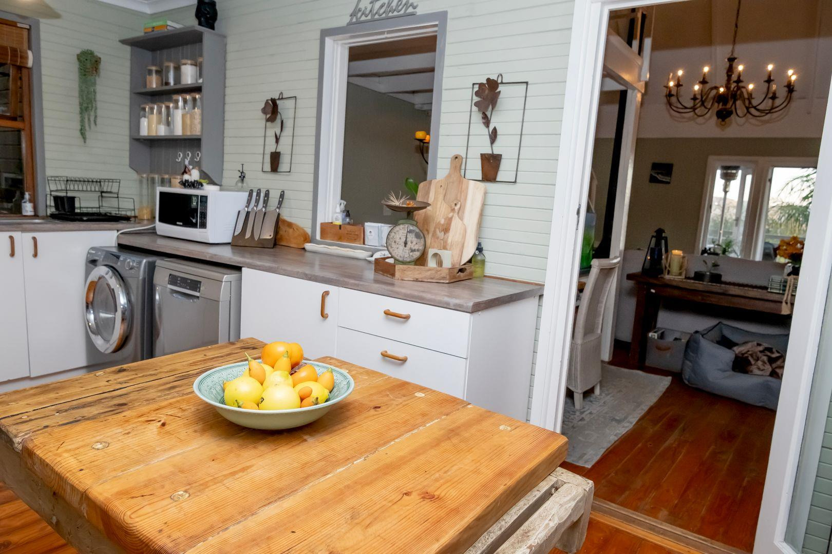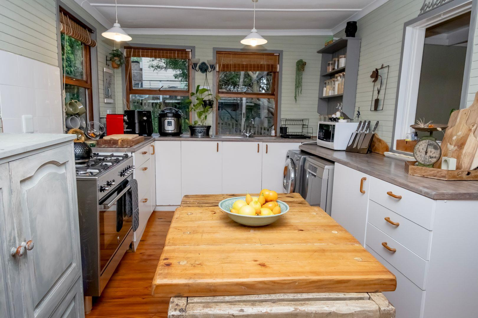 Character-filled kitchen: A delightful farmhouse kitchen opens onto a covered rear deck where birdsong and dappled forest light create a peaceful everyday experience.
