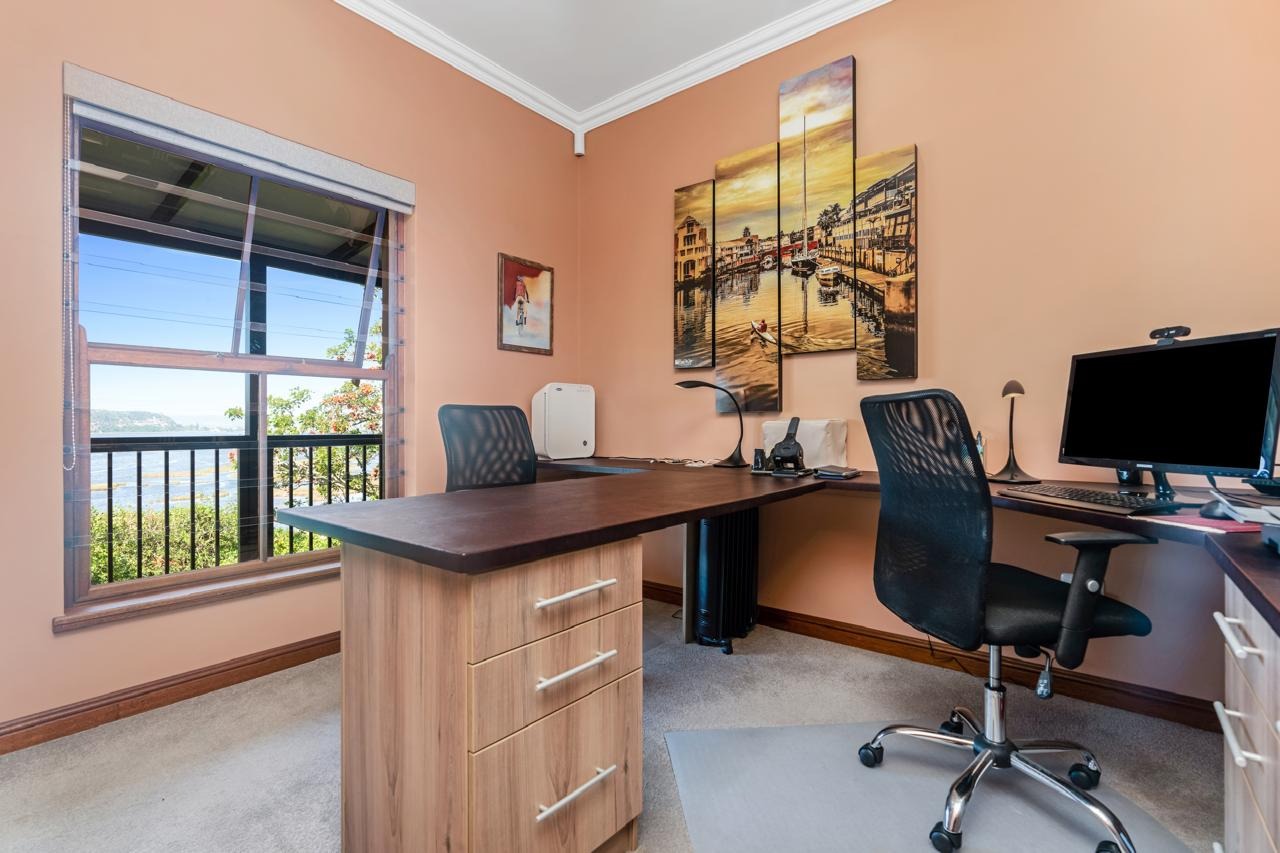 Open plan living/dining with double volume ceilings and wood burning fireplace that flow out onto the wraparound undercover balcony taking in the serene lagoon views, bird-life and fynbos. Gorgeous study with custom made fittings that could be converted into a 4th bedroom if needed. A separate kitchen with walk-in pantry, and scullery that leads out onto a charming courtyard.