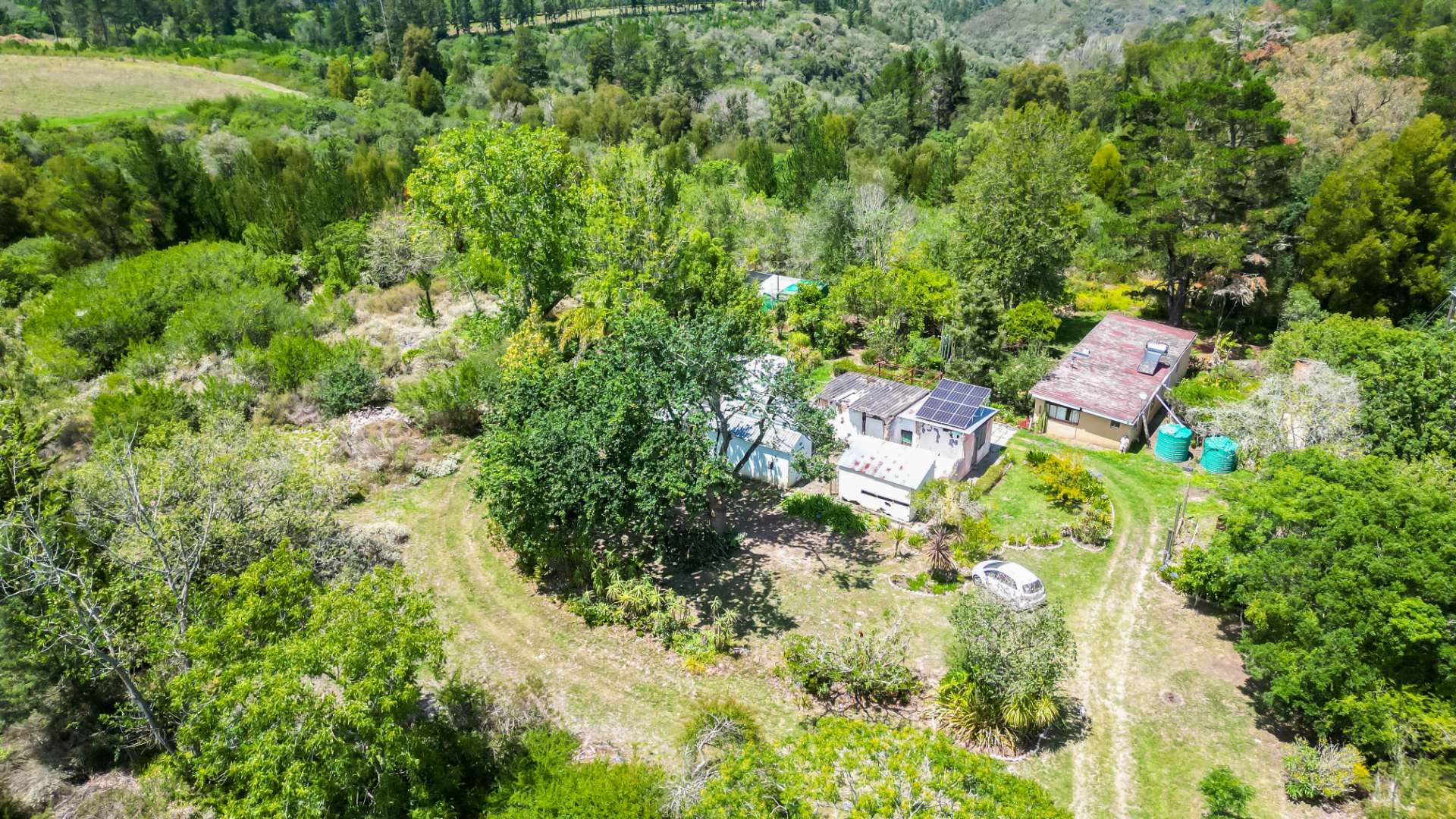 Additional infrastructure includes a spacious 10x8m shed, two smaller sheds, and a secluded wooden cottage with its own solar and water setup—ideal for guests or rental potential.