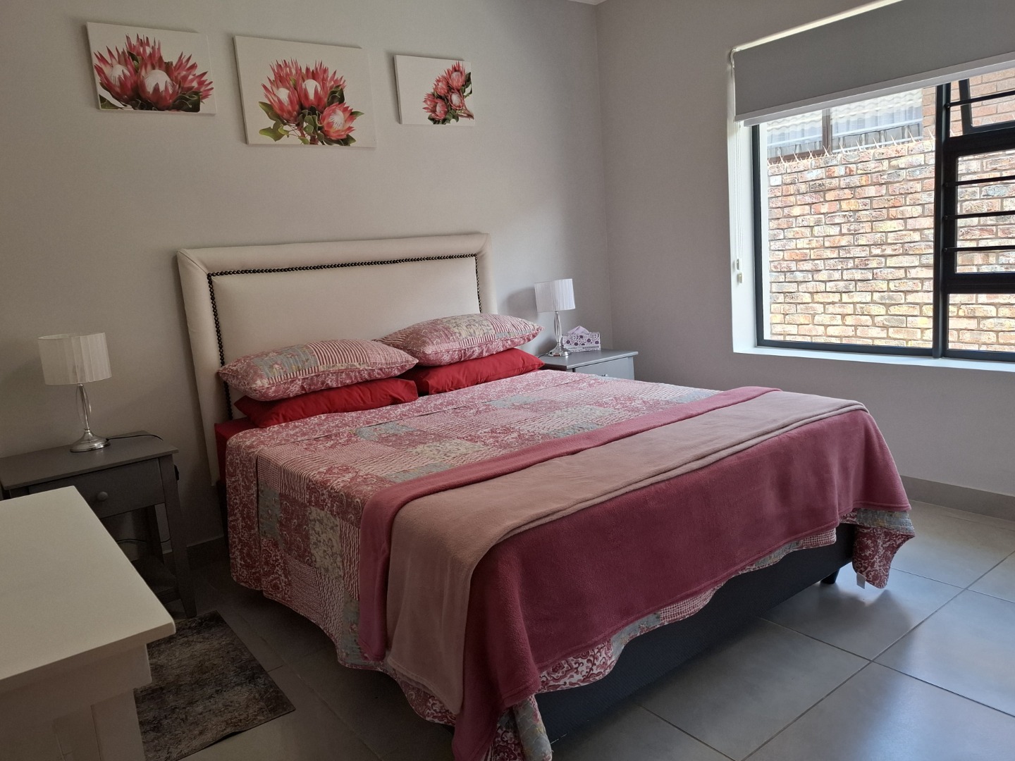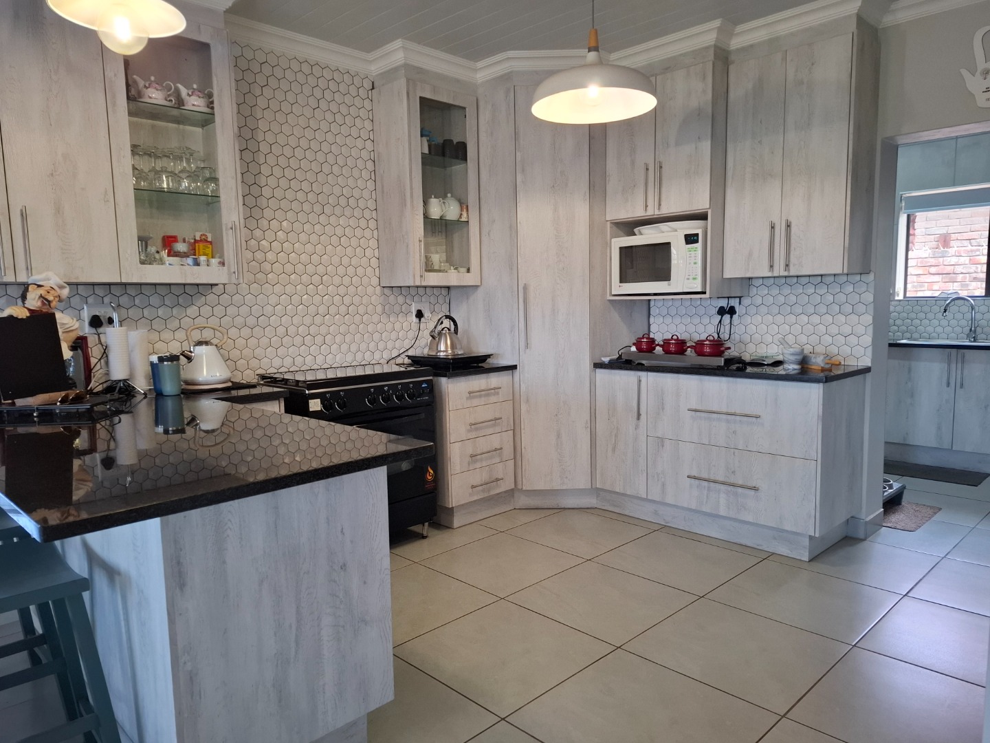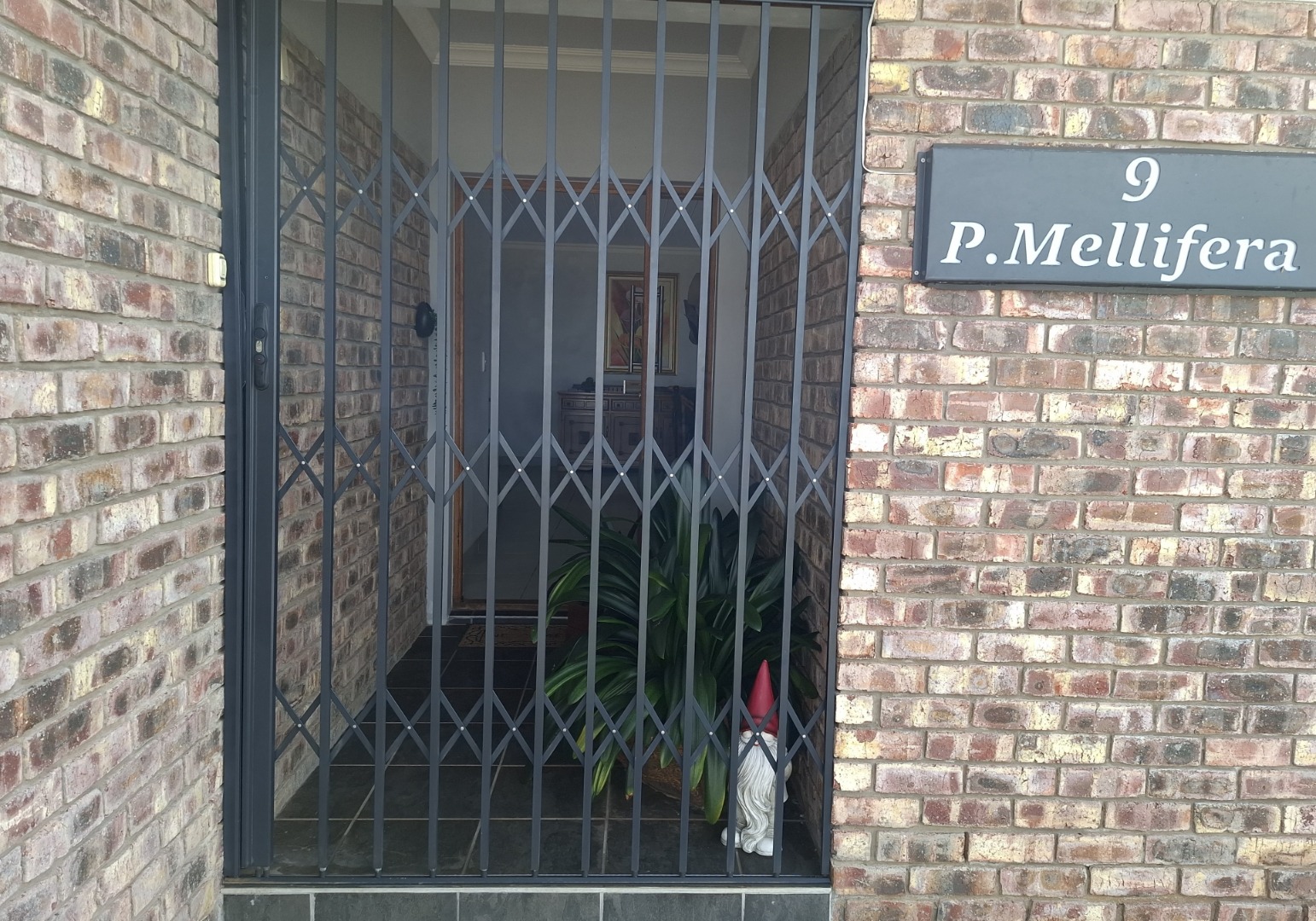 Outdoor living is enhanced by a deck and a built-in braai, ideal for enjoying the South African climate. The property benefits from extensive paving, ensuring low maintenance, and is pet-friendly. For enhanced sustainability and security, the home is equipped with a battery inverter, solar panels, and water tank, alongside the visible security gate and camera.