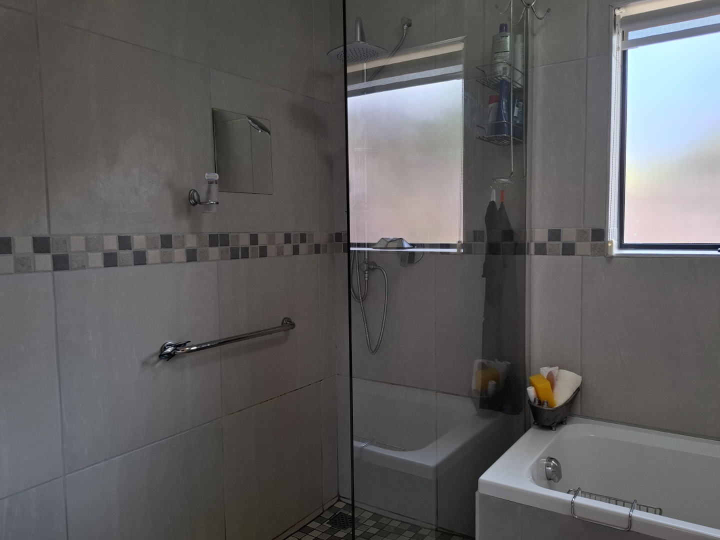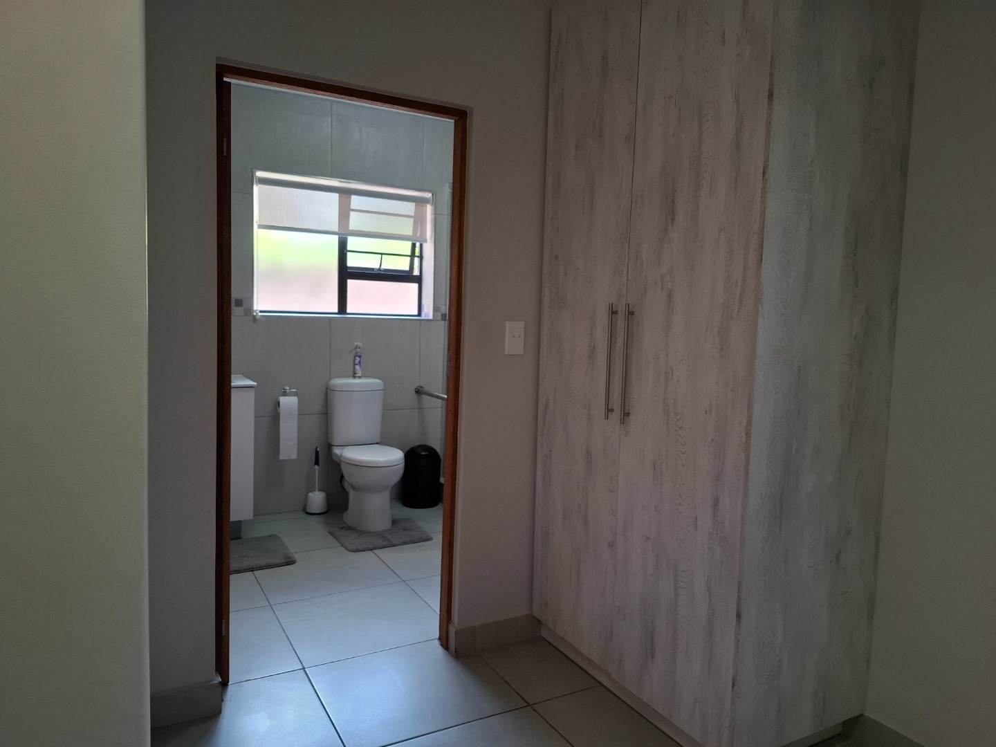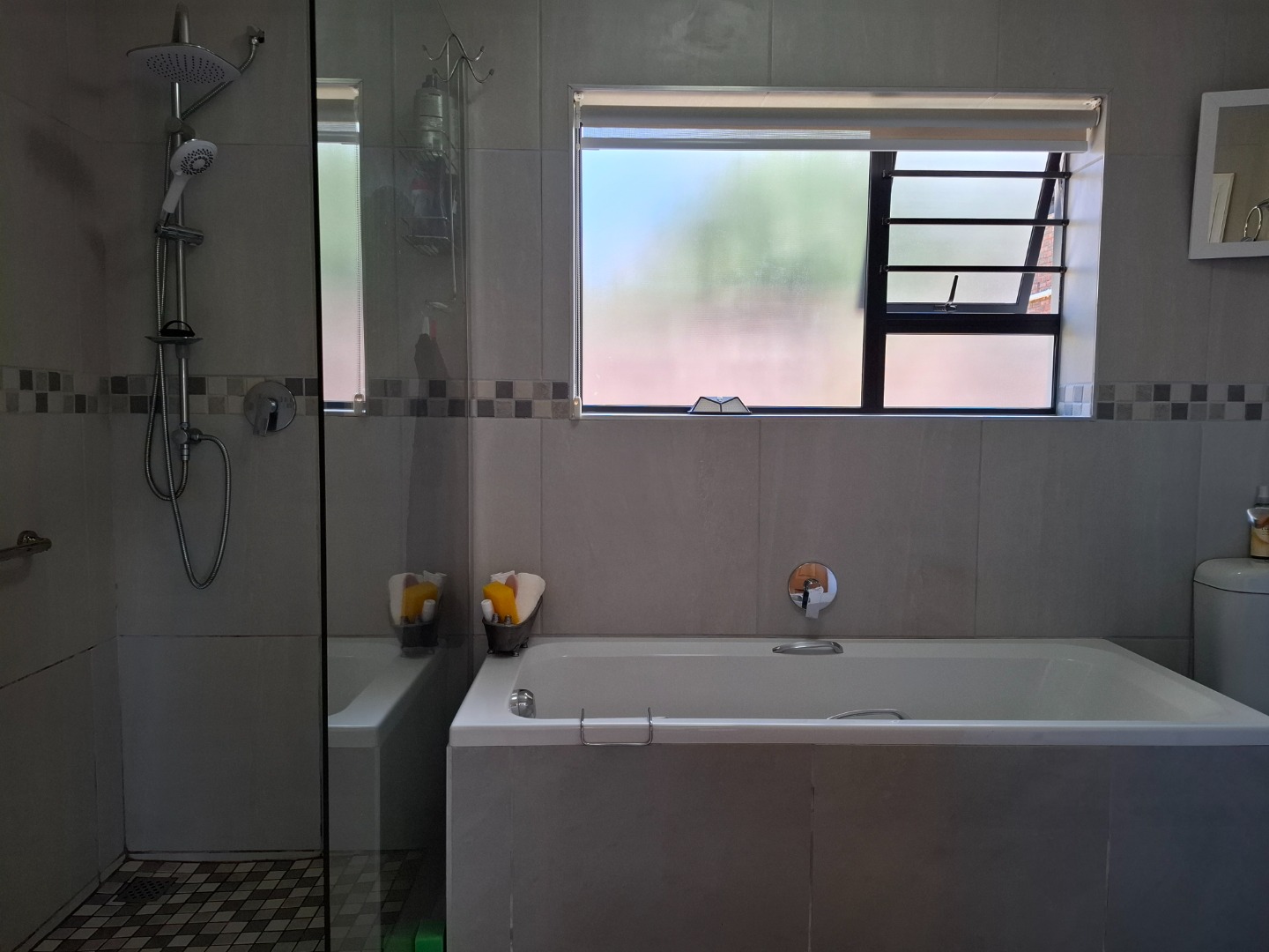 Outdoor living is enhanced by a deck and a built-in braai, ideal for enjoying the South African climate. The property benefits from extensive paving, ensuring low maintenance, and is pet-friendly. For enhanced sustainability and security, the home is equipped with a battery inverter, solar panels, and water tank, alongside the visible security gate and camera.