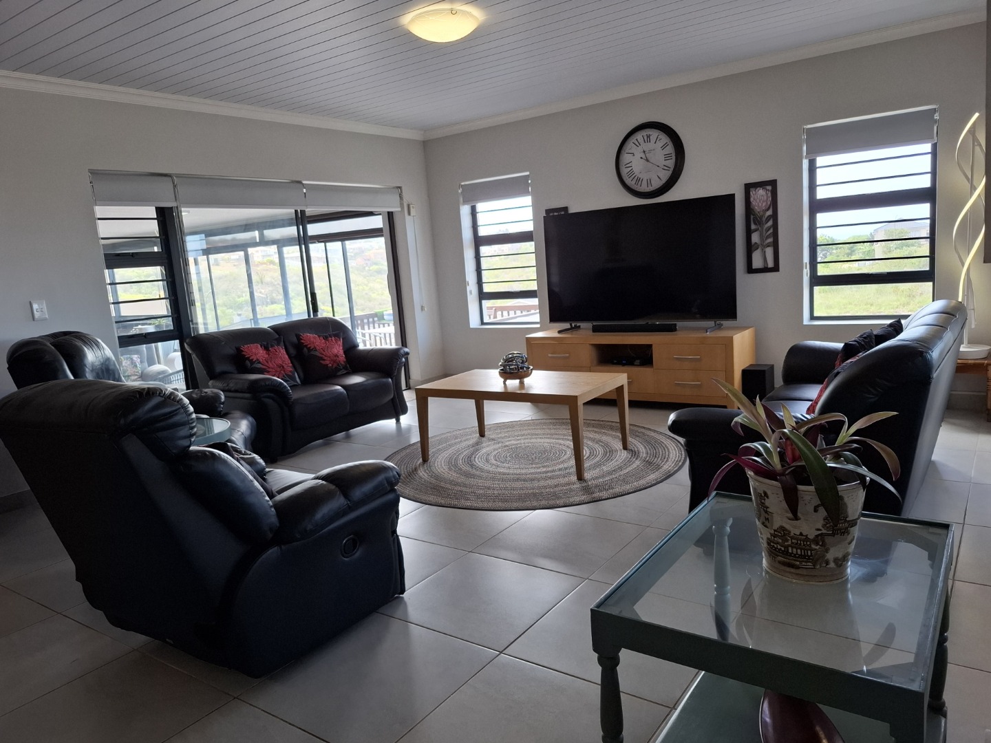 Step inside to an open-plan living environment, bathed in abundant natural light from large windows and sliding doors. The spacious lounge and dining areas boast easy-to-maintain tiled flooring and a distinctive wood-paneled ceiling, creating an airy atmosphere. From these living spaces, enjoy panoramic views that include distant ocean vistas, seamlessly blending indoor comfort with the beauty of the surrounding landscape.