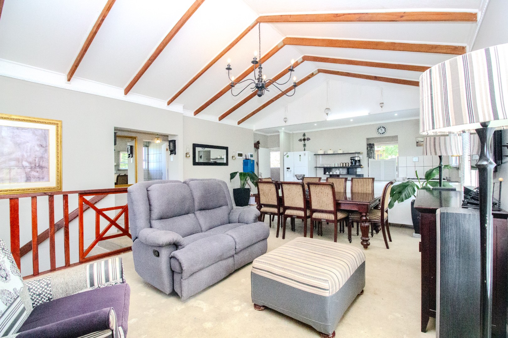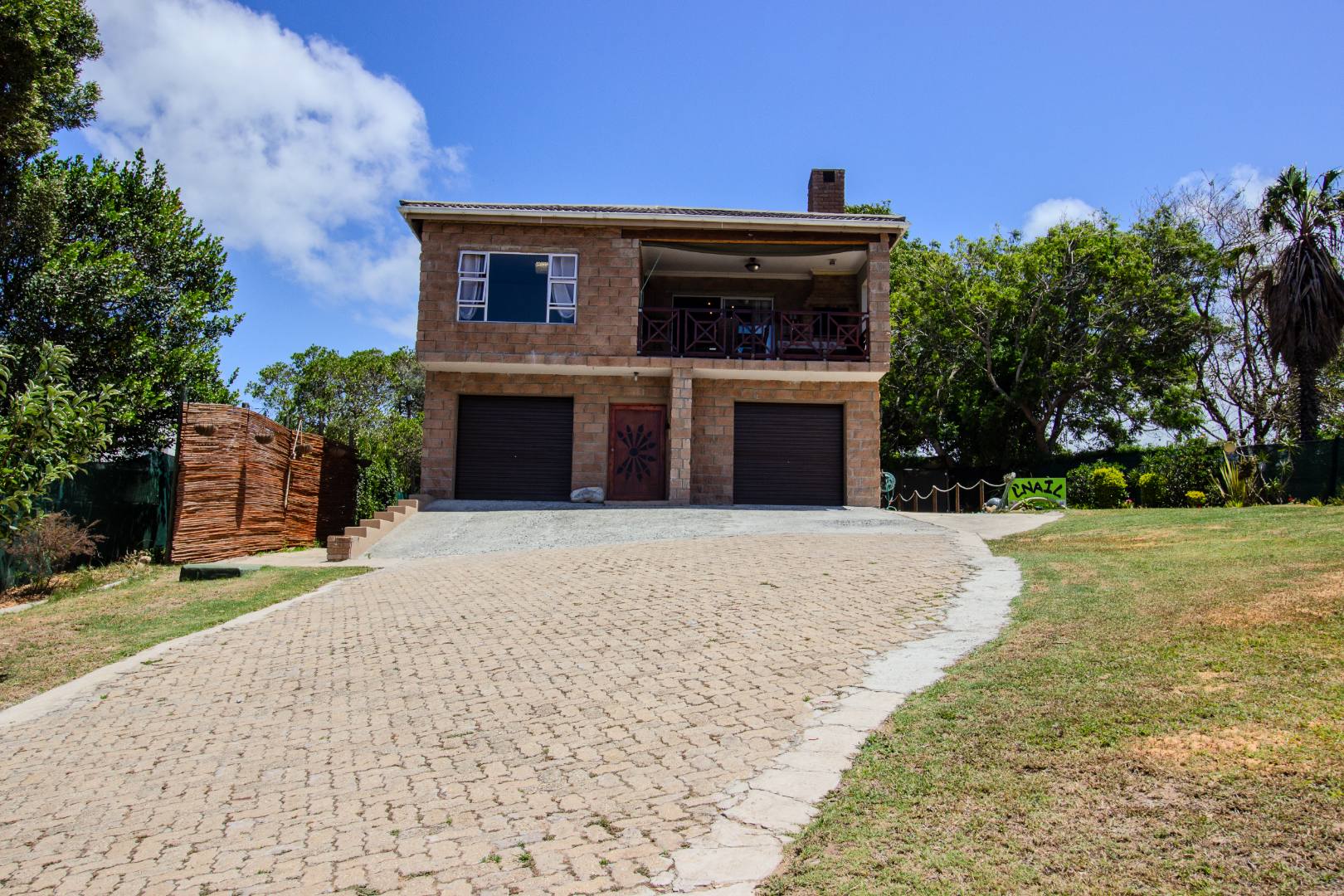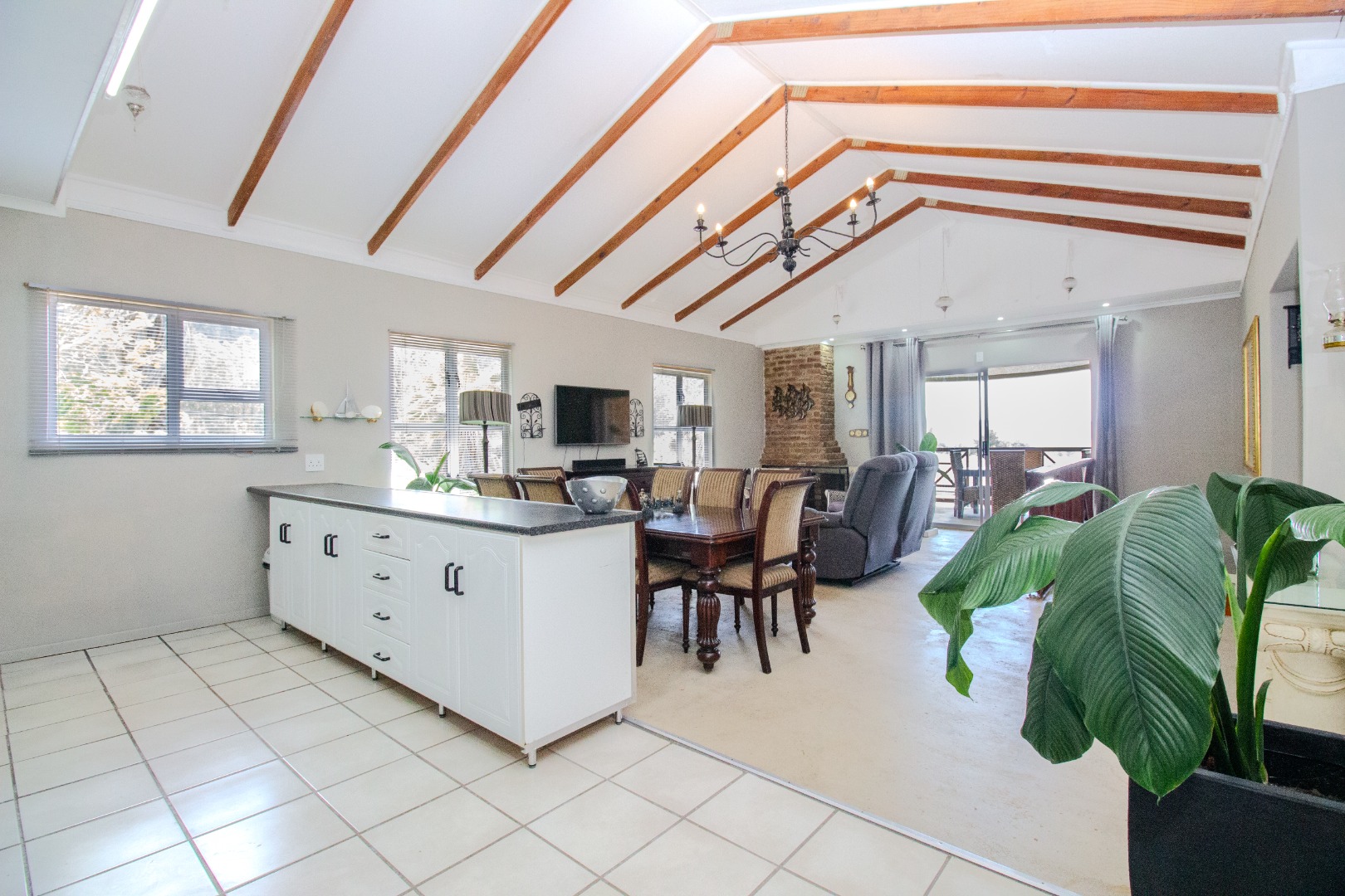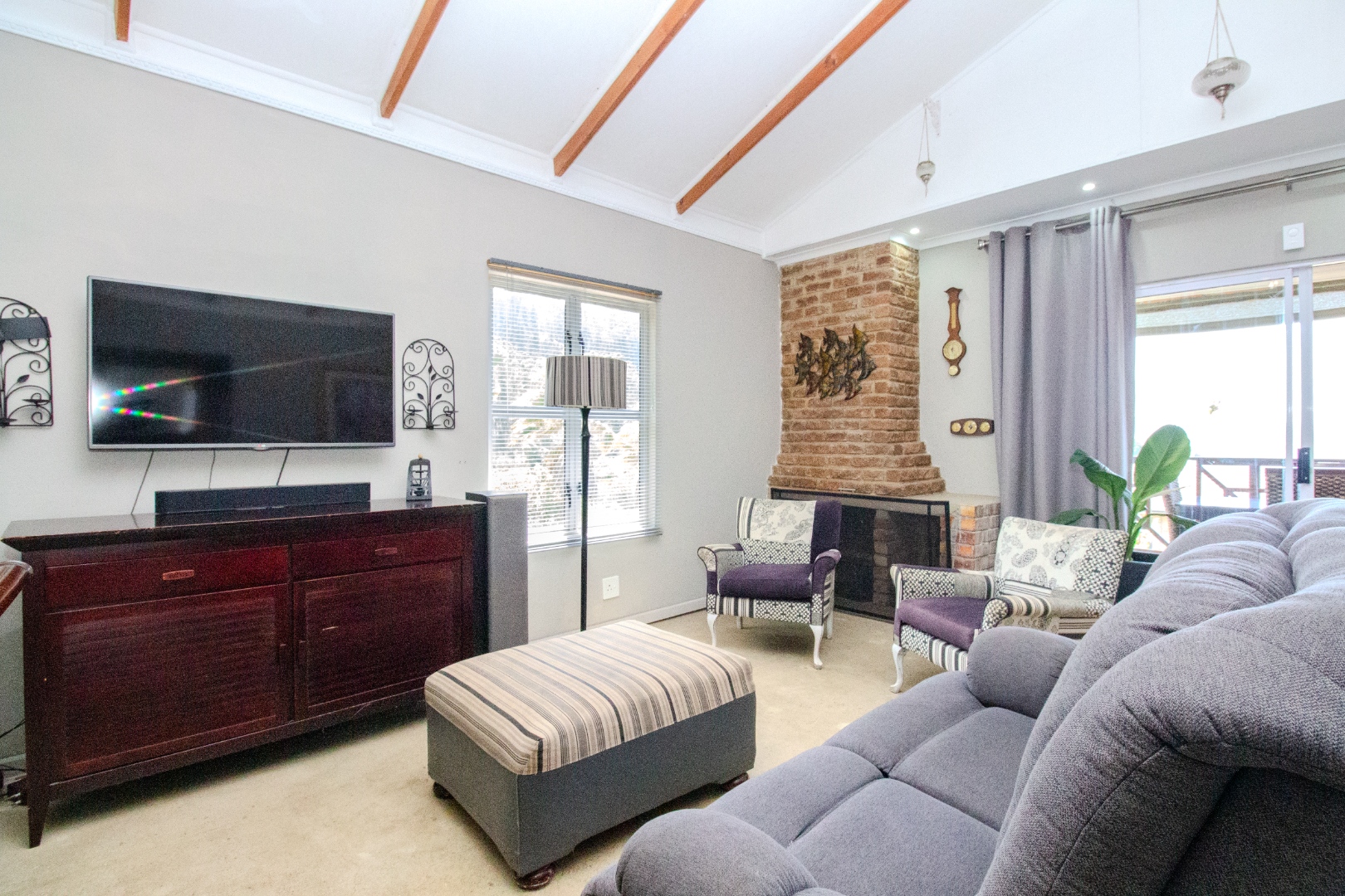 This inviting 4-bedroom, 3-bathroom residence in Groenvallei, Sedgefield, offers a spacious and comfortable living experience. The property presents a durable stone and brick exterior, complemented by a concrete driveway and a mature tree enhancing its curb appeal. A private balcony adds an appealing architectural detail to the facade. Step inside to discover an expansive open-plan living, dining, and kitchen area, characterized by striking vaulted ceilings with exposed wooden beams that create an airy and bright atmosphere. Large windows and sliding glass doors ensure ample natural light throughout the main living spaces, which also feature a cozy fireplace. The functional kitchen seamlessly integrates with the dining area, perfect for entertaining. Additionally, the home includes a dedicated family TV room and a study, providing versatile spaces for relaxation and work. The four well-proportioned bedrooms and three bathrooms, including one ensuite, offer comfortable accommodation for families. Outdoor living is a highlight, with a covered patio featuring a built-in braai, ideal for enjoying the scenic views. The property boasts a well-maintained garden with an irrigation system and water tanks, ensuring lush surroundings. Practical amenities include a double garage, a laundry room, and ample storage. Security is enhanced by a fully fenced and totally walled perimeter with an access gate. The home also benefits from a battery inverter, providing essential backup power. Groenvallei is a desirable suburban area in Sedgefield, known for its coastal beach proximity and tranquil environment. This location offers a blend of natural beauty and convenient living. Key Features: * 4 Bedrooms, 3 Bathrooms (1 En-suite) * Open-Plan Living, Dining & Kitchen * Vaulted Ceilings with Exposed Beams * Built-in Braai & Covered Patio * Double Garage * Study & Family TV Room * Scenic Views * Battery Inverter * Garden with Irrigation & Water Tanks