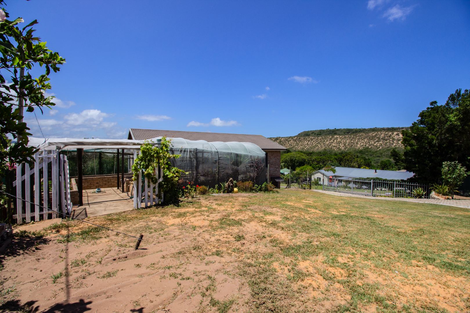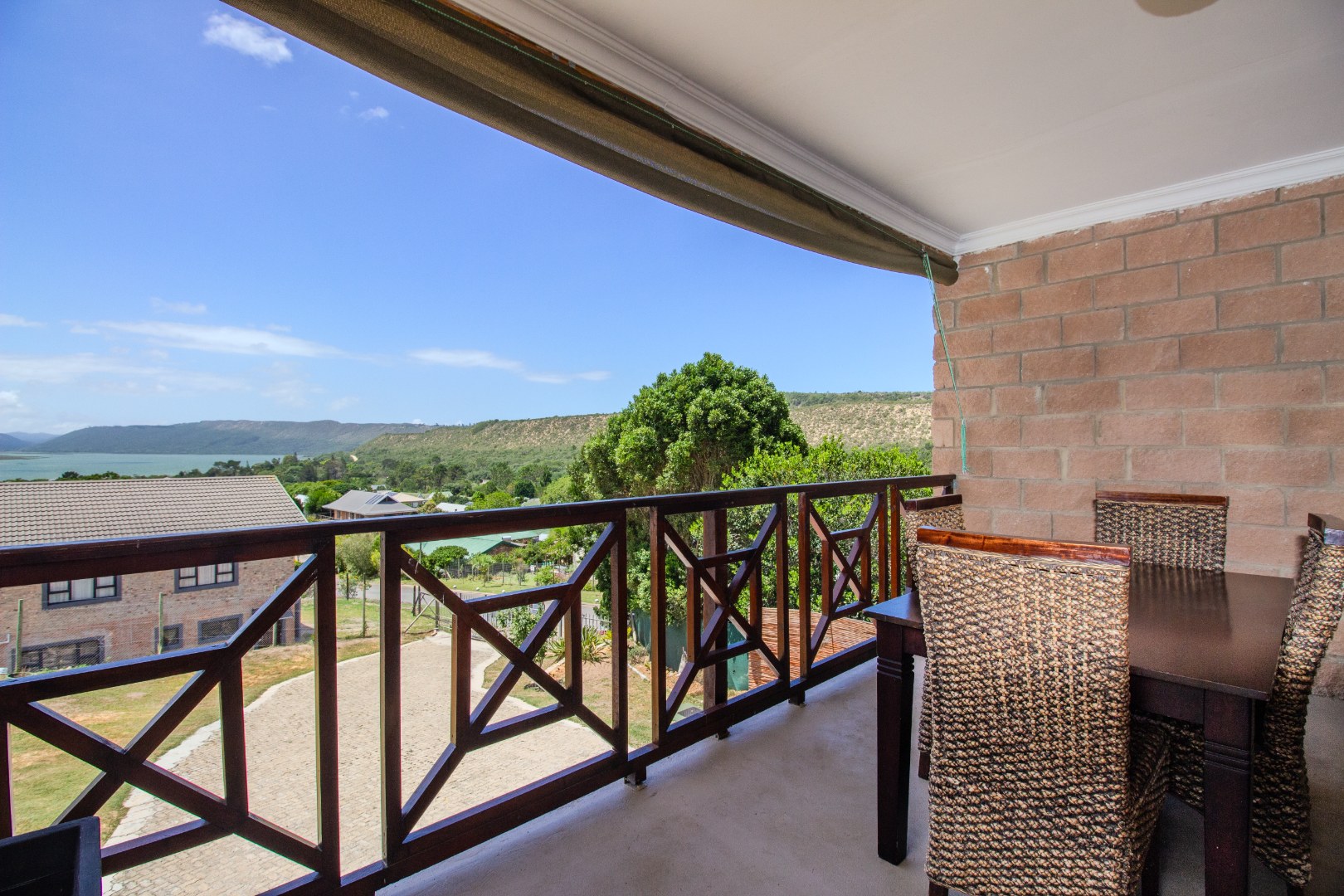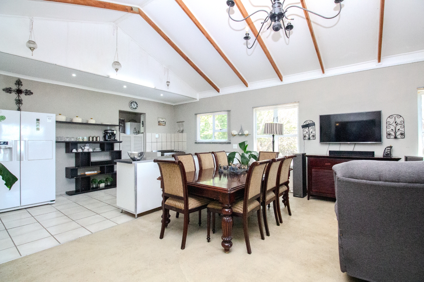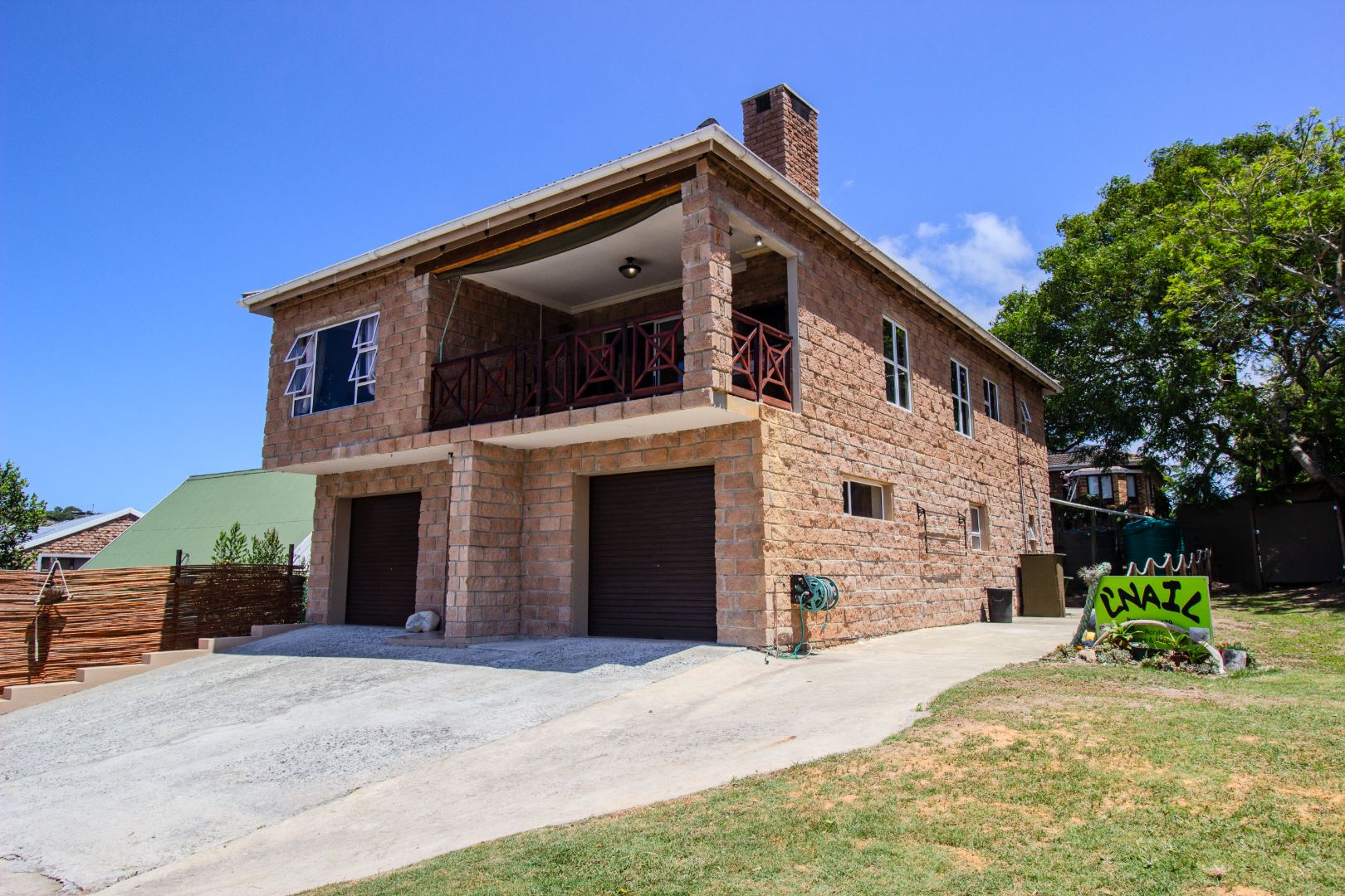 This inviting 4-bedroom, 3-bathroom residence in Groenvallei, Sedgefield, offers a spacious and comfortable living experience. The property presents a durable stone and brick exterior, complemented by a concrete driveway and a mature tree enhancing its curb appeal. A private balcony adds an appealing architectural detail to the facade. Step inside to discover an expansive open-plan living, dining, and kitchen area, characterized by striking vaulted ceilings with exposed wooden beams that create an airy and bright atmosphere. Large windows and sliding glass doors ensure ample natural light throughout the main living spaces, which also feature a cozy fireplace. The functional kitchen seamlessly integrates with the dining area, perfect for entertaining. Additionally, the home includes a dedicated family TV room and a study, providing versatile spaces for relaxation and work. The four well-proportioned bedrooms and three bathrooms, including one ensuite, offer comfortable accommodation for families. Outdoor living is a highlight, with a covered patio featuring a built-in braai, ideal for enjoying the scenic views. The property boasts a well-maintained garden with an irrigation system and water tanks, ensuring lush surroundings. Practical amenities include a double garage, a laundry room, and ample storage. Security is enhanced by a fully fenced and totally walled perimeter with an access gate. The home also benefits from a battery inverter, providing essential backup power. Groenvallei is a desirable suburban area in Sedgefield, known for its coastal beach proximity and tranquil environment. This location offers a blend of natural beauty and convenient living. Key Features: * 4 Bedrooms, 3 Bathrooms (1 En-suite) * Open-Plan Living, Dining & Kitchen * Vaulted Ceilings with Exposed Beams * Built-in Braai & Covered Patio * Double Garage * Study & Family TV Room * Scenic Views * Battery Inverter * Garden with Irrigation & Water Tanks
