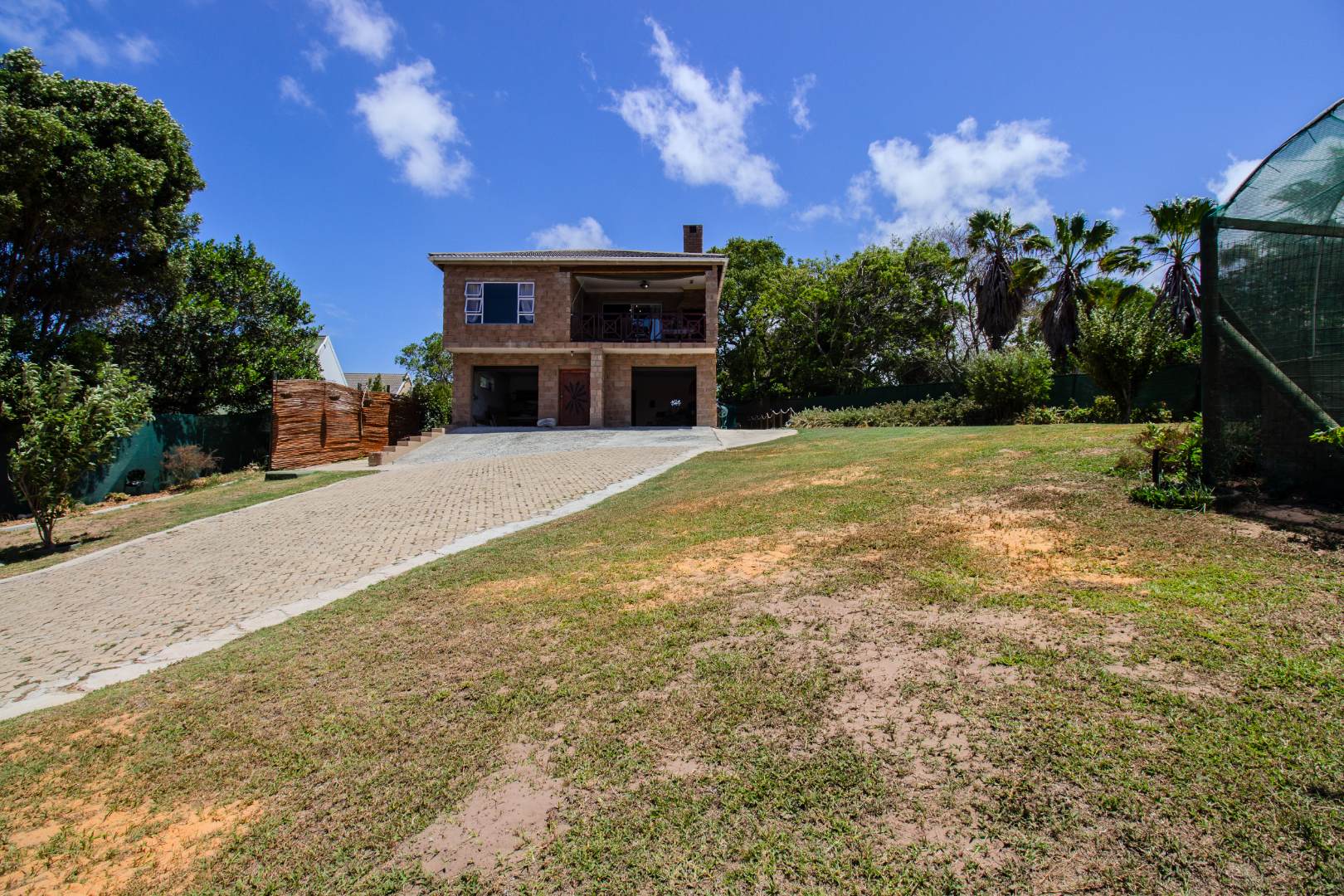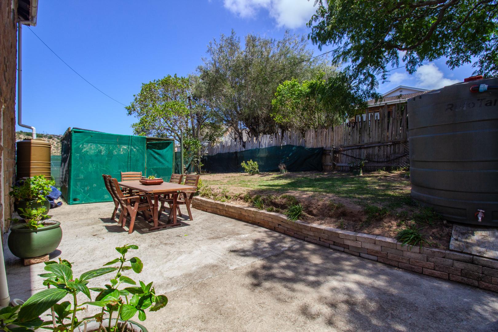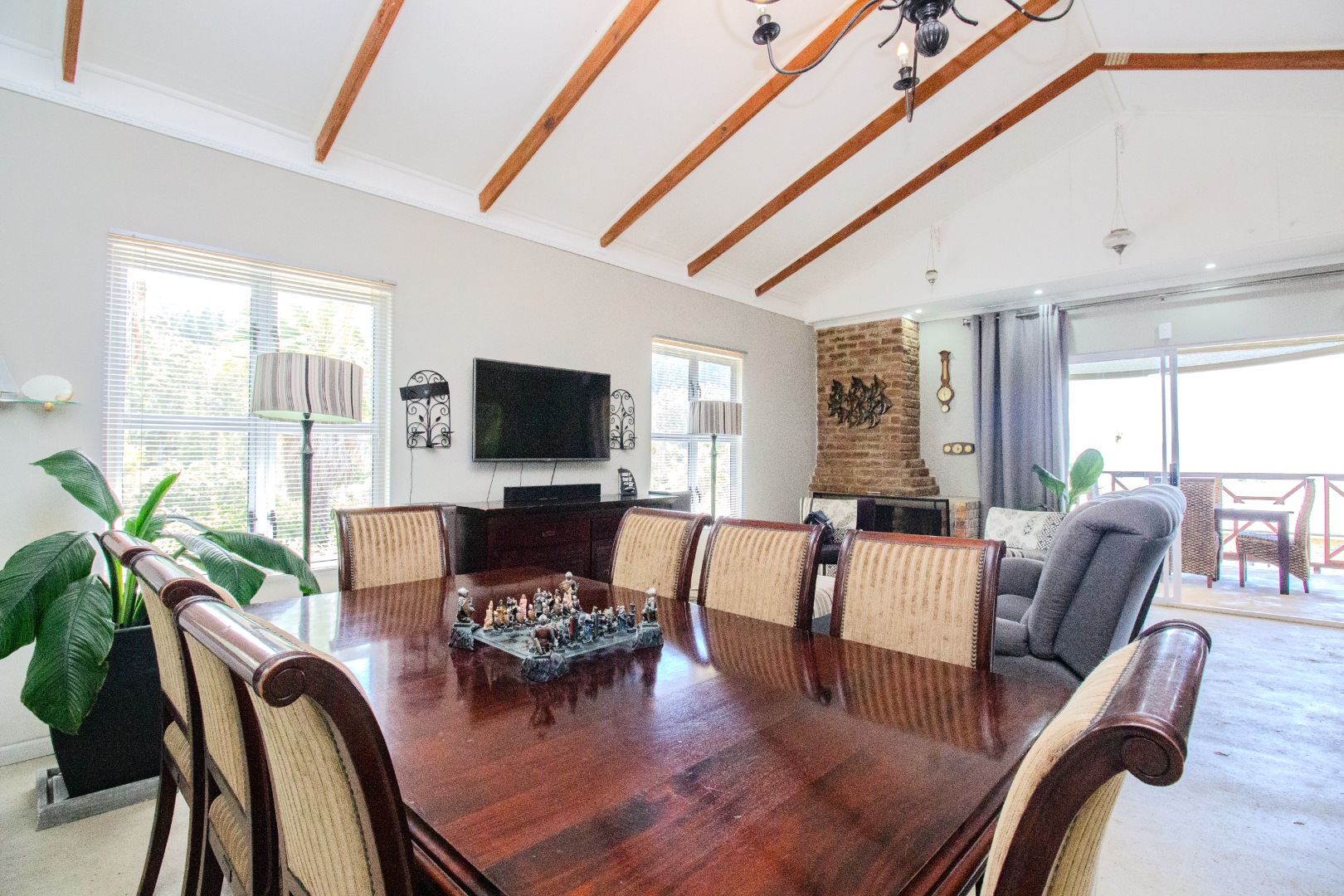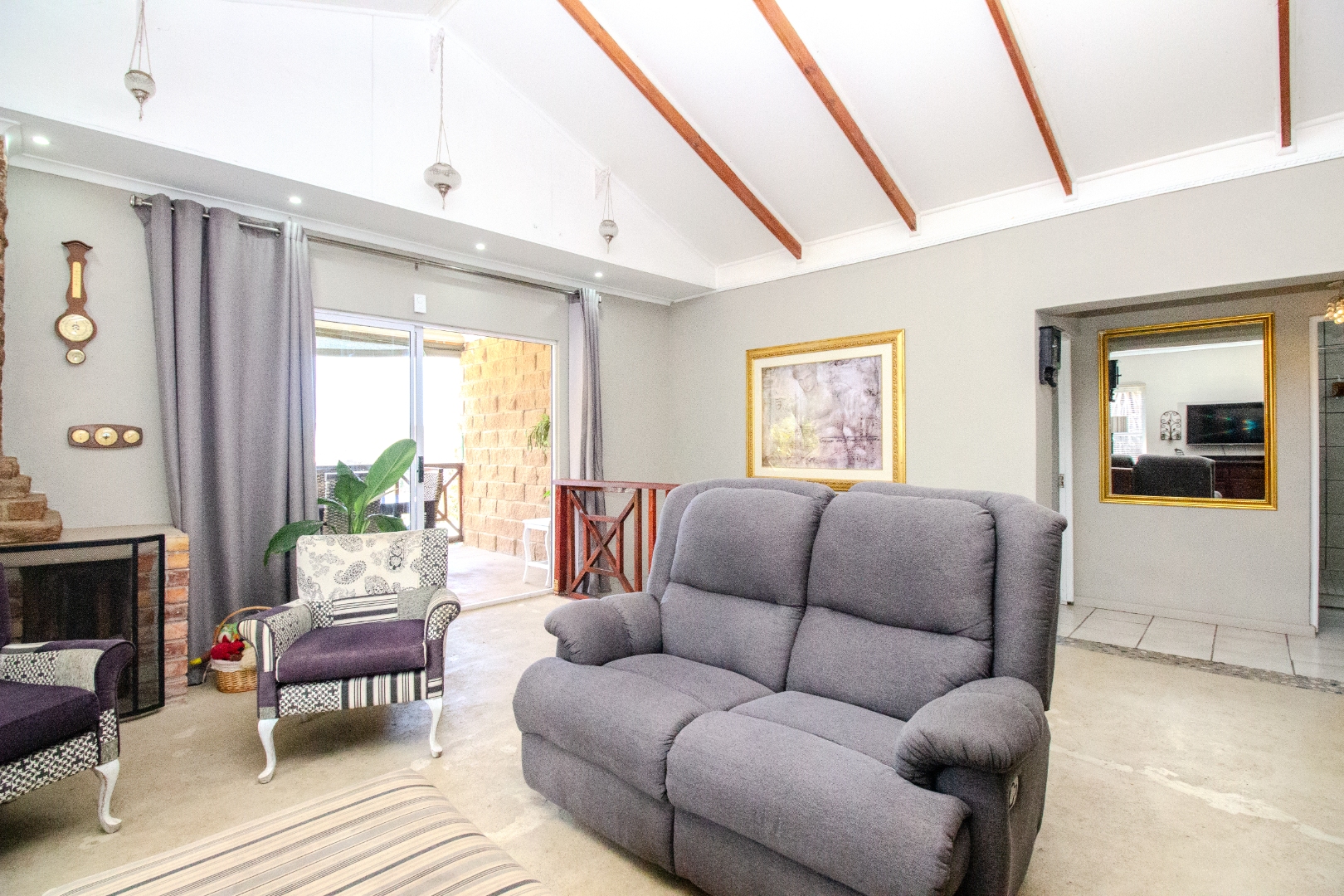 This inviting 4-bedroom, 3-bathroom residence in Groenvallei, Sedgefield, offers a spacious and comfortable living experience. The property presents a durable stone and brick exterior, complemented by a concrete driveway and a mature tree enhancing its curb appeal. A private balcony adds an appealing architectural detail to the facade. Step inside to discover an expansive open-plan living, dining, and kitchen area, characterized by striking vaulted ceilings with exposed wooden beams that create an airy and bright atmosphere. Large windows and sliding glass doors ensure ample natural light throughout the main living spaces, which also feature a cozy fireplace. The functional kitchen seamlessly integrates with the dining area, perfect for entertaining. Additionally, the home includes a dedicated family TV room and a study, providing versatile spaces for relaxation and work. The four well-proportioned bedrooms and three bathrooms, including one ensuite, offer comfortable accommodation for families. Outdoor living is a highlight, with a covered patio featuring a built-in braai, ideal for enjoying the scenic views. The property boasts a well-maintained garden with an irrigation system and water tanks, ensuring lush surroundings. Practical amenities include a double garage, a laundry room, and ample storage. Security is enhanced by a fully fenced and totally walled perimeter with an access gate. The home also benefits from a battery inverter, providing essential backup power. Groenvallei is a desirable suburban area in Sedgefield, known for its coastal beach proximity and tranquil environment. This location offers a blend of natural beauty and convenient living. Key Features: * 4 Bedrooms, 3 Bathrooms (1 En-suite) * Open-Plan Living, Dining & Kitchen * Vaulted Ceilings with Exposed Beams * Built-in Braai & Covered Patio * Double Garage * Study & Family TV Room * Scenic Views * Battery Inverter * Garden with Irrigation & Water Tanks